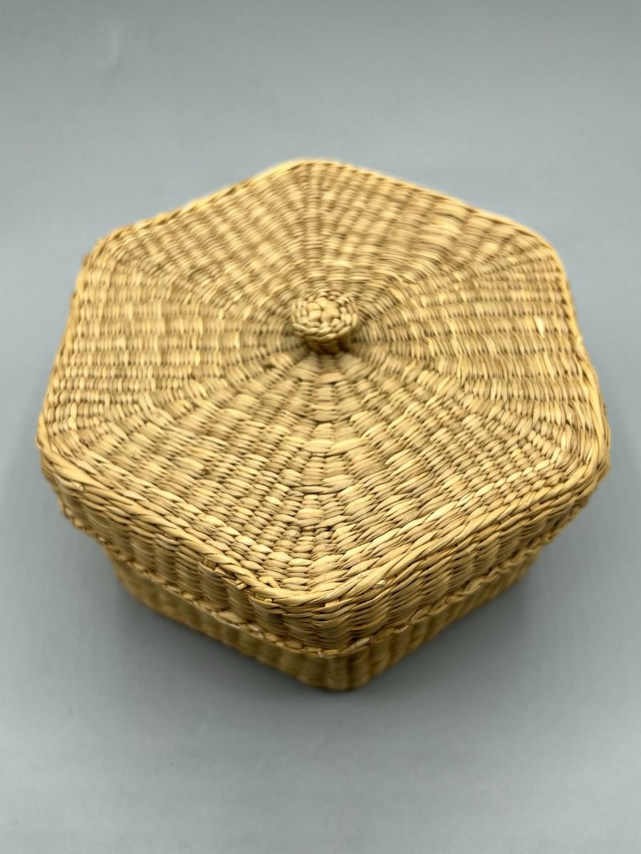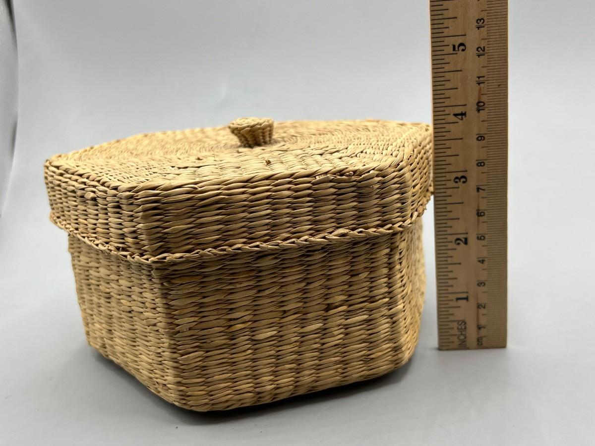 Small Natural Fiber Woven Straw Fiber Trinket Box with Lid. In good condition. About 5" size.