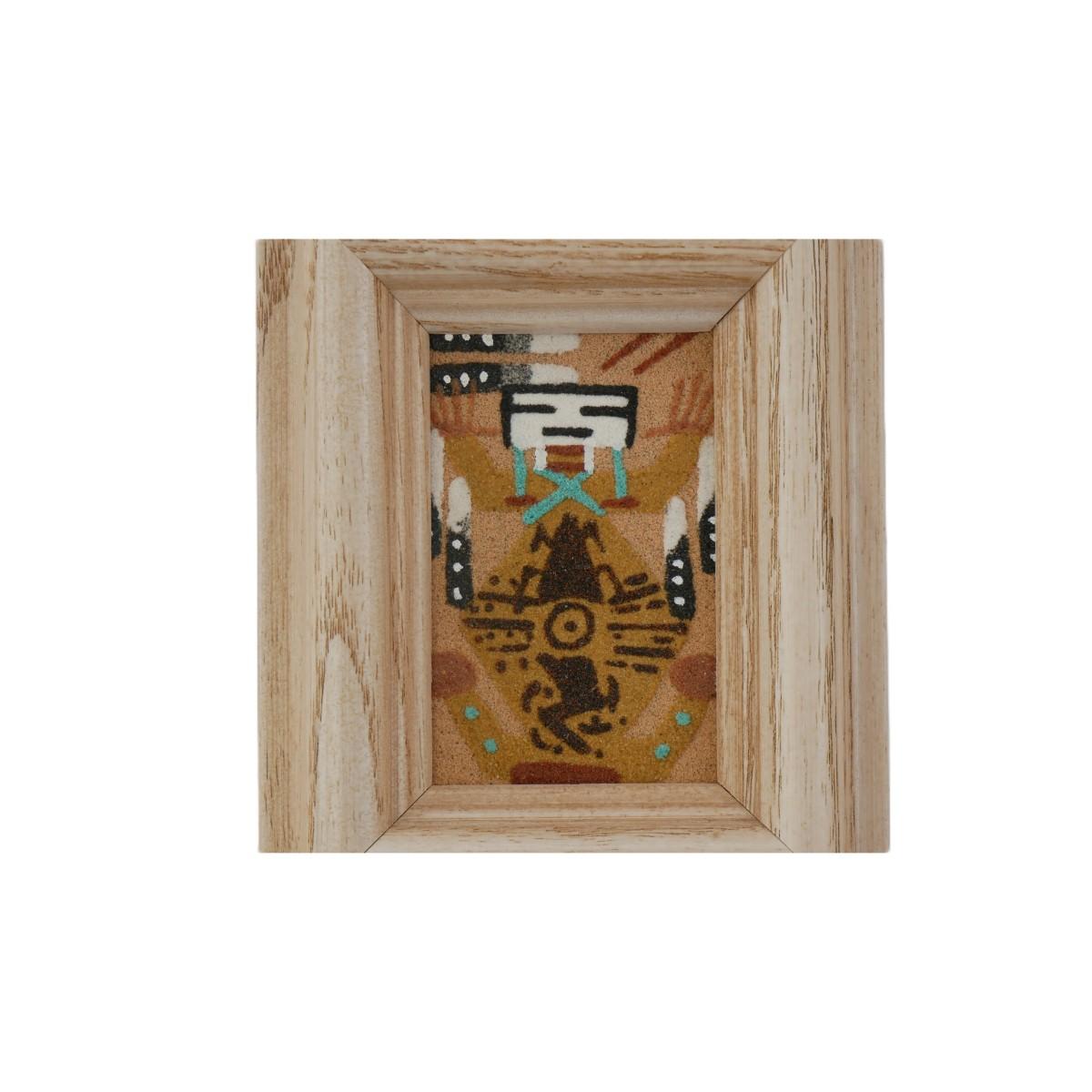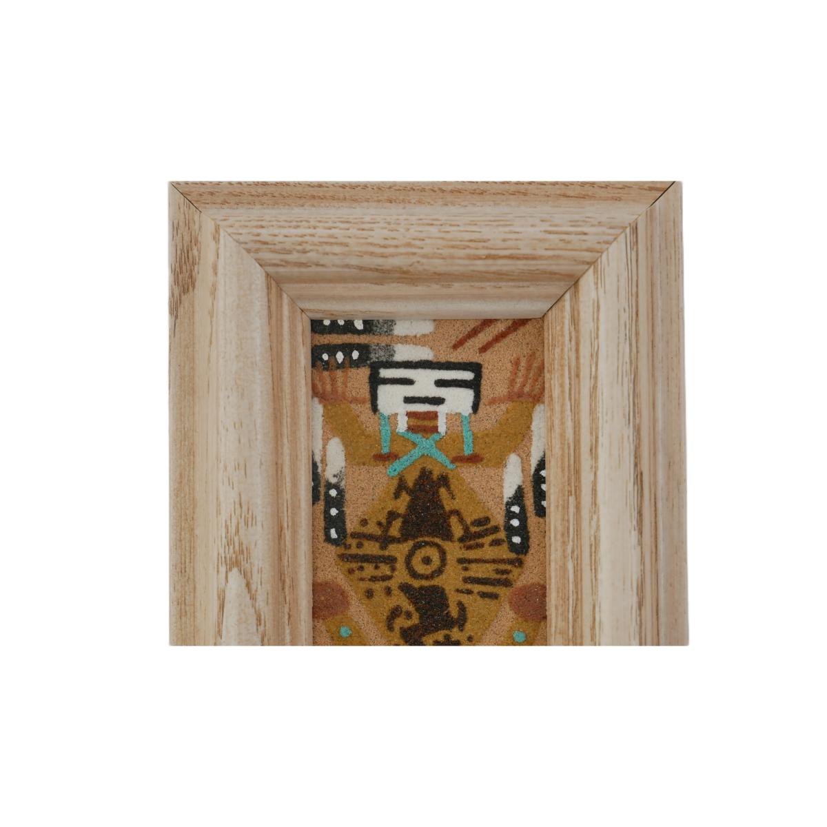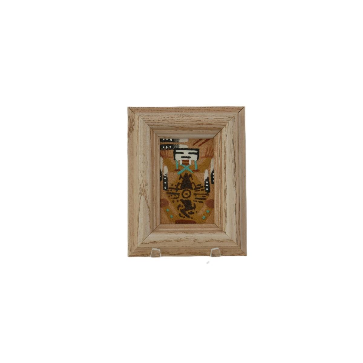 Small framed Navajo Native American sand art painting. Unmarked, unsigned. Excellent condition. Art measures approximately L 1.5" x H 2.5", frame measures L 3.5" x H 4.5" x D 0.75". Weighs 3.3 oz. Stand not included. (A1)