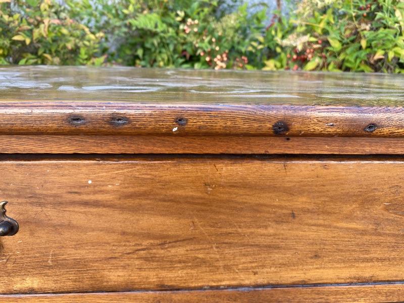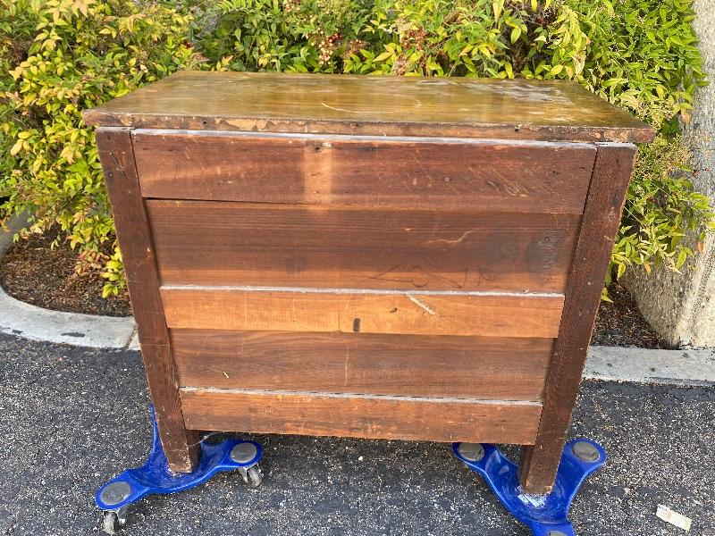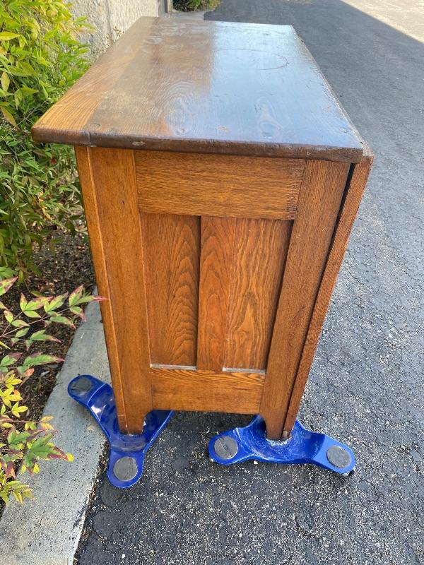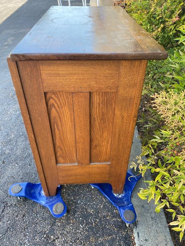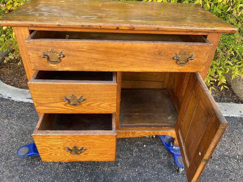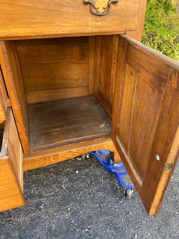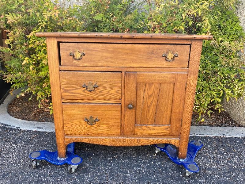 Small oak sideboard or dresser. Features three drawers, one full length & two half that size, and a small cabinet taking up the other half of front. Needs a little work, either refinished or painted. Sturdy, solid wood. Measures 32"x17" and is 28" tall.