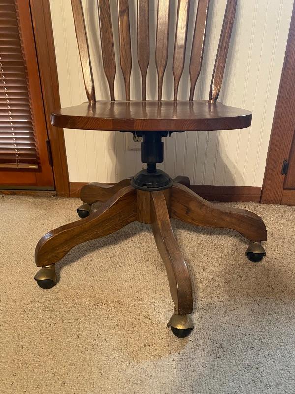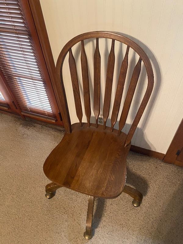 Small oak desk chair. Medium finish. Swivel seat on 5 wheels. 17.5” at the seat, 38.5” top of back. Good condition.