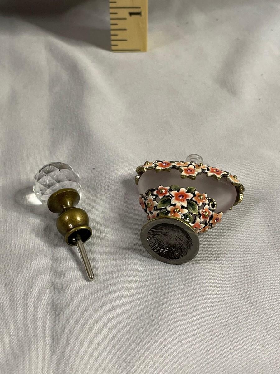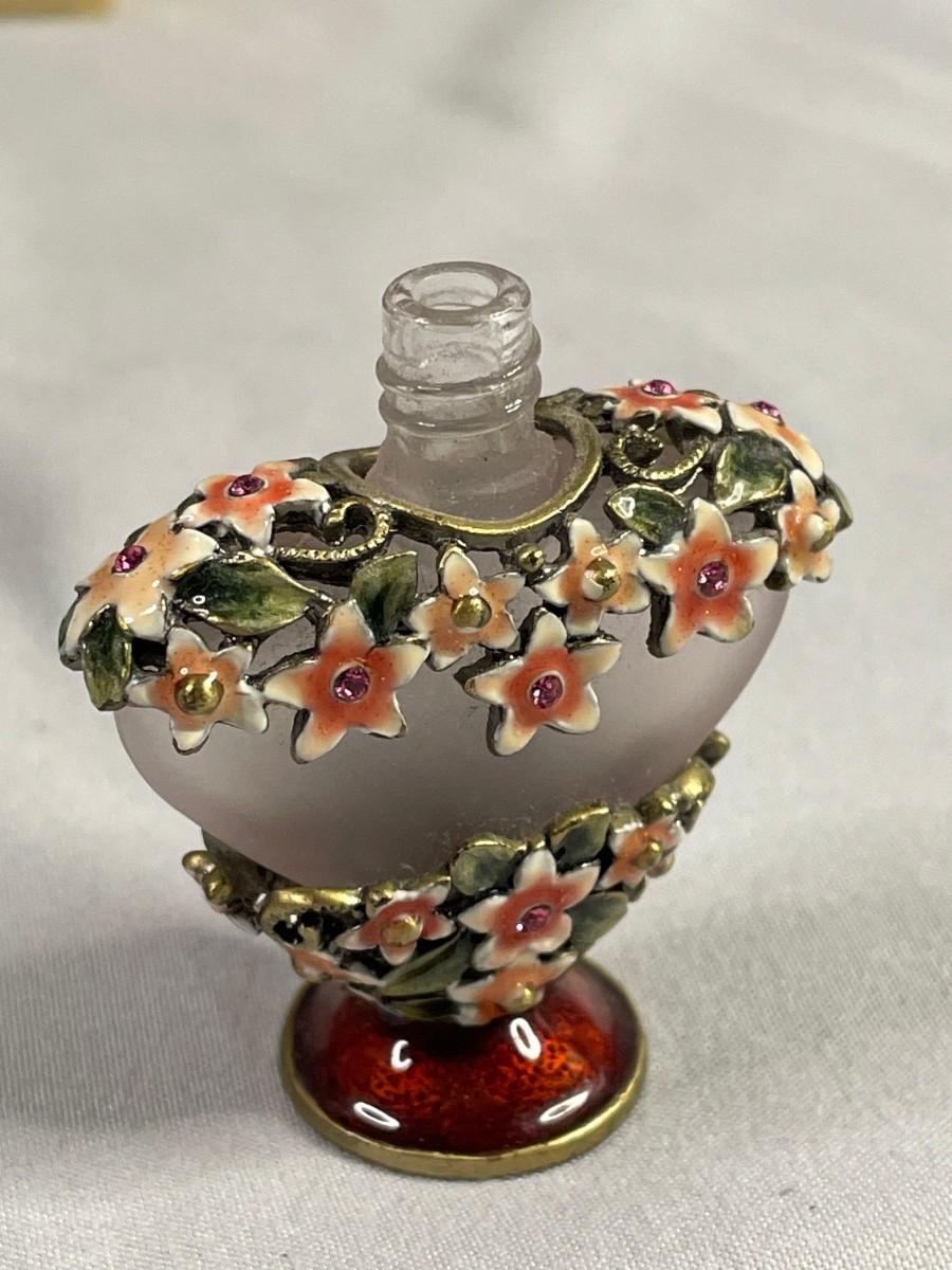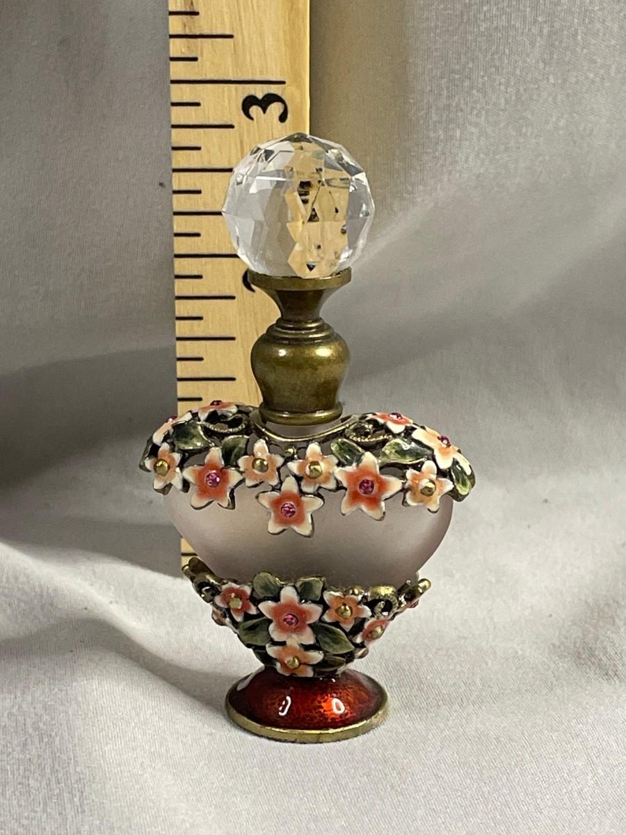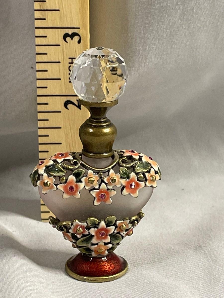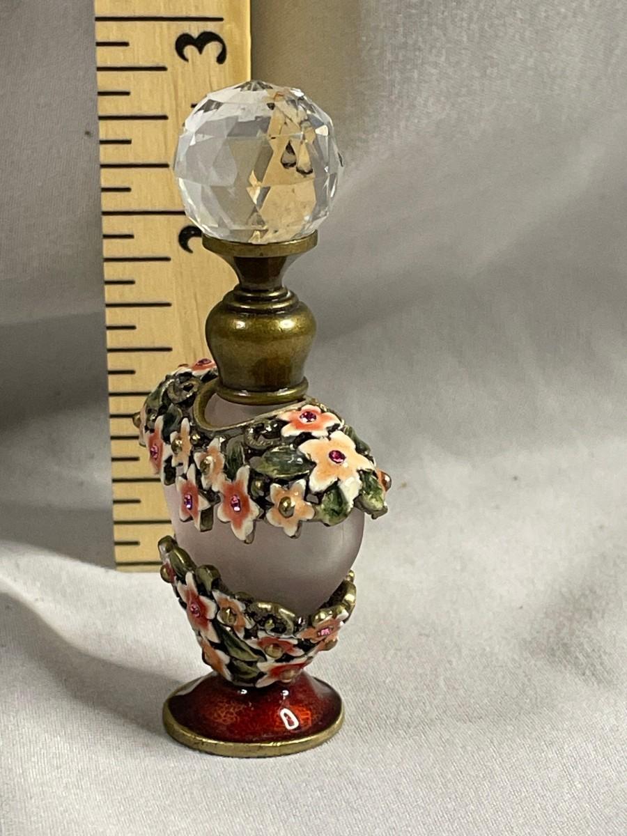 This is a pretty perfume bottle that has a cloisonne like overlay on a glass bottle. The top screws on and off and there are not issues found.<br />