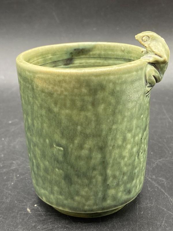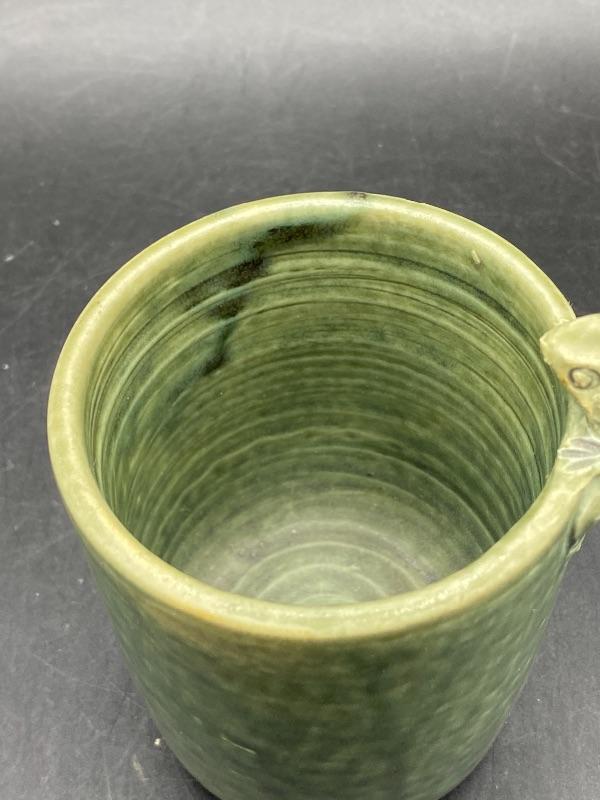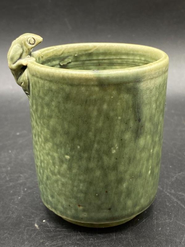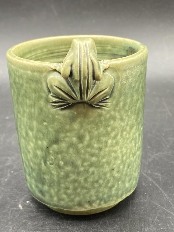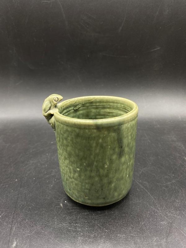 Small Majolica style cup. Pale green glazed pottery. Great as a small planter or on a desk as a pencil cup. Stands just over 4" at top of frog. Displays nicely, no chips.