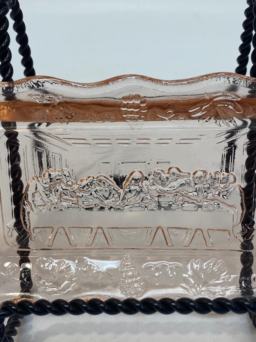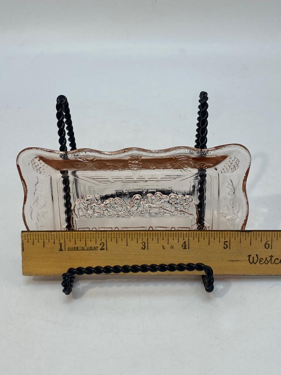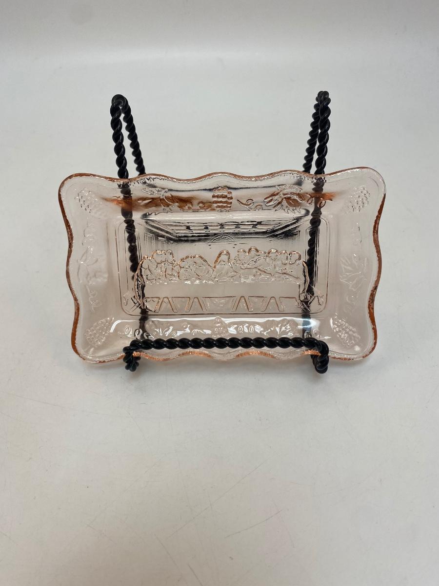 Small Pale Pink Last Supper Embossed Trinket Plate. Embossed pattern not very detailed. Good condition.