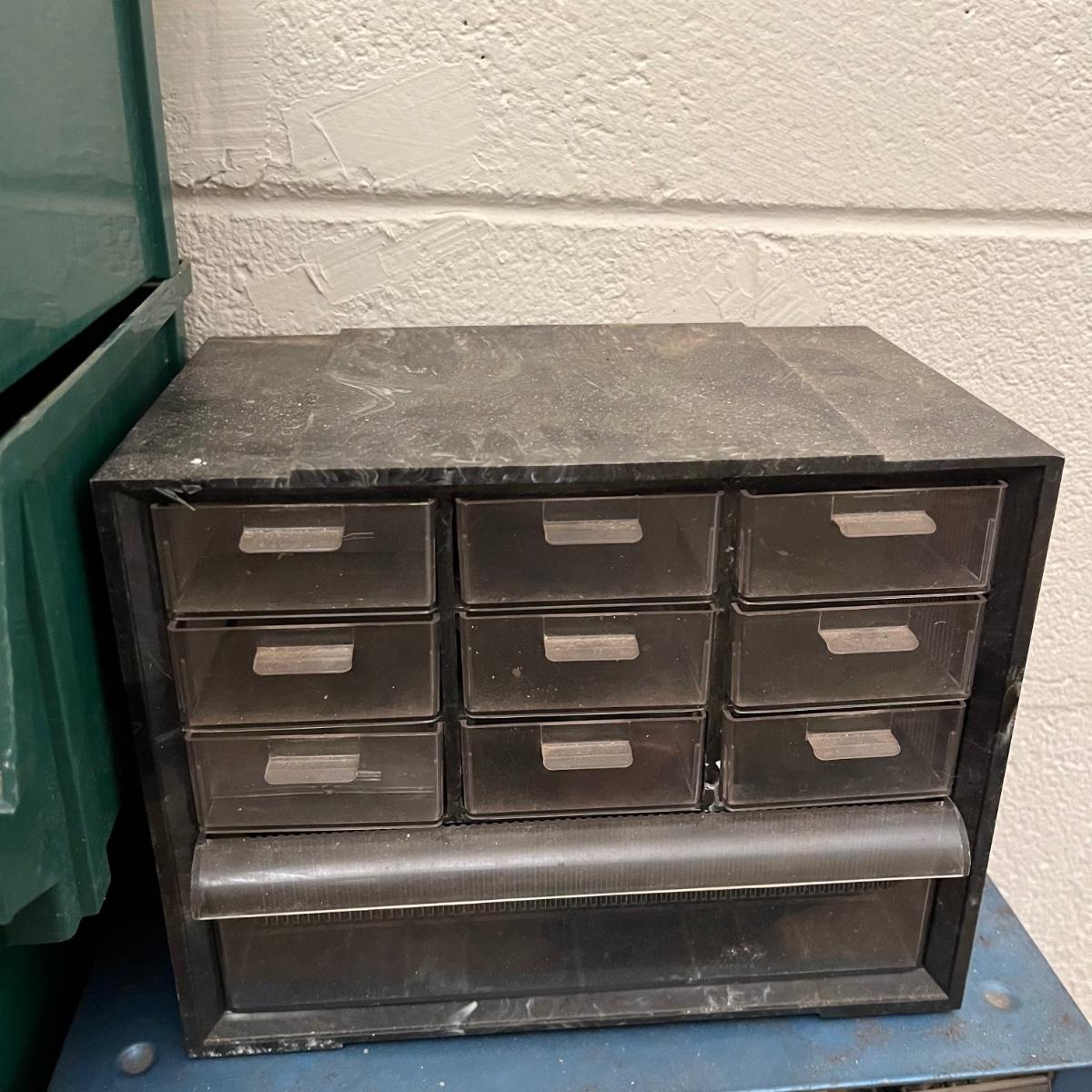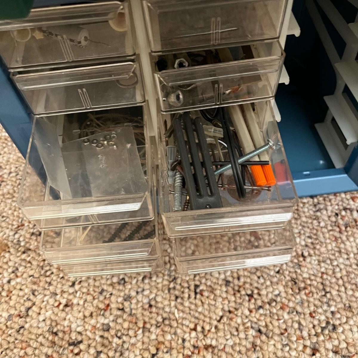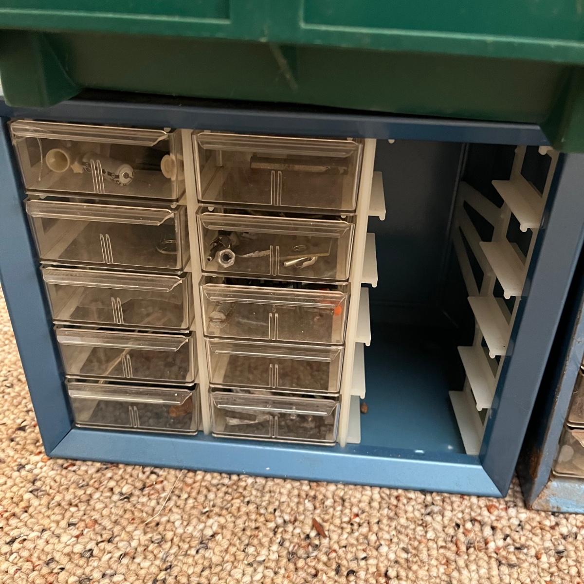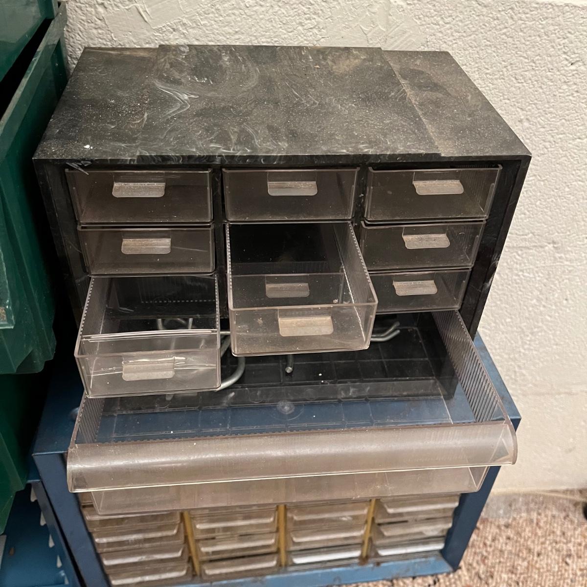 Lot includes three small parts storage bins with contents and five plastic hardware bins. One storage bin is missing five drawers. Largest storage bin measures 6” x 13” x 9.5”.