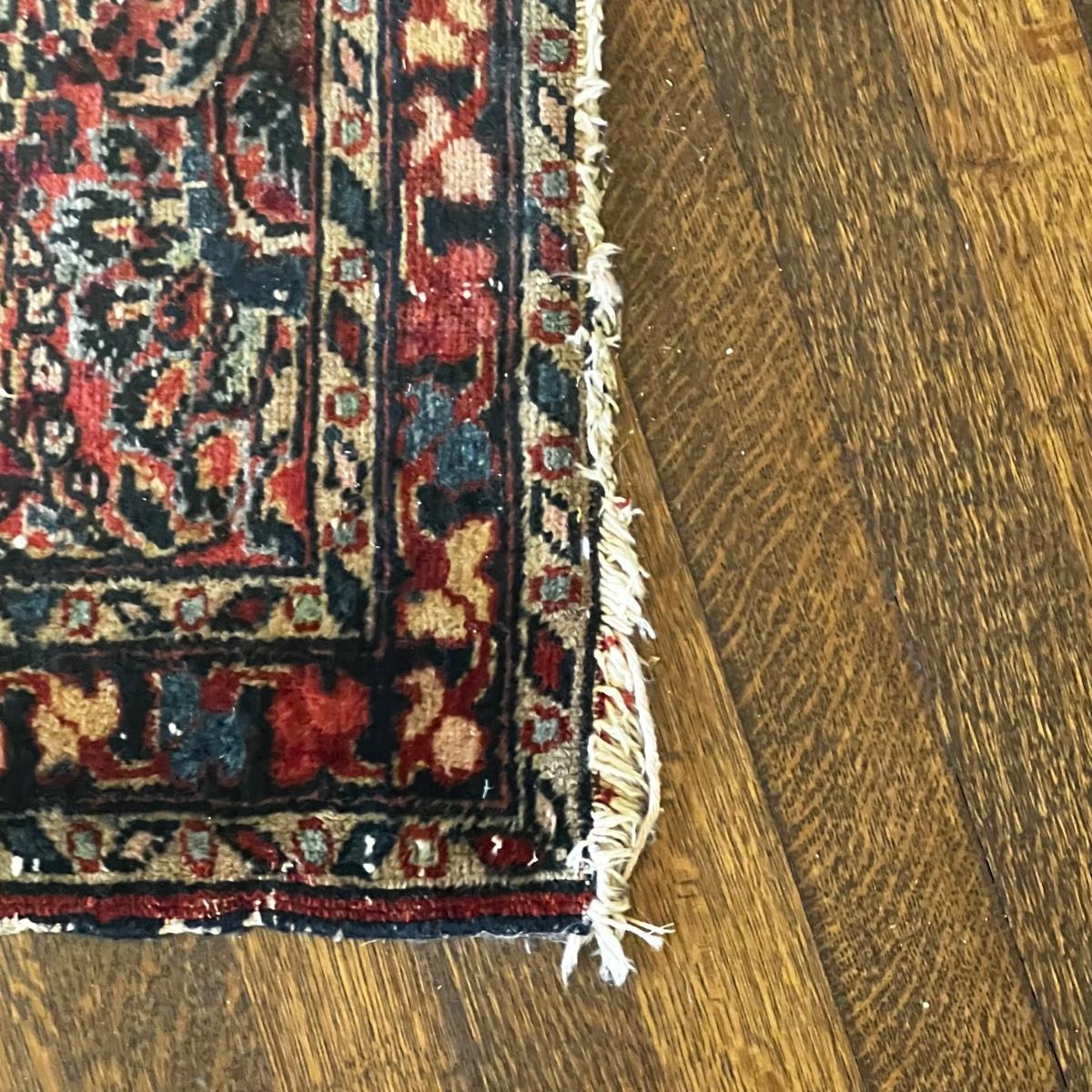 This small rug has no label but appears to be wool and hand knotted. The fringe and edges are fairly worn and the rug could use a good cleaning.