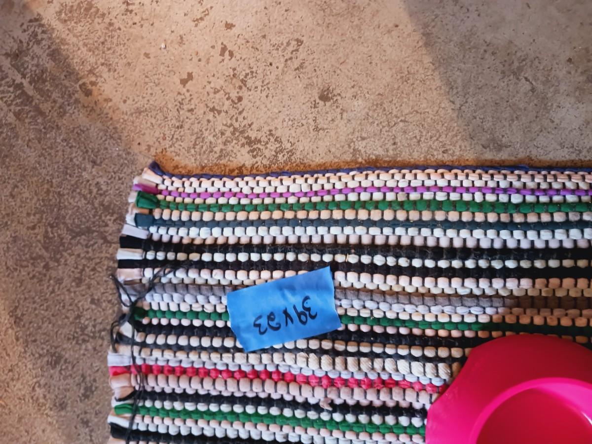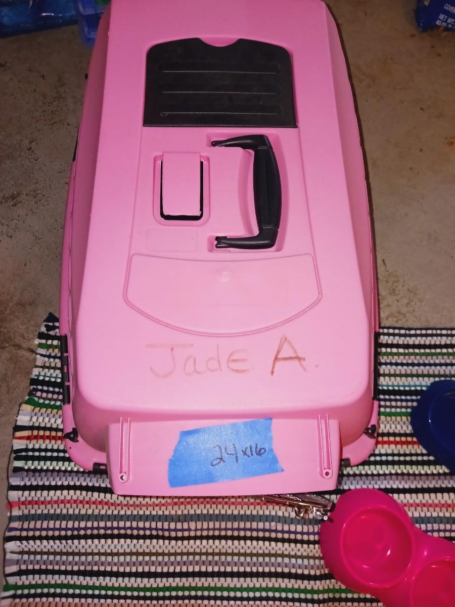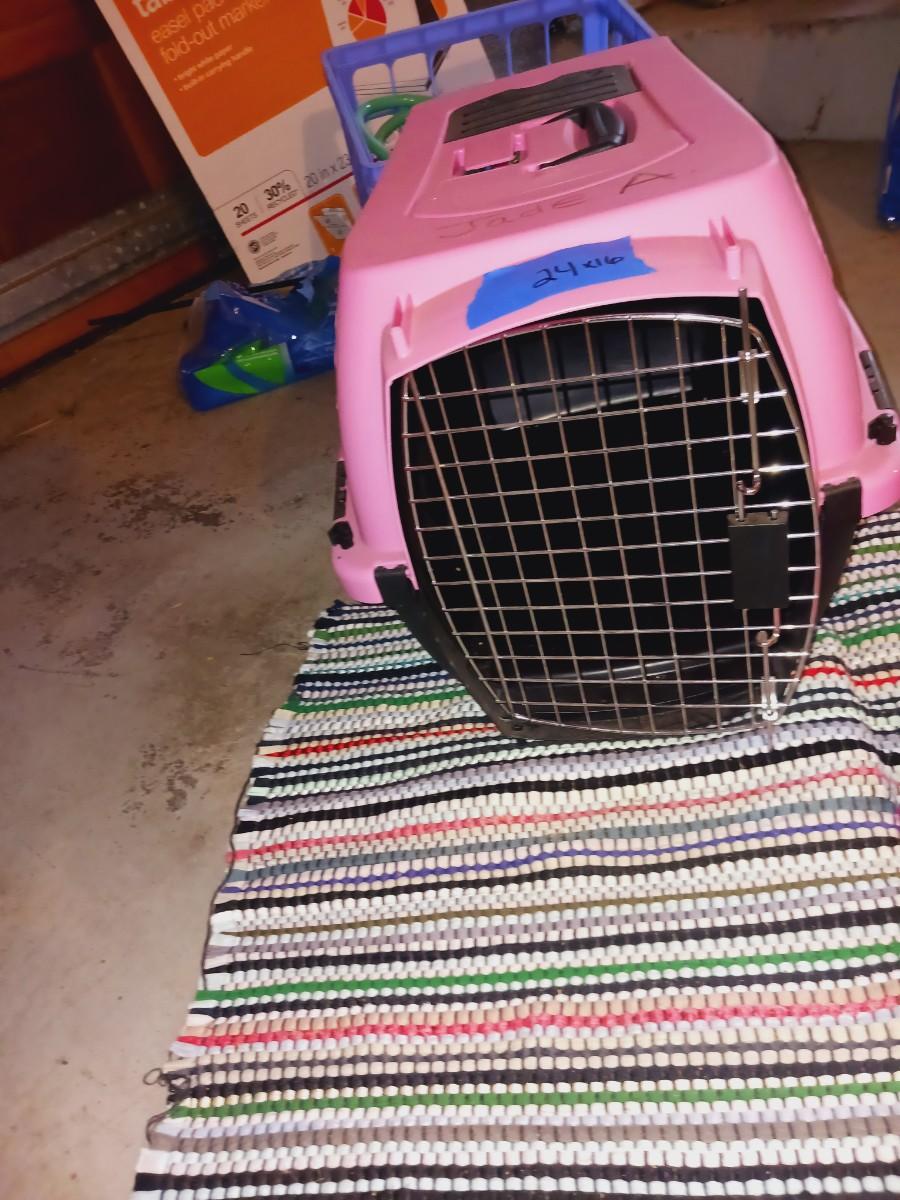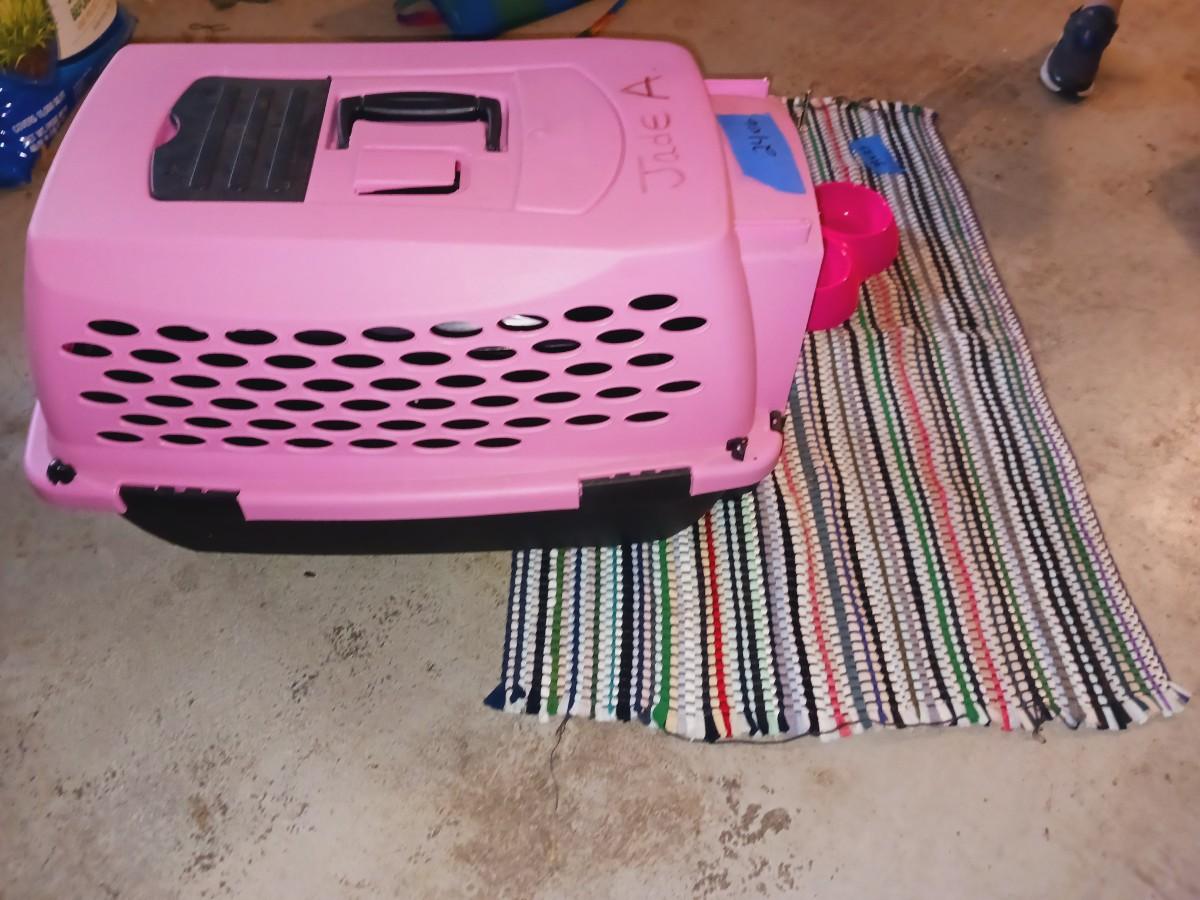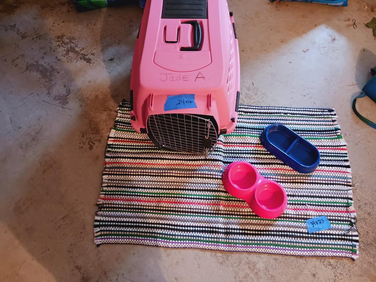 SMALL PET CARRIER, FOOD DISHES AND RAG RUG