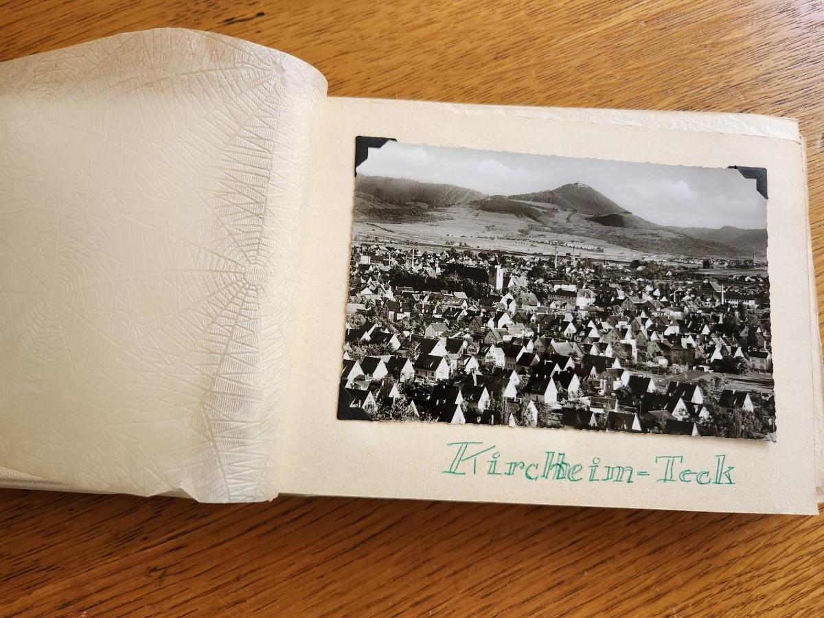 This auction lot is for a Small Photo Album of Kirchbeim, Germany. This album contains both photos and postcards from a family trip to Germany in the 1960s. Has about 14 of the 30 pages filled with interesting shots of family and the village.