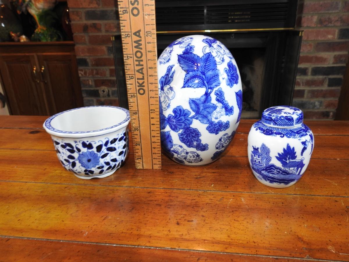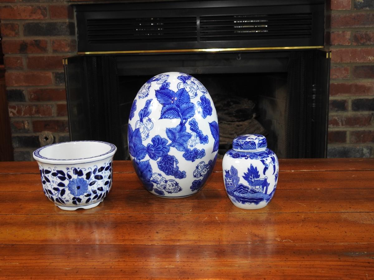 Nice trio of small indoor planter, cobalt blue and white floral egg, and small ginger spice jar. All in good used condition.