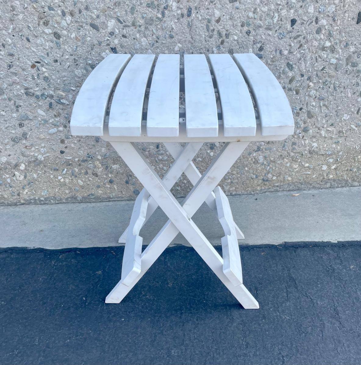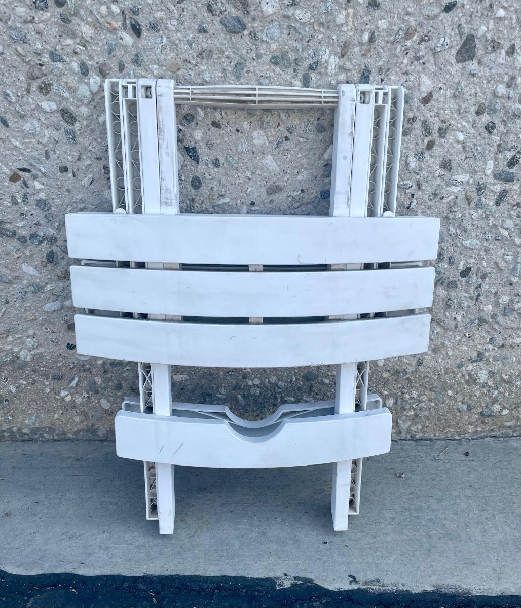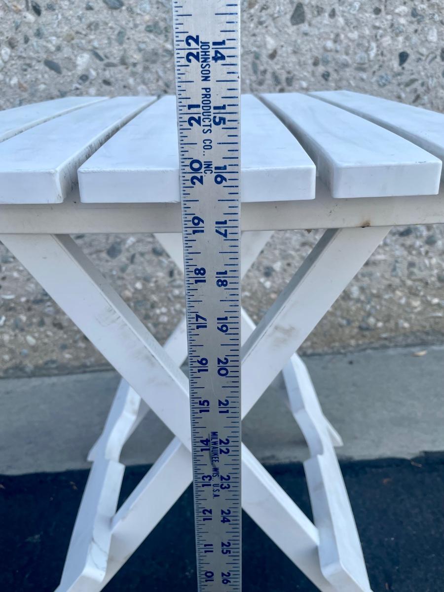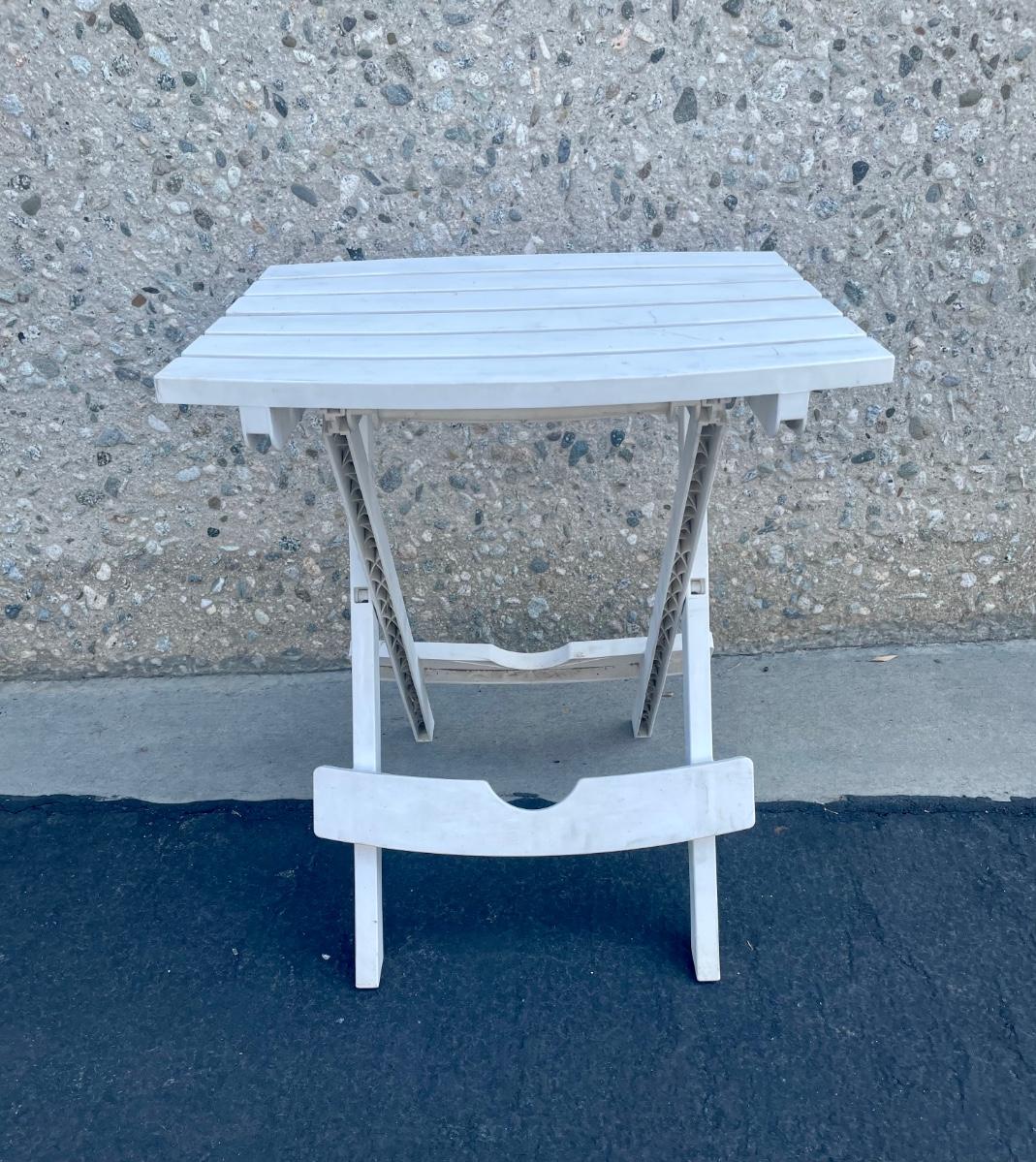 White plastic table folds flat for storage. Measures 15x17, is 20" tall. Previously used condition.