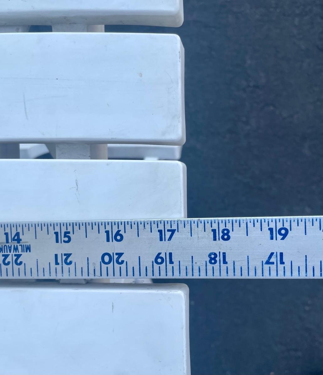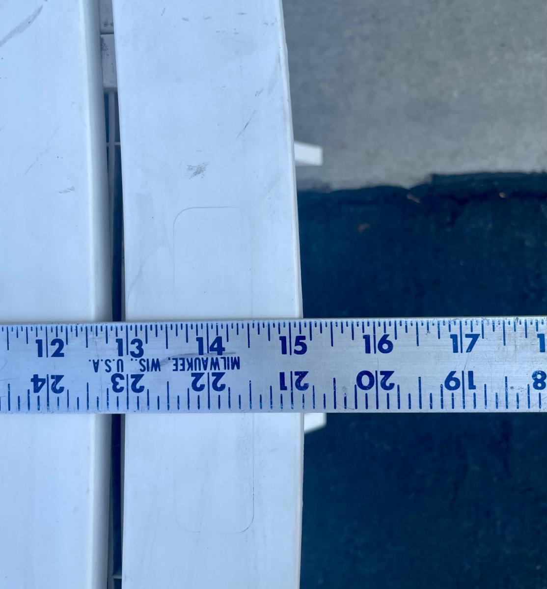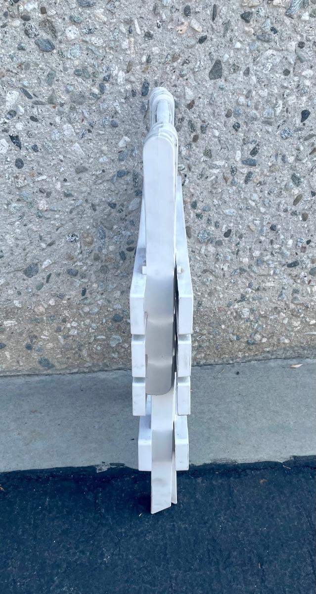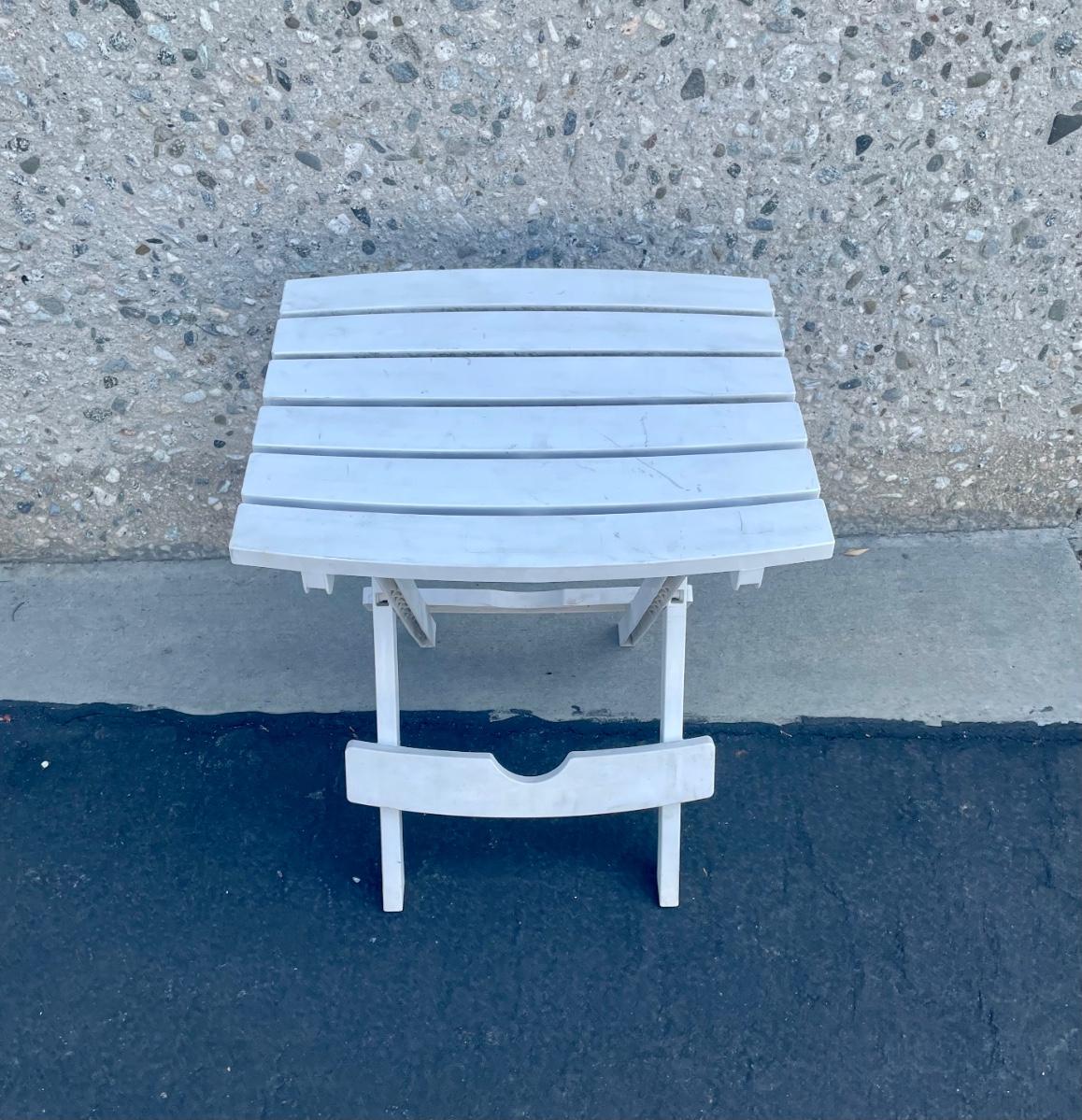 White plastic table folds flat for storage. Measures 15x17, is 20" tall. Previously used condition.