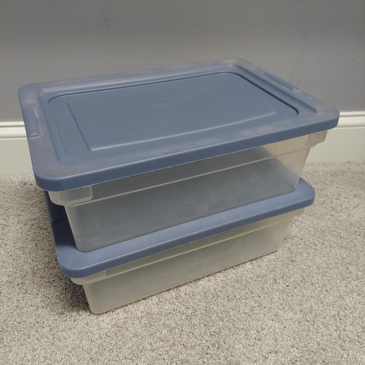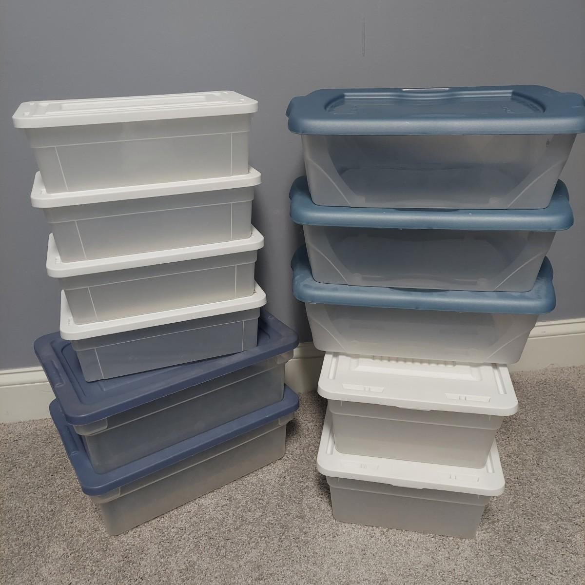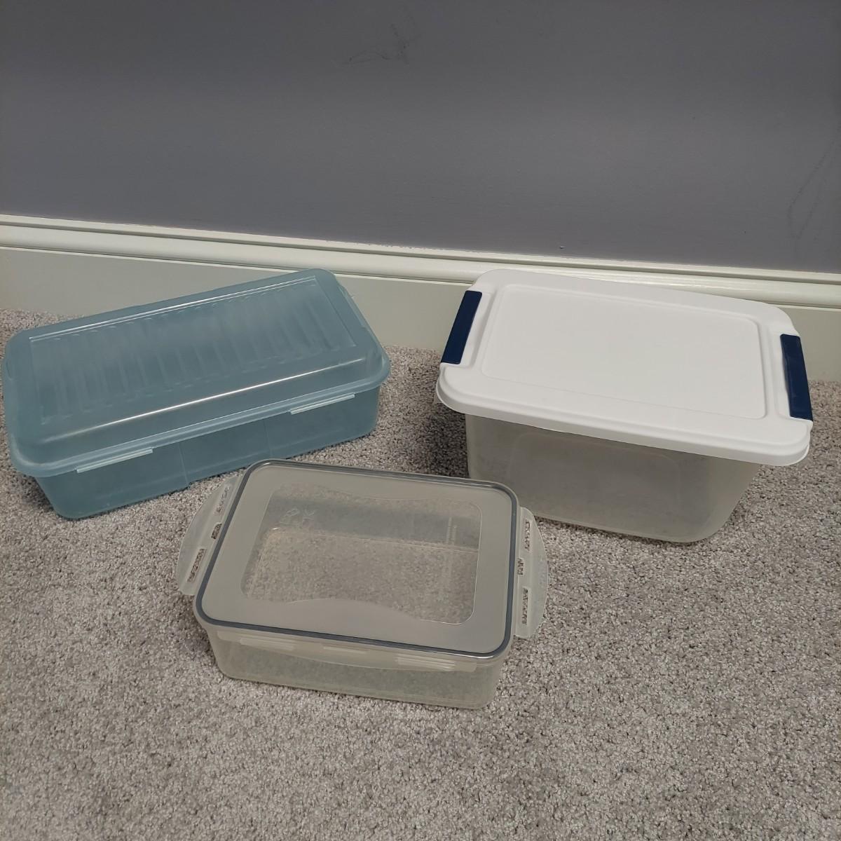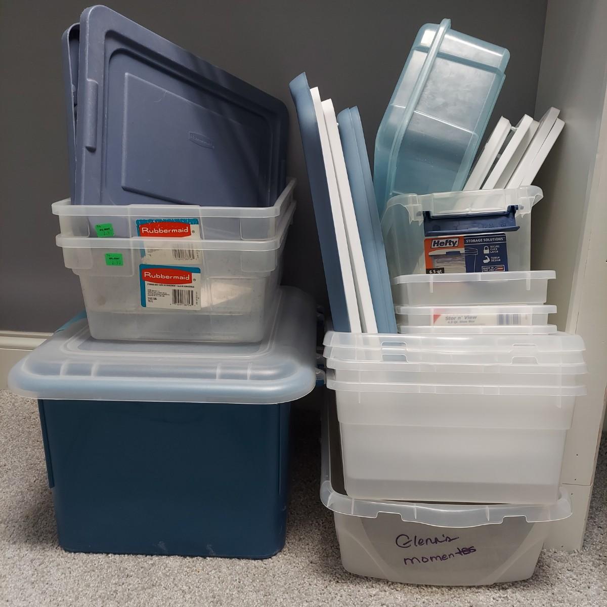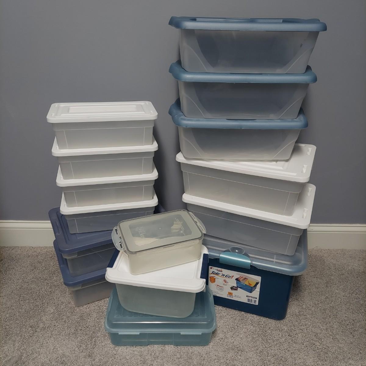 Fifteen small plastic storage bins that are mostly clear. In used condition. Some bins will need wiped out. Please see photos for brands, sizes and specific details. Local Pickup Only