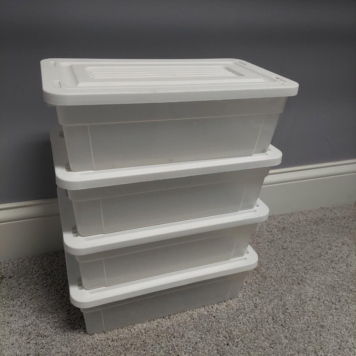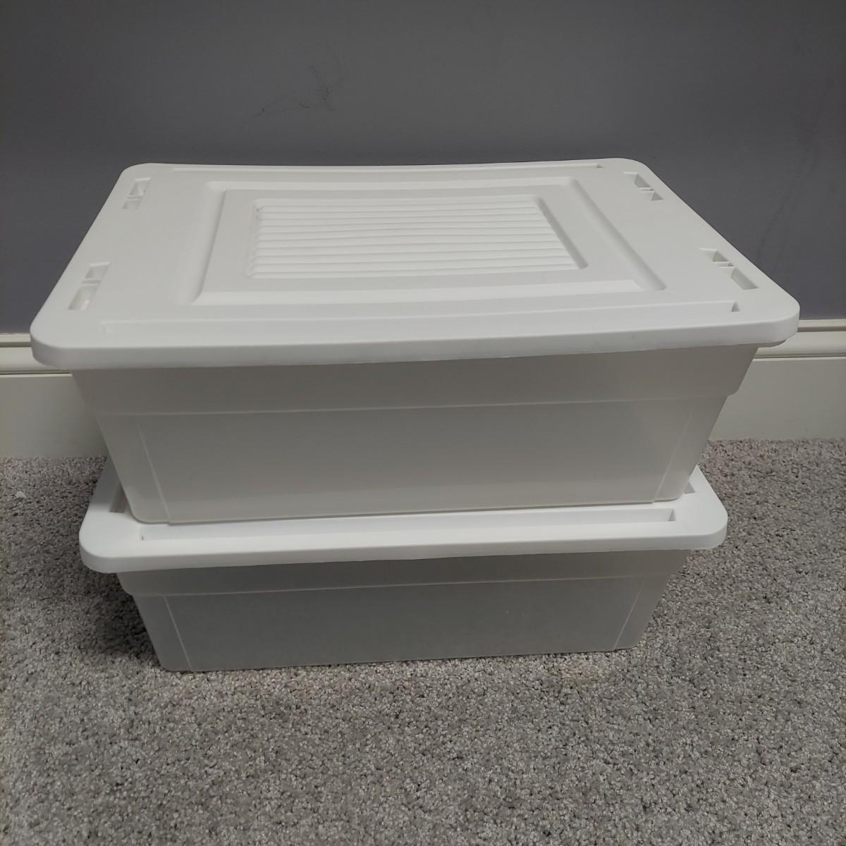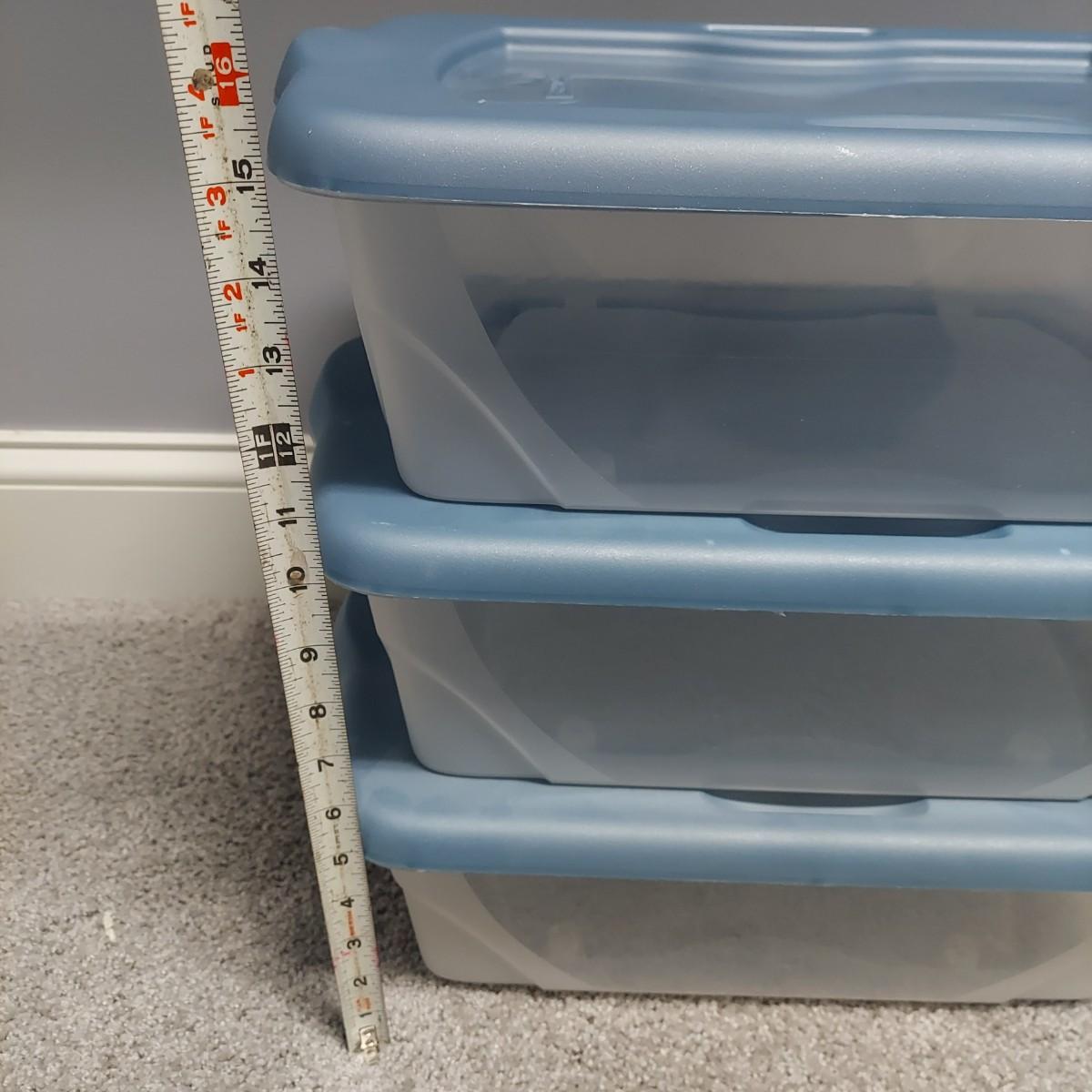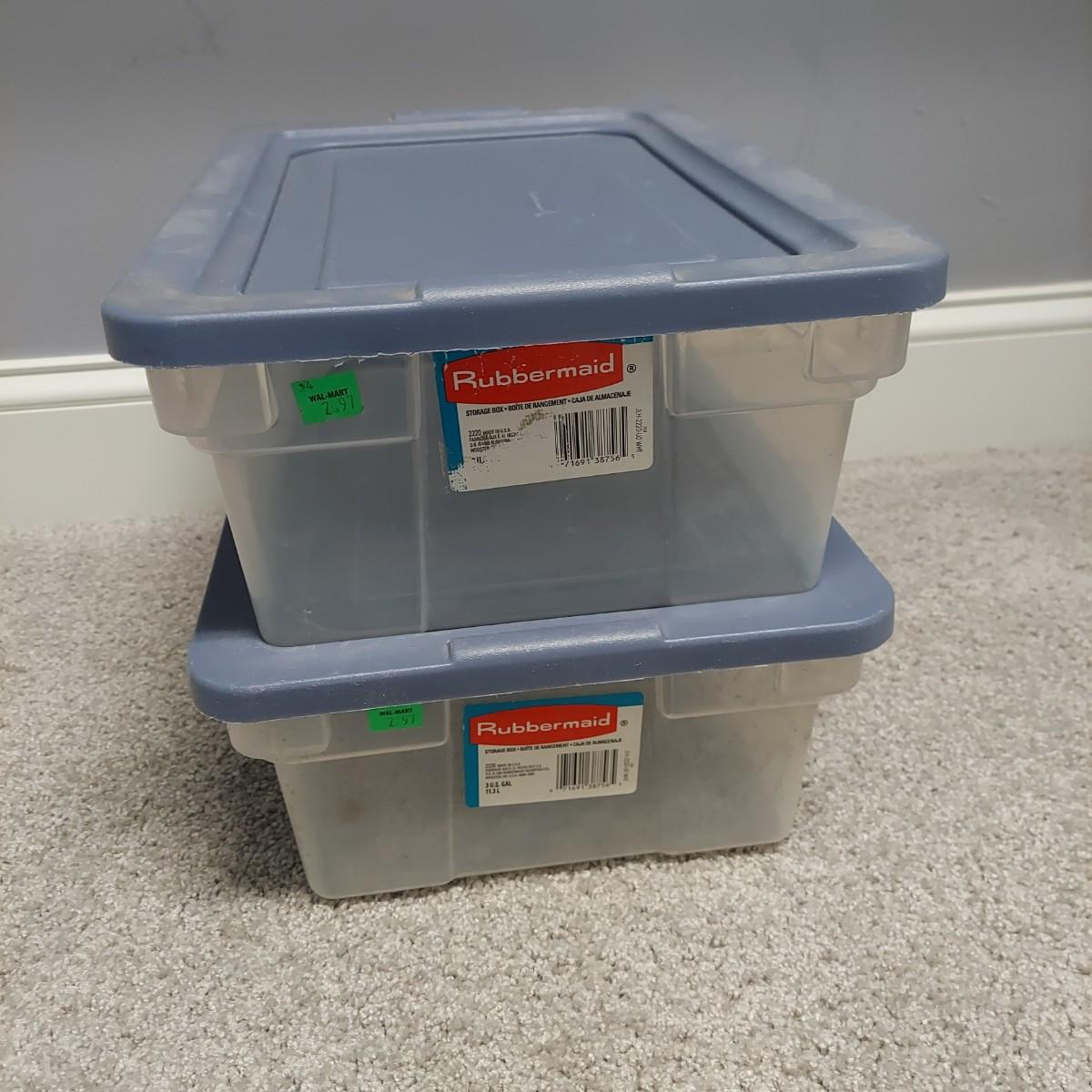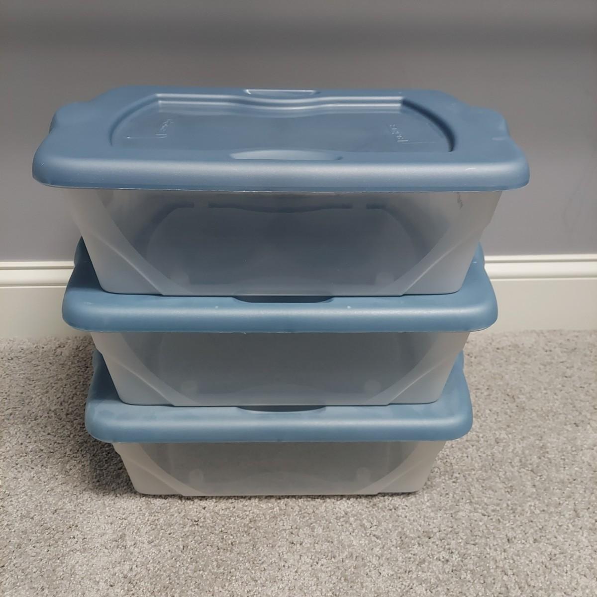 Fifteen small plastic storage bins that are mostly clear. In used condition. Some bins will need wiped out. Please see photos for brands, sizes and specific details. Local Pickup Only