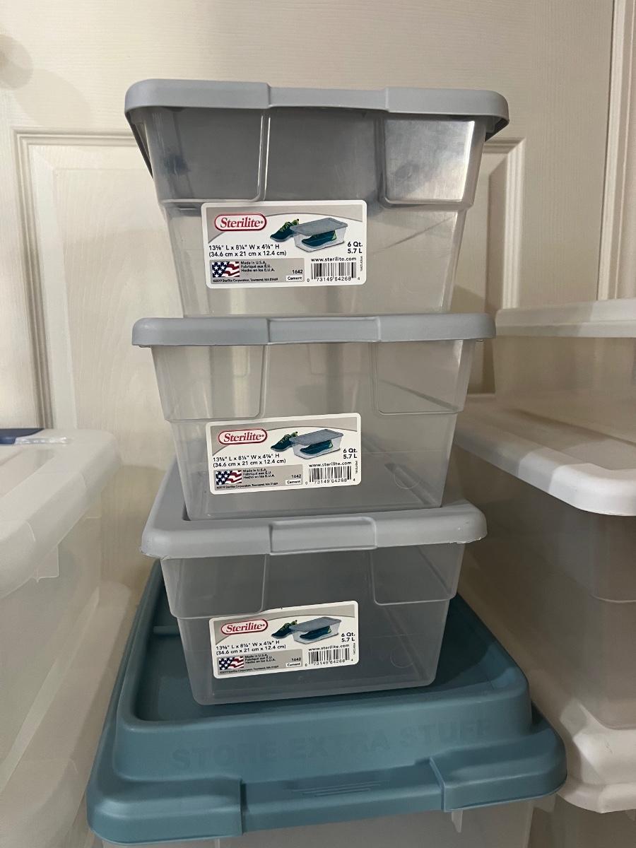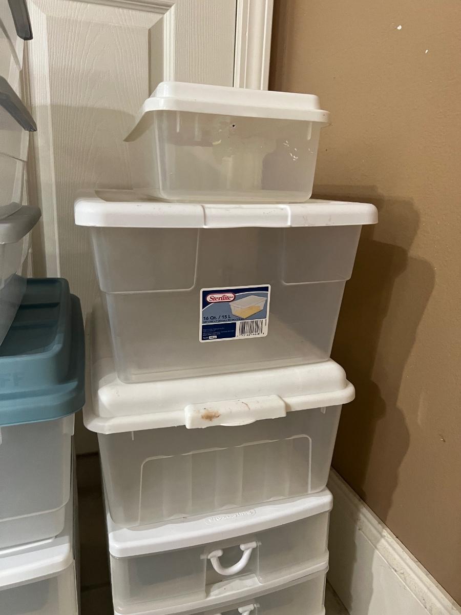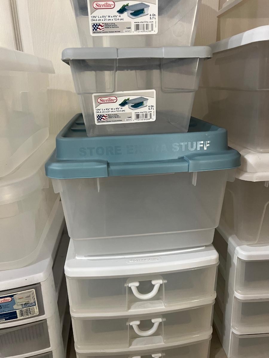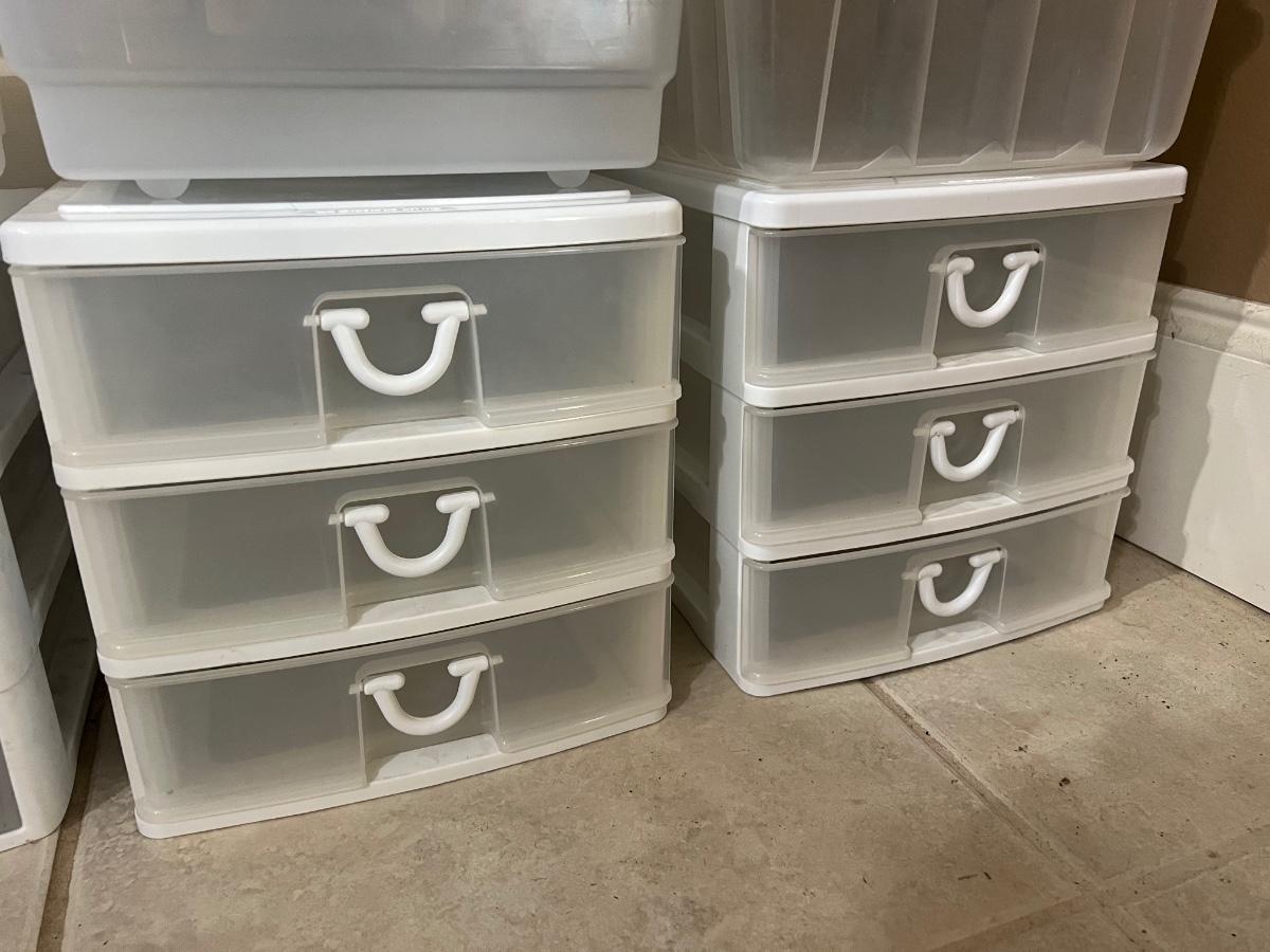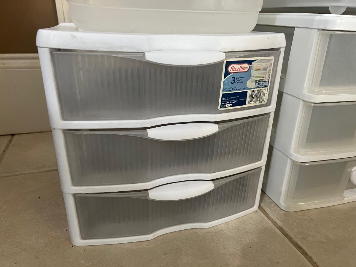 Lots is for 3 small plastic drawer organizers and 9 small plastic totes. Multiple sizes.