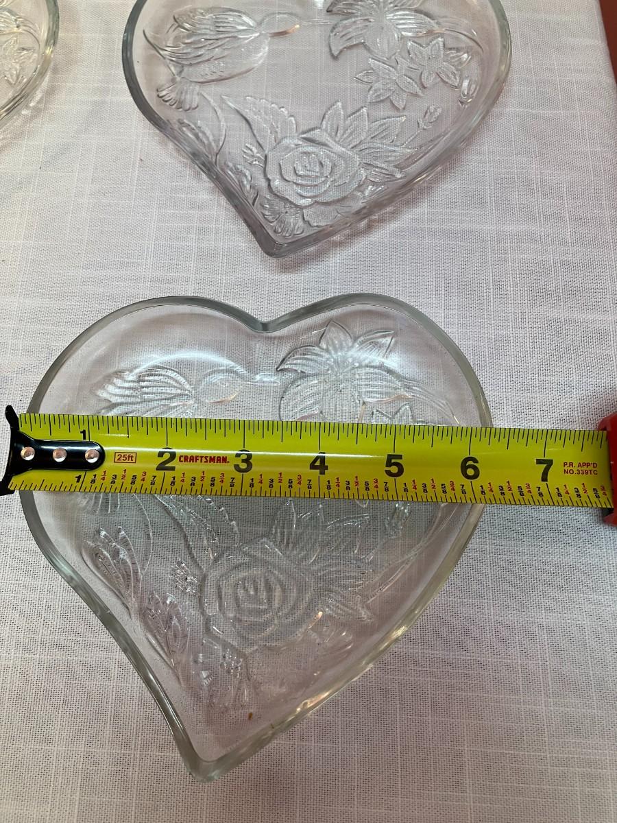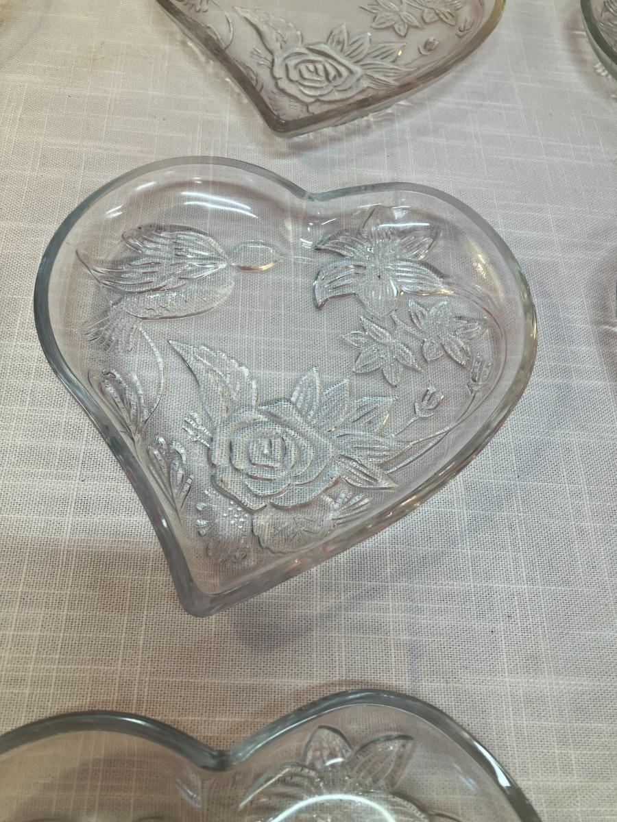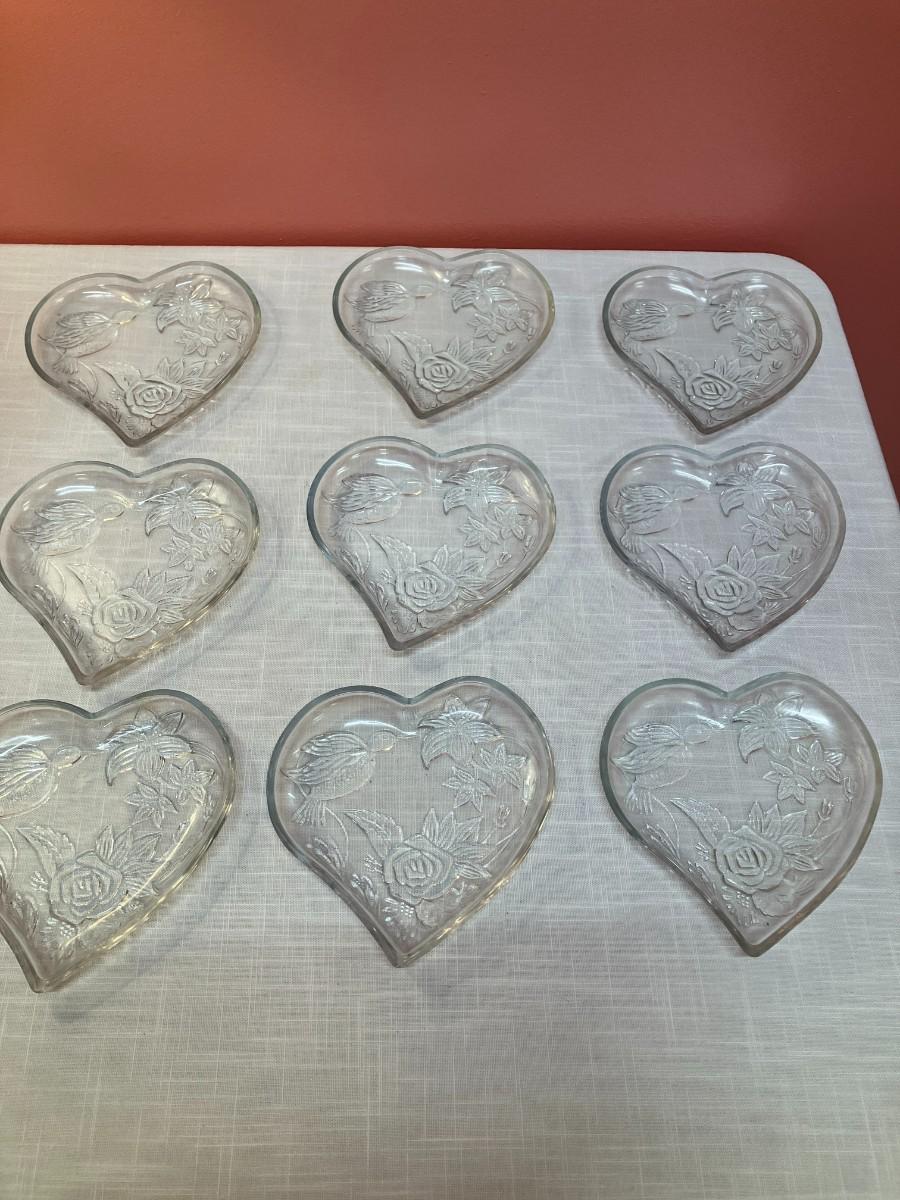 Set of 9 small glass heart appetizer plates with floral design. Great condition!