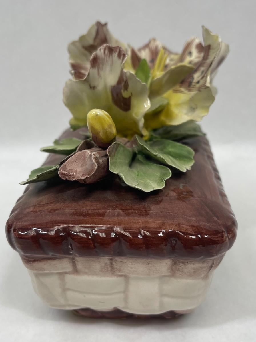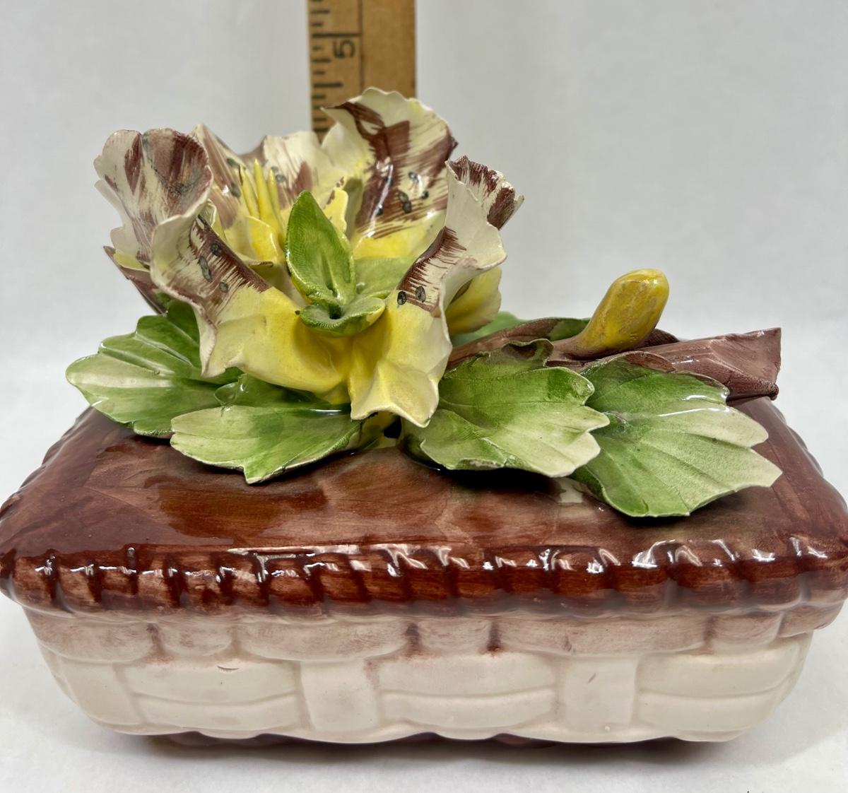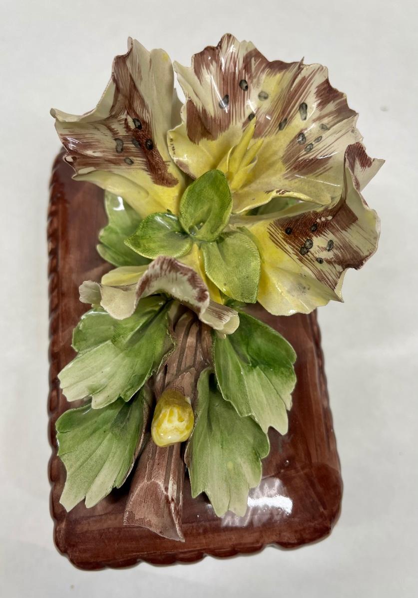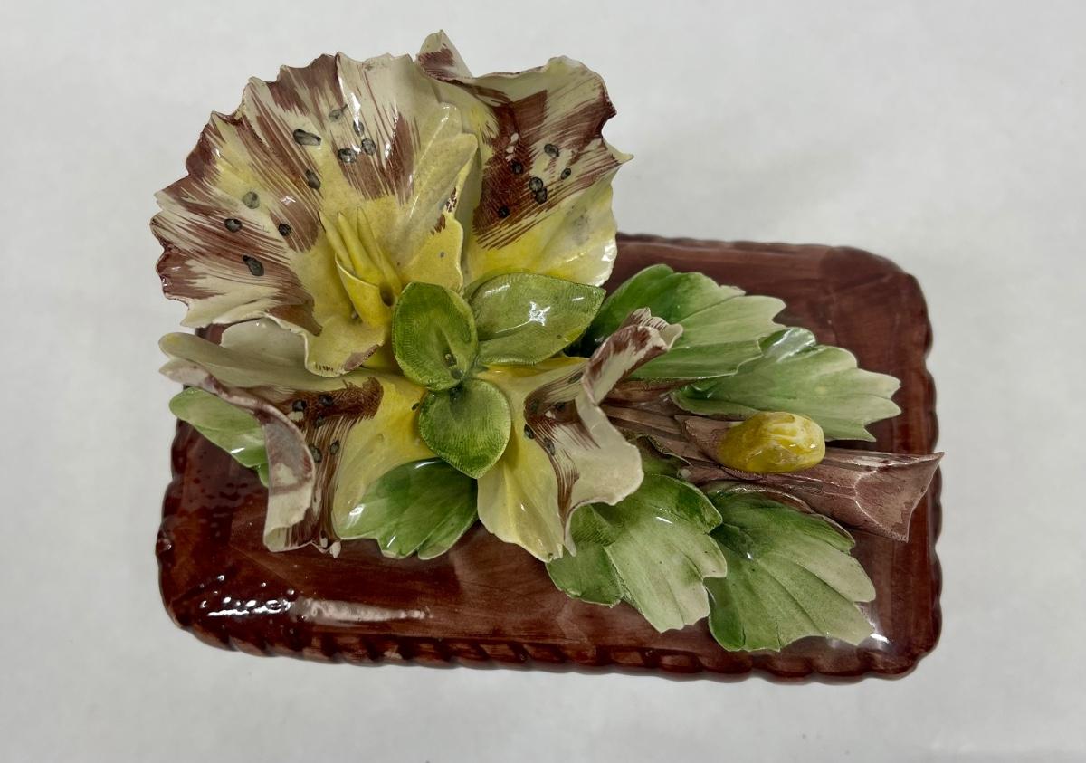 4” x 6” figurine in good condition, but does have a few small chips on flower petal edges. The chips blend in well and could be mistaken for the fold of a petal.
