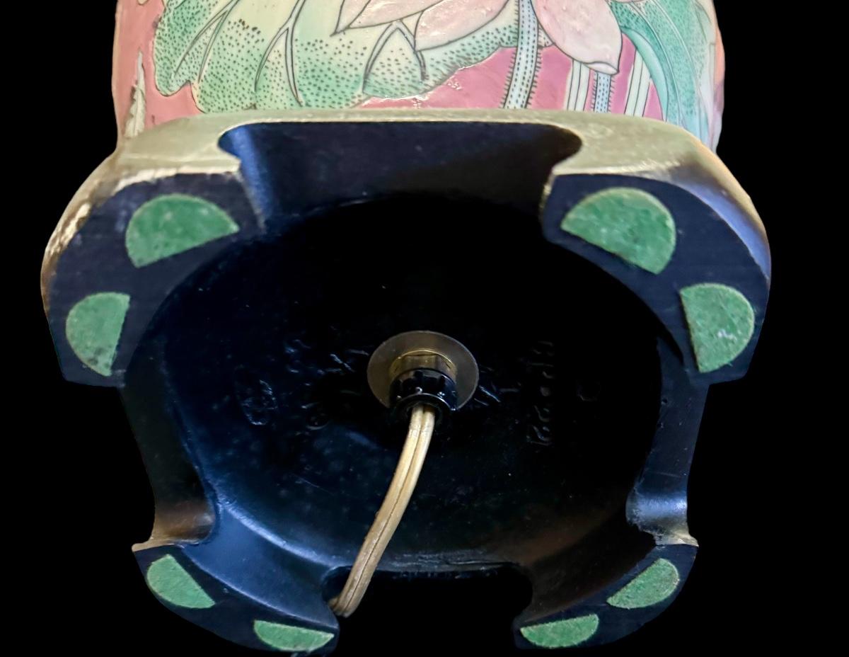 Small Floral Asian table lamp on Square Wooden base.