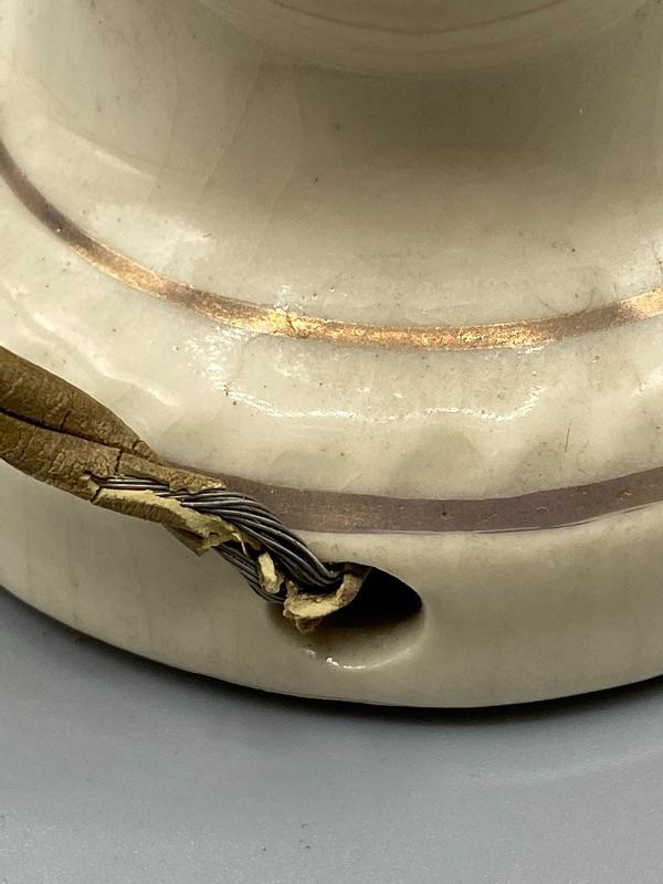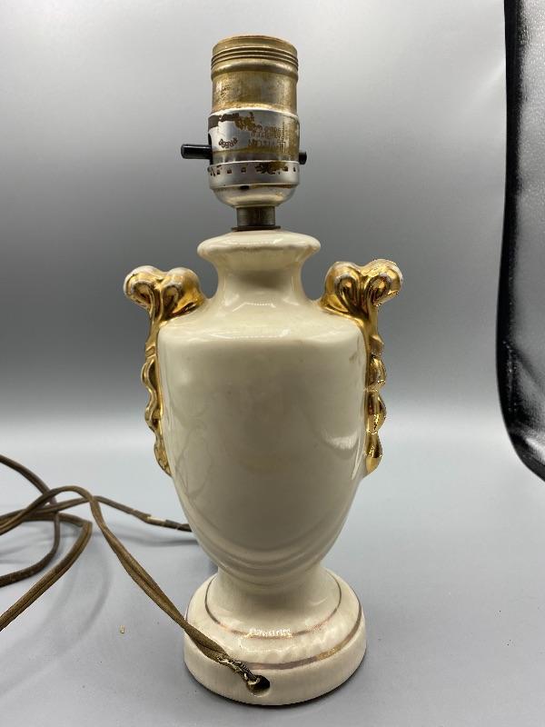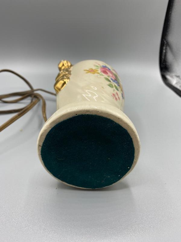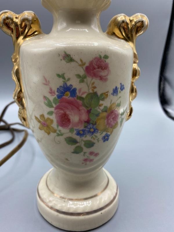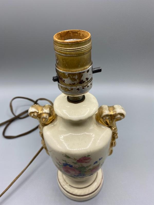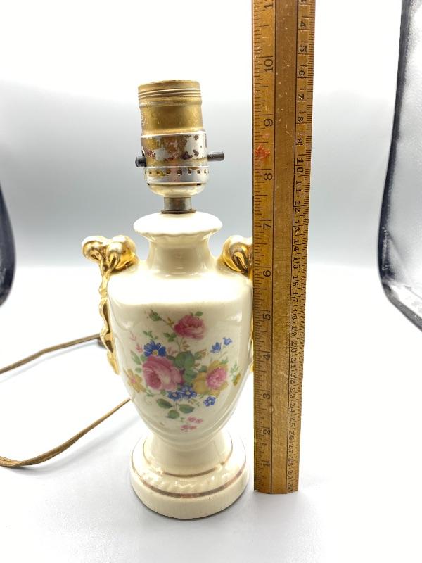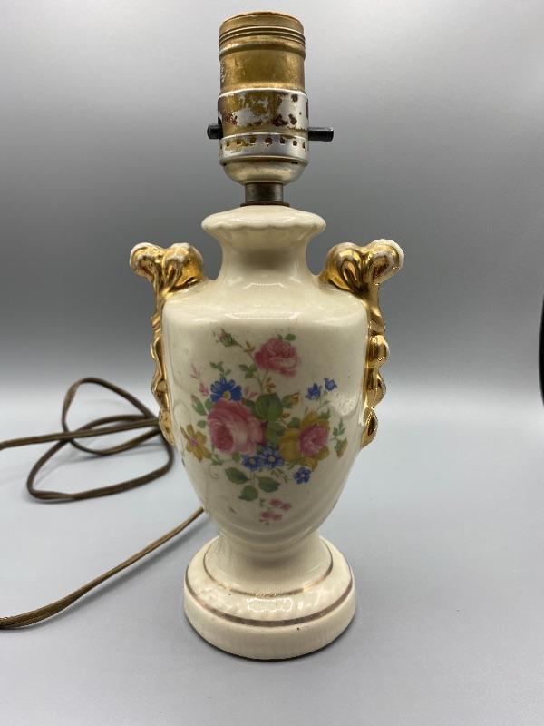Small porcelain lamp. Has a flower pattern on the front, gold painted faux handles near top. No shade. Wire has some cracks in the insulation, needs to be fixed. Crazing in the glaze.