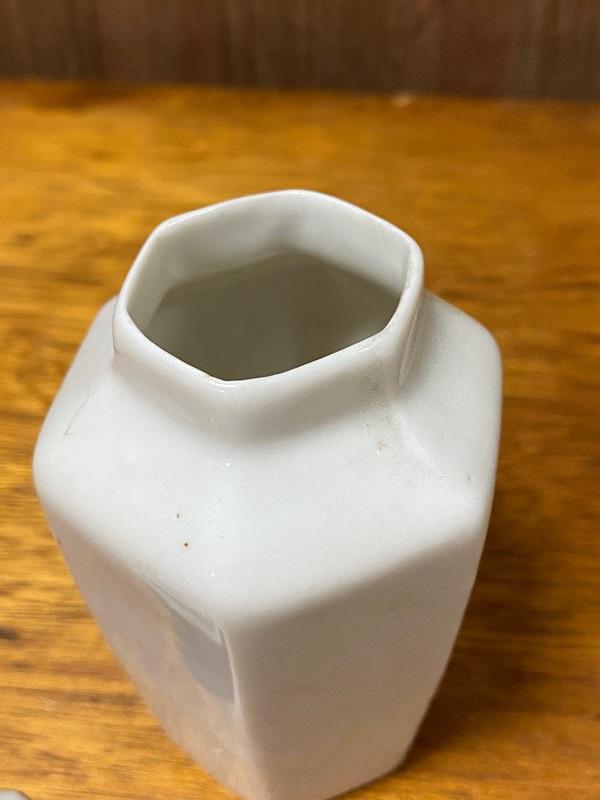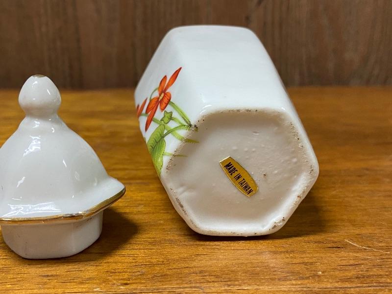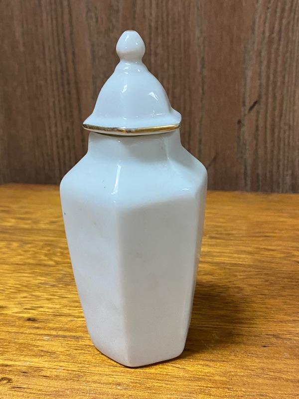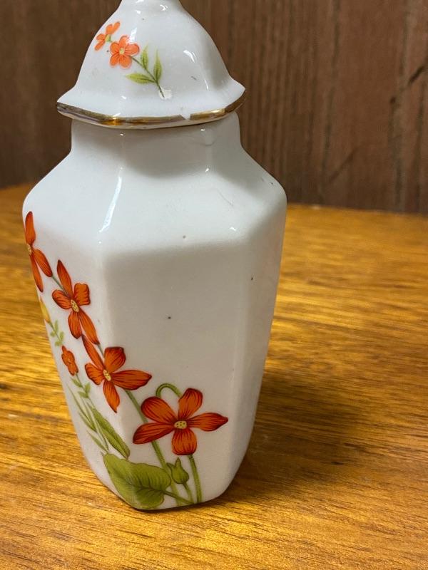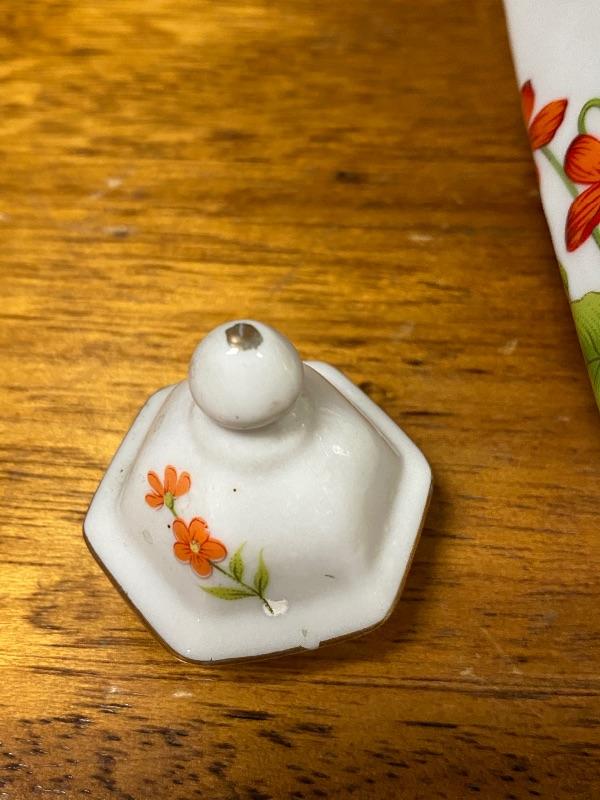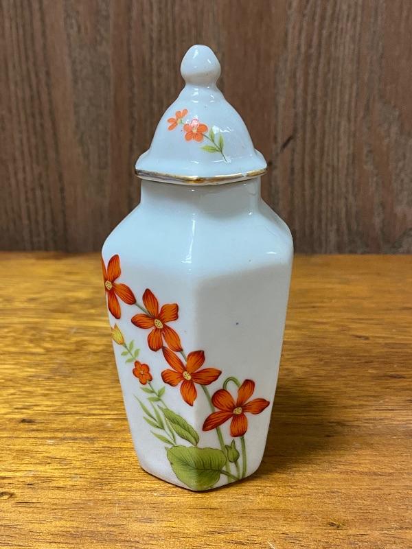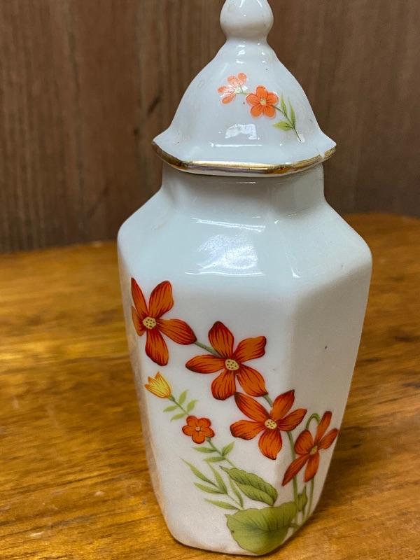 Small Porcelain Urn. About 6" tall. Has bright orange flowers painted on it. No chips.