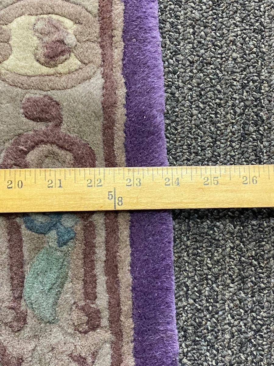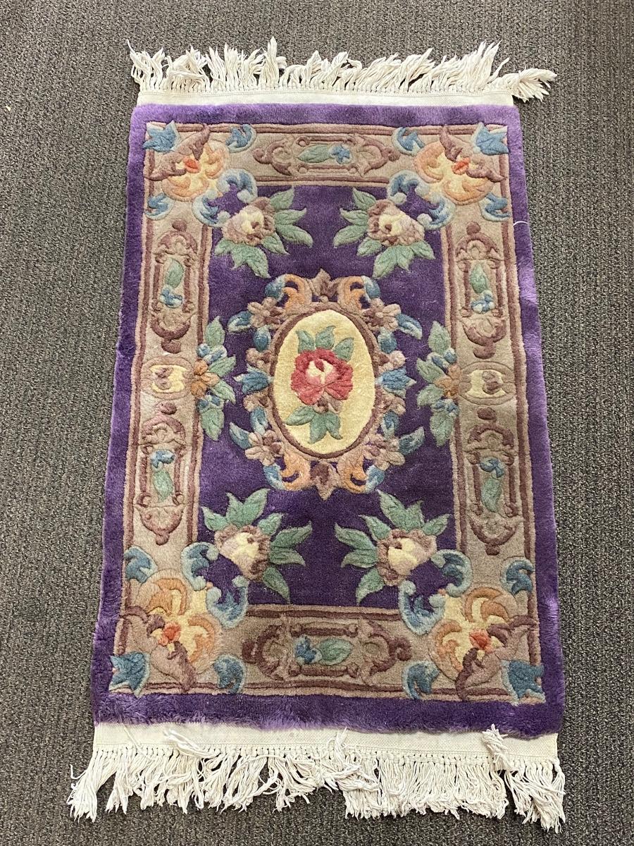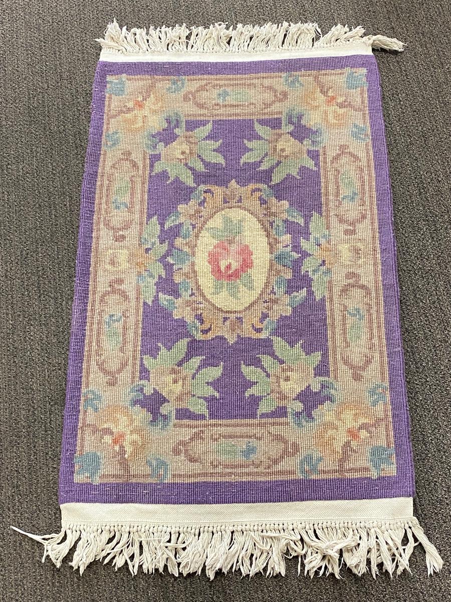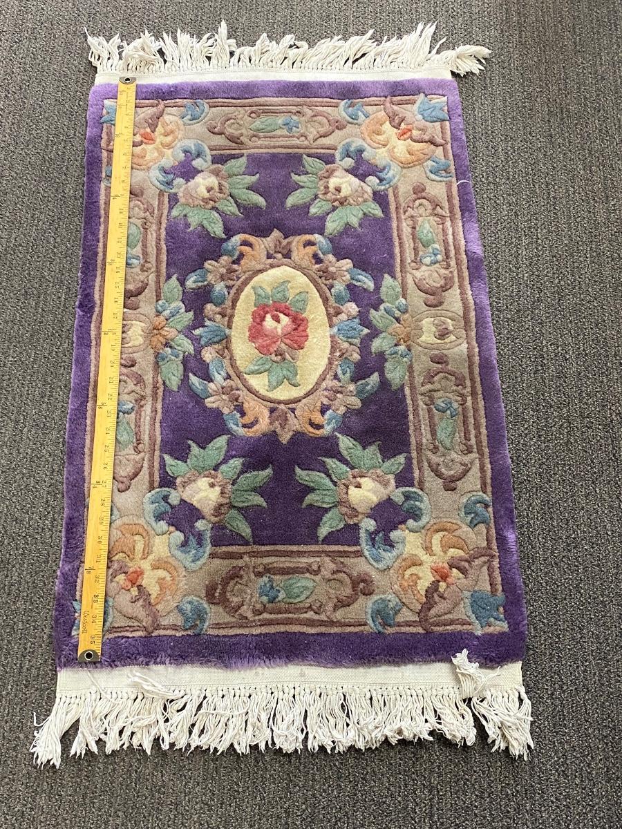 Small purple floral area rug mat. Fringed edge. Thick rug has some discolor from use but does not look like it has any spill type stains. About 36x24 without the fringe.