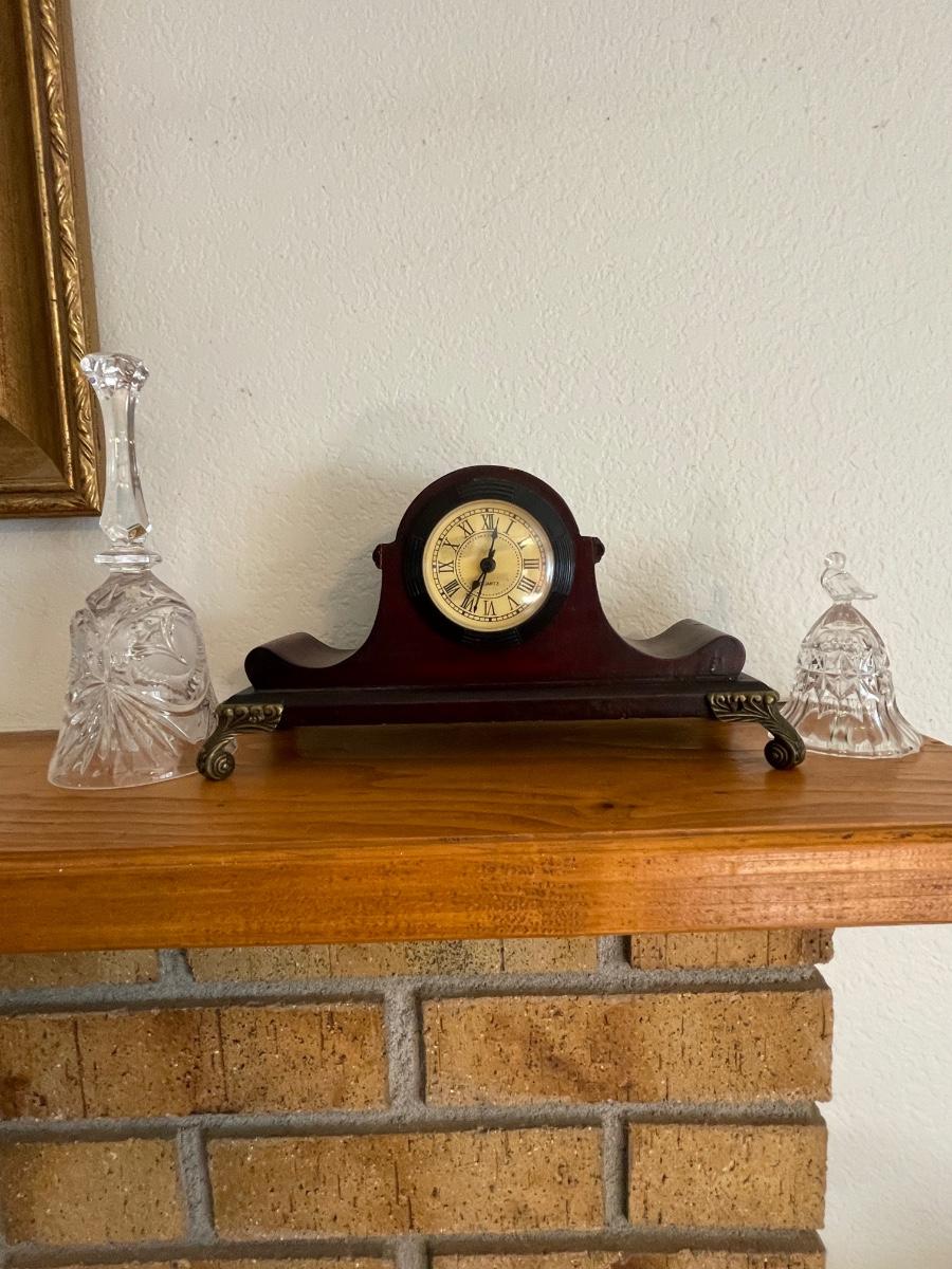 SMALL QUARTZ MANTEL CLOCK & 2 LEAD CRYSTAL BELLS