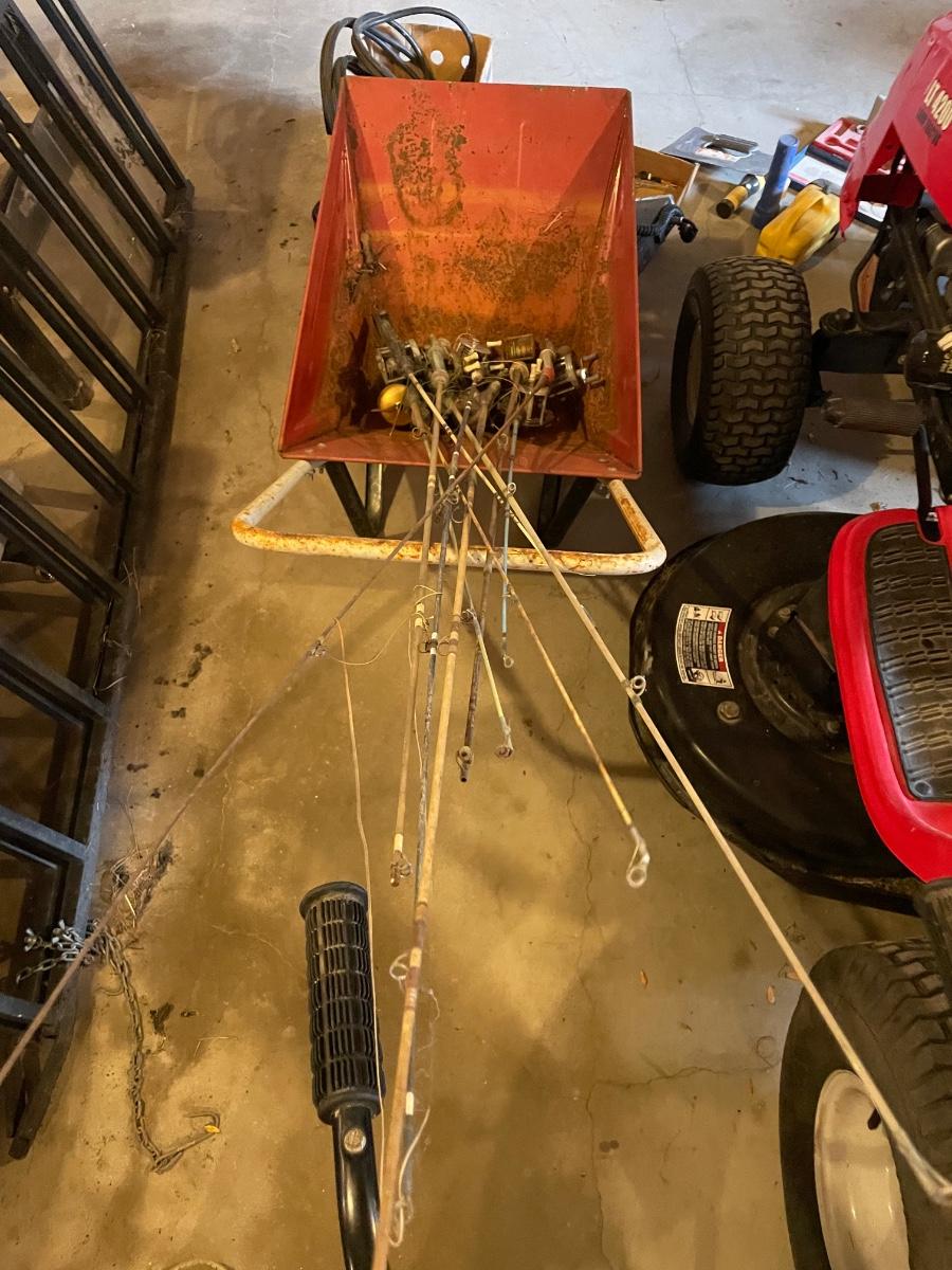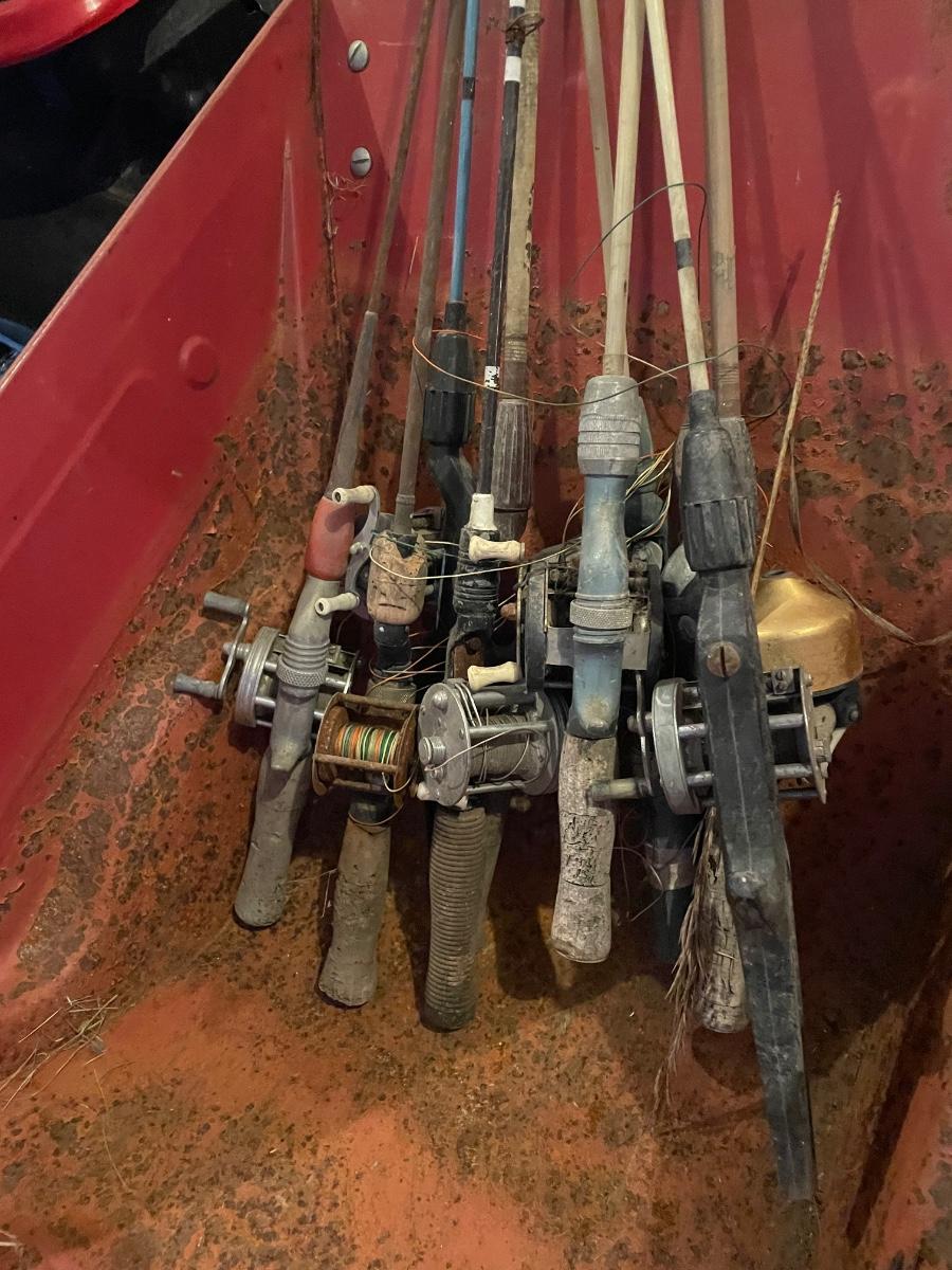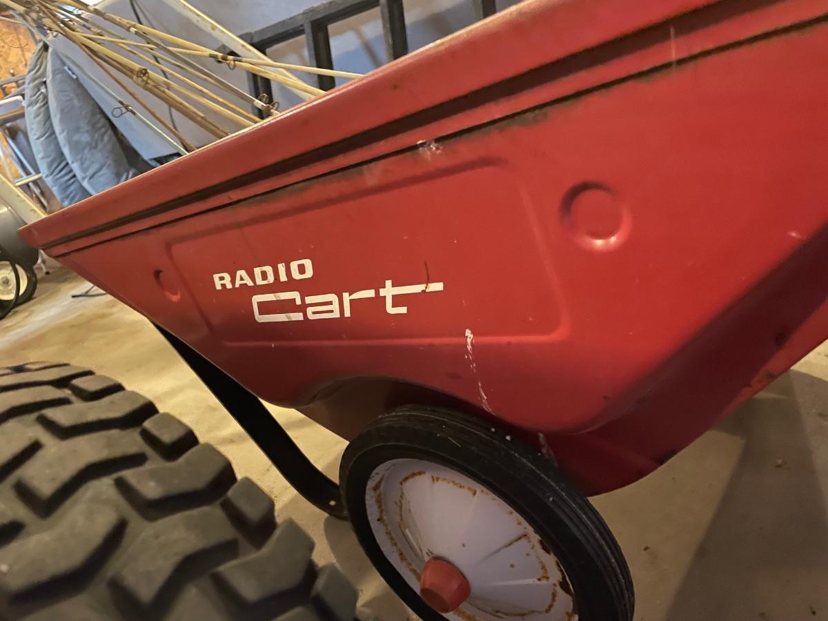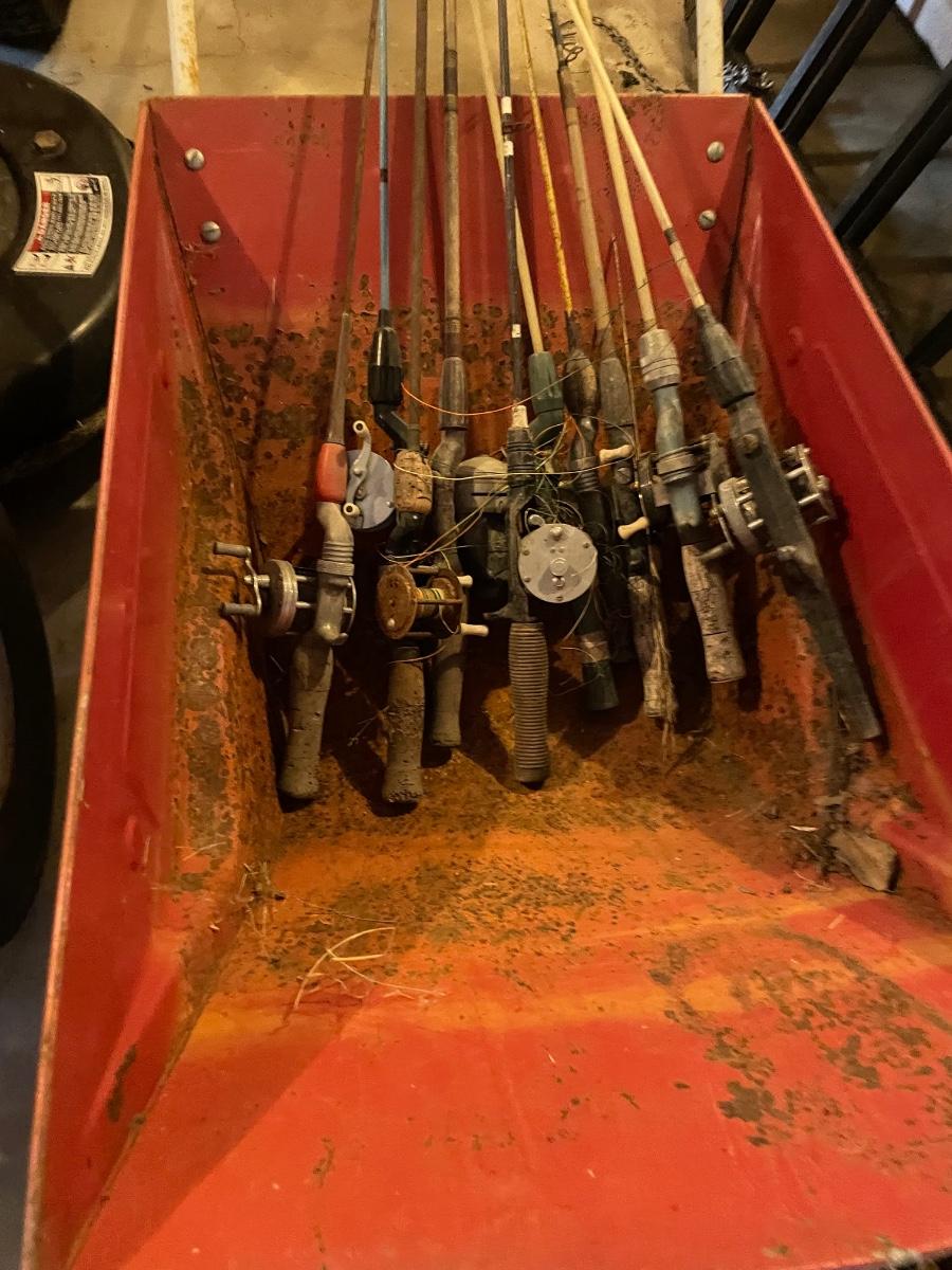 Vintage Small red Radio Cart with vintage fishing rods and reels