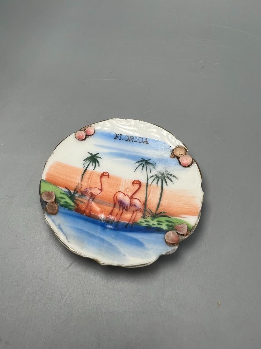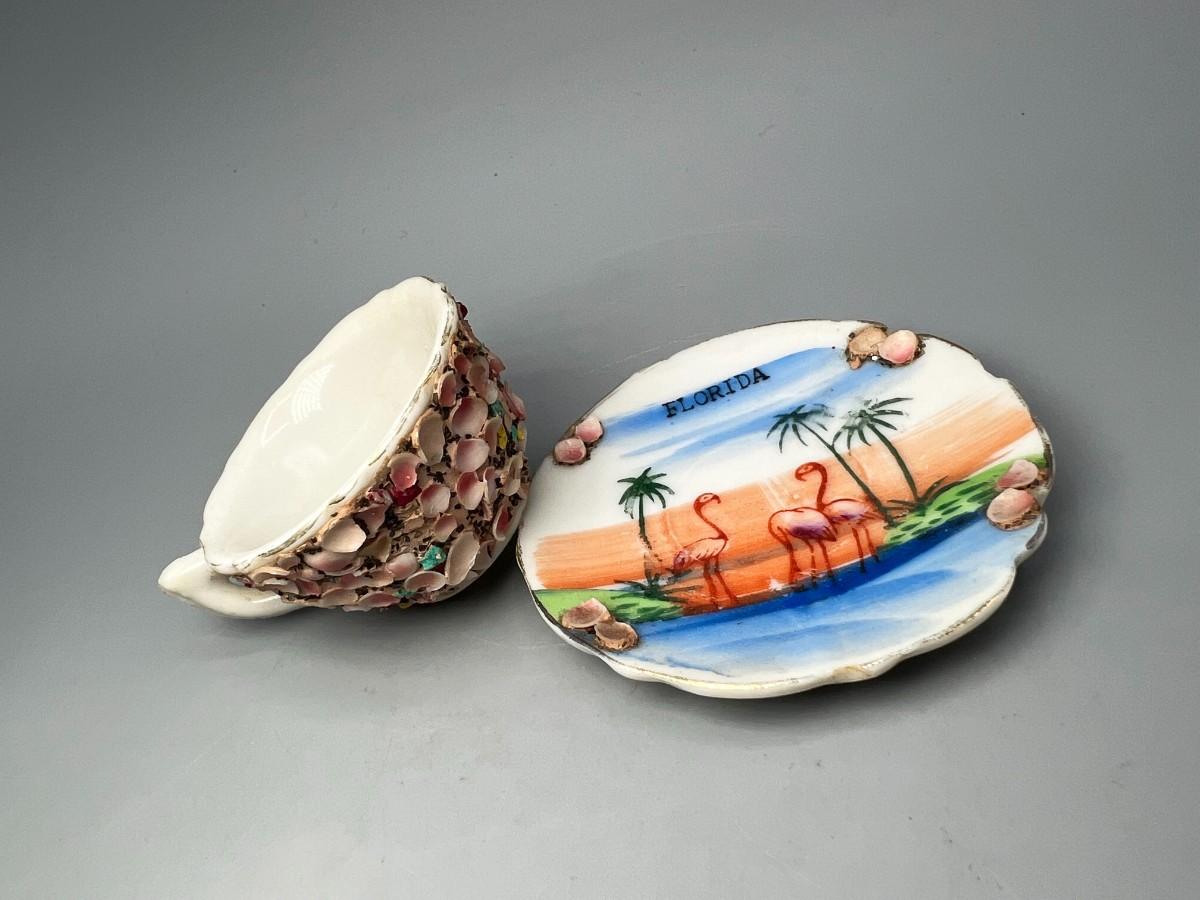 Small Retro Seashell Flamingo Florida Souvenir Tea Cup & Saucer, there is some light wear to the cup and saucer, but there is no signficnat damage and is in good collectible condition. Check pictures for more details and for sizing.