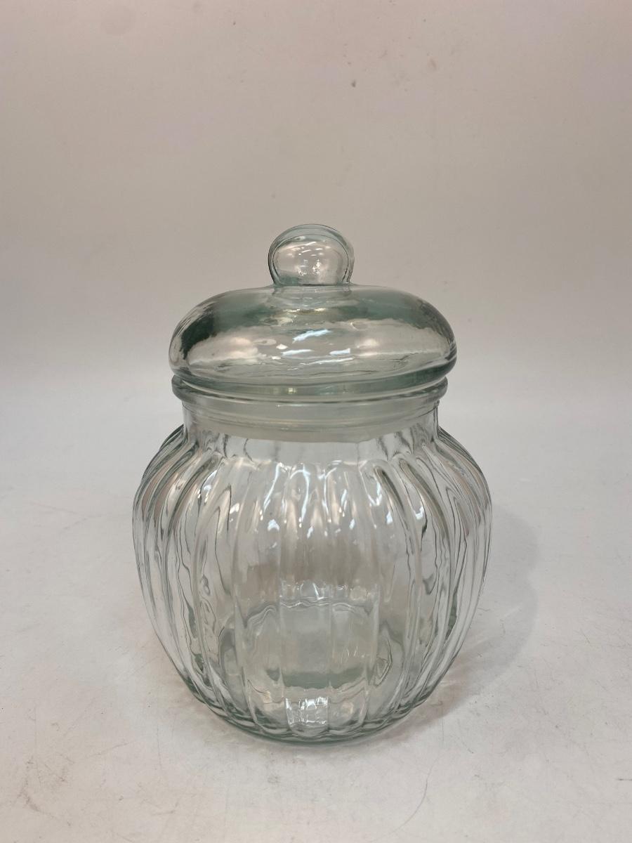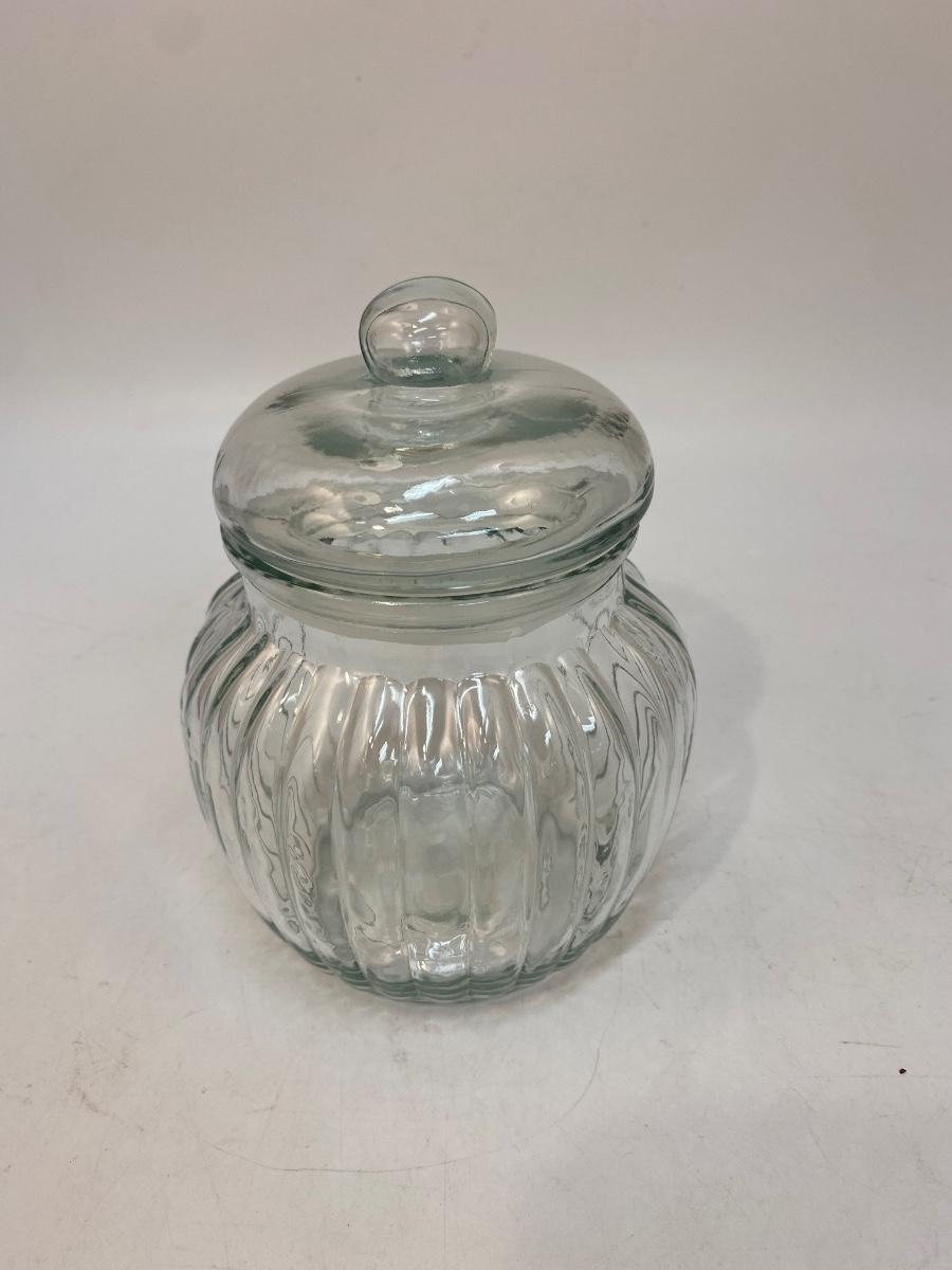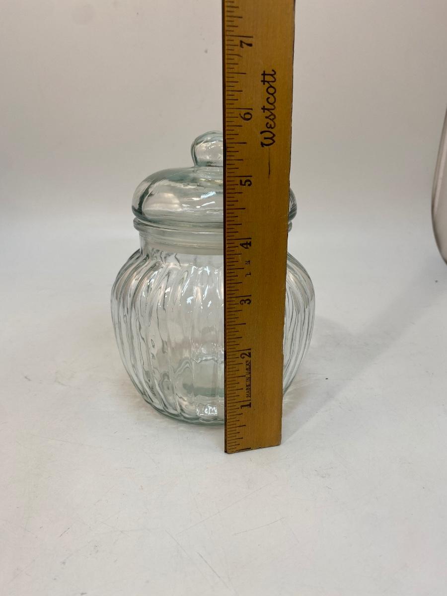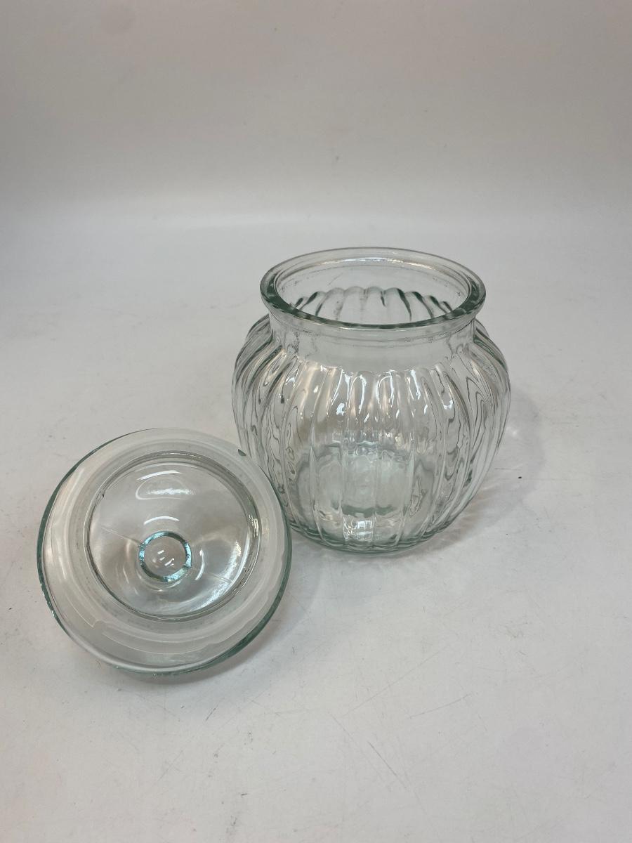 Small Ribbed Apothecary Lidded Glass Jar. Good condition. Lid has plastic seal to keep contents fresh longer. 6" size.