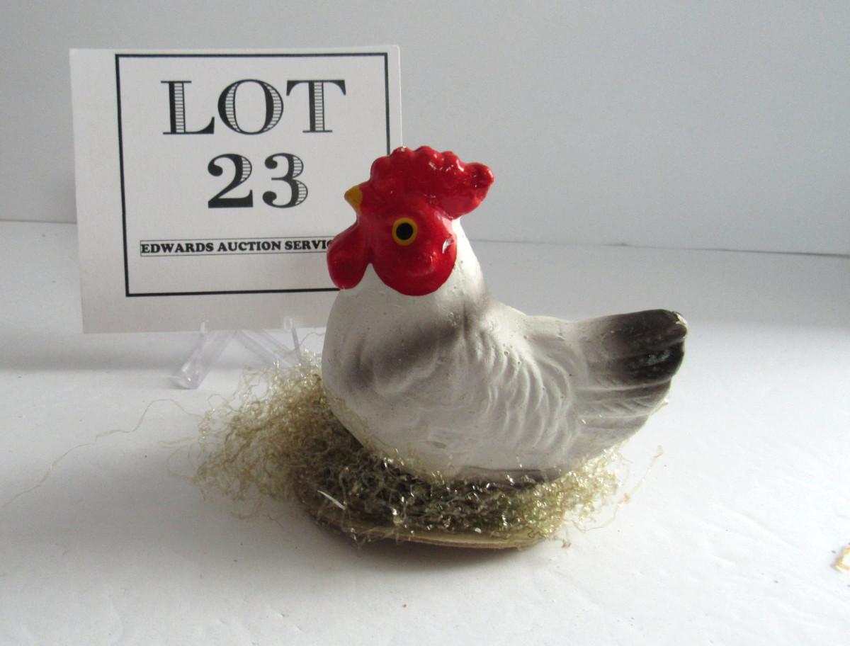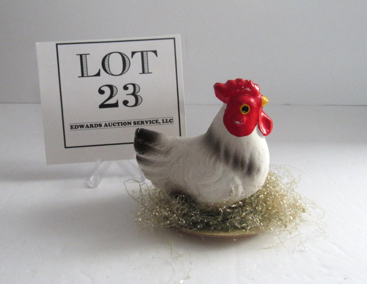 Small lightweight painted styrofoam (?) on cardboard disk. There is a squeaker under the rooster and it works. Has a Shackman's import label on bottom.