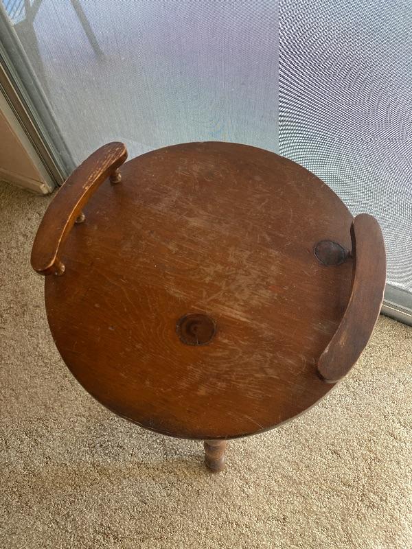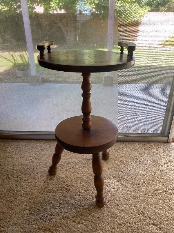 Small round table. Has some signs of age. Needs to be refinished or painted. Stands 23” and is 13.5” wide.