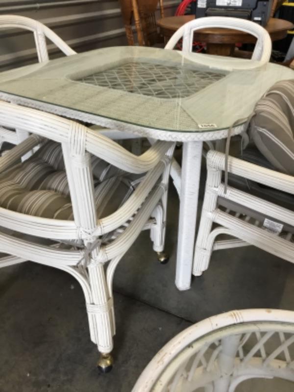Small round table and larger wicker glass top table with four chairs on casters with cushions Lot 1056