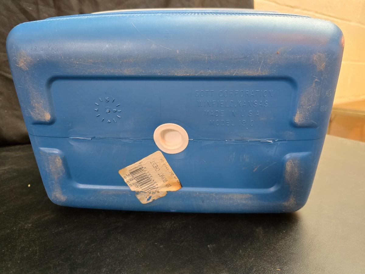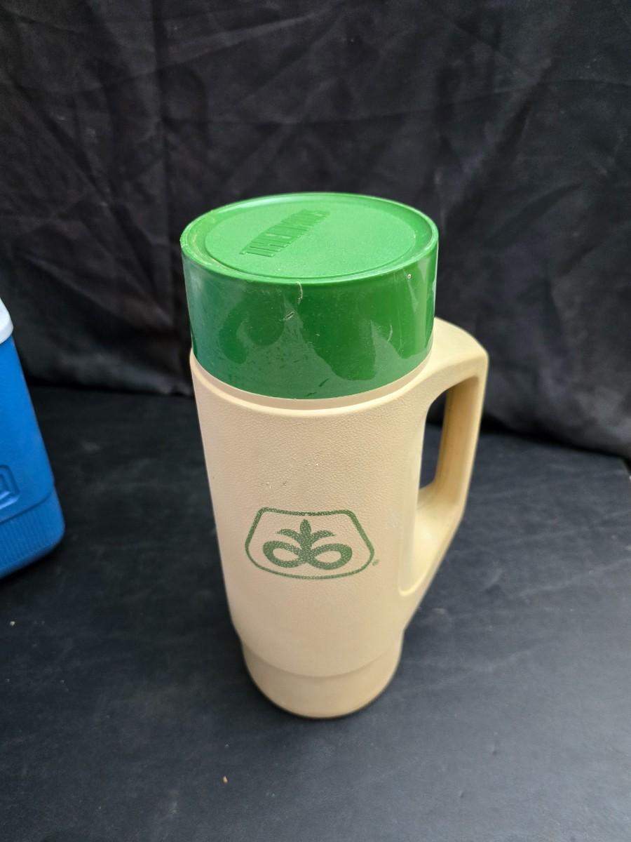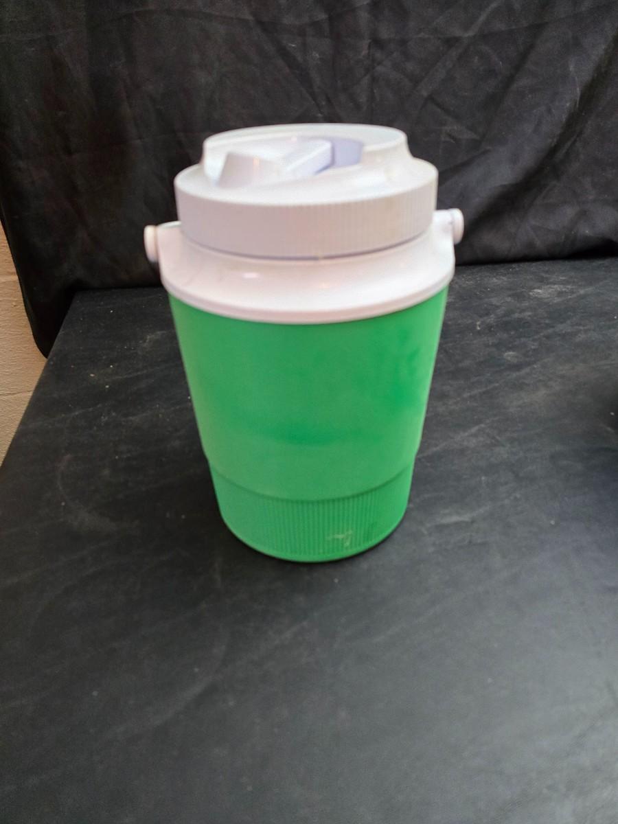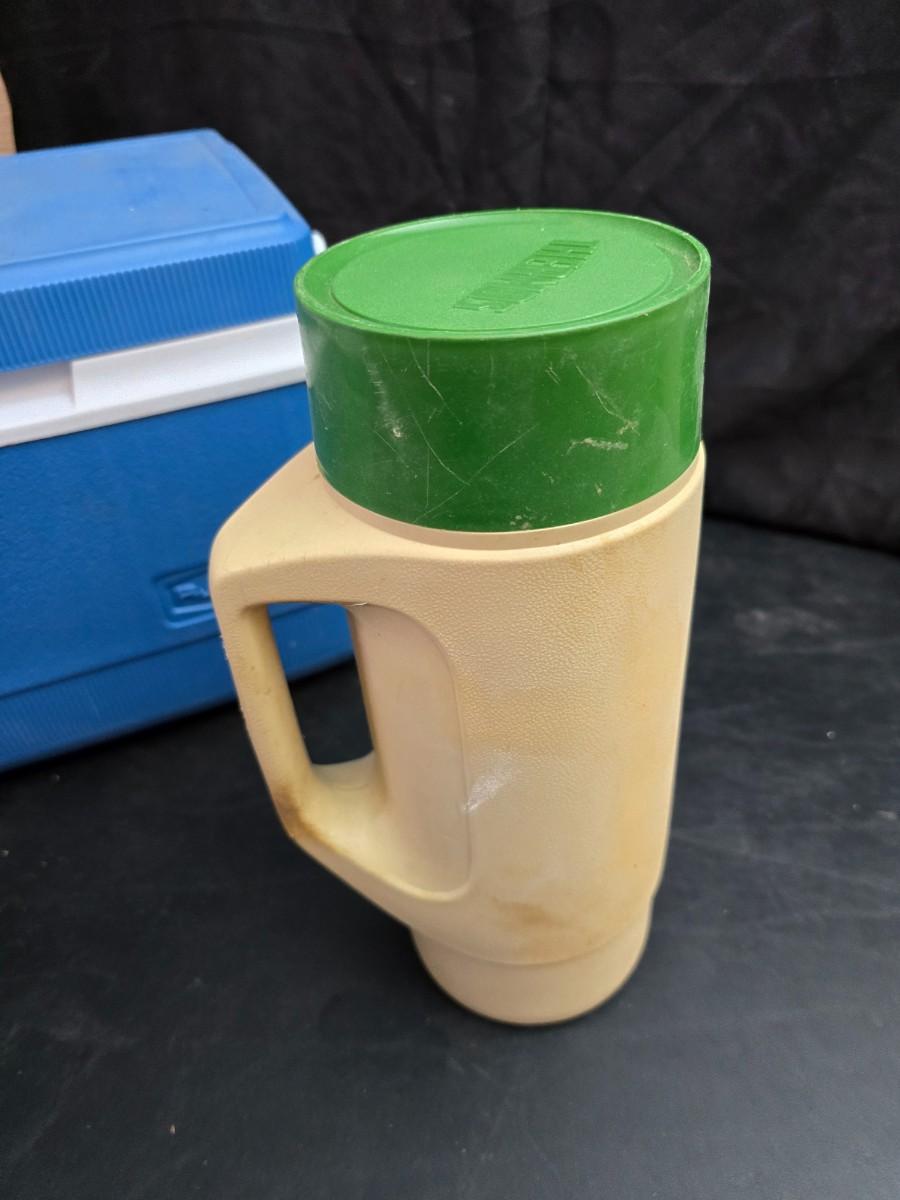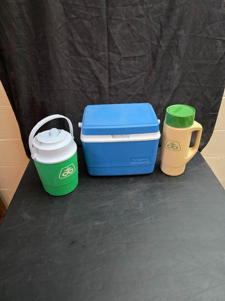 Small Rubbermaid cooler with a Gott water cooler and a thermos