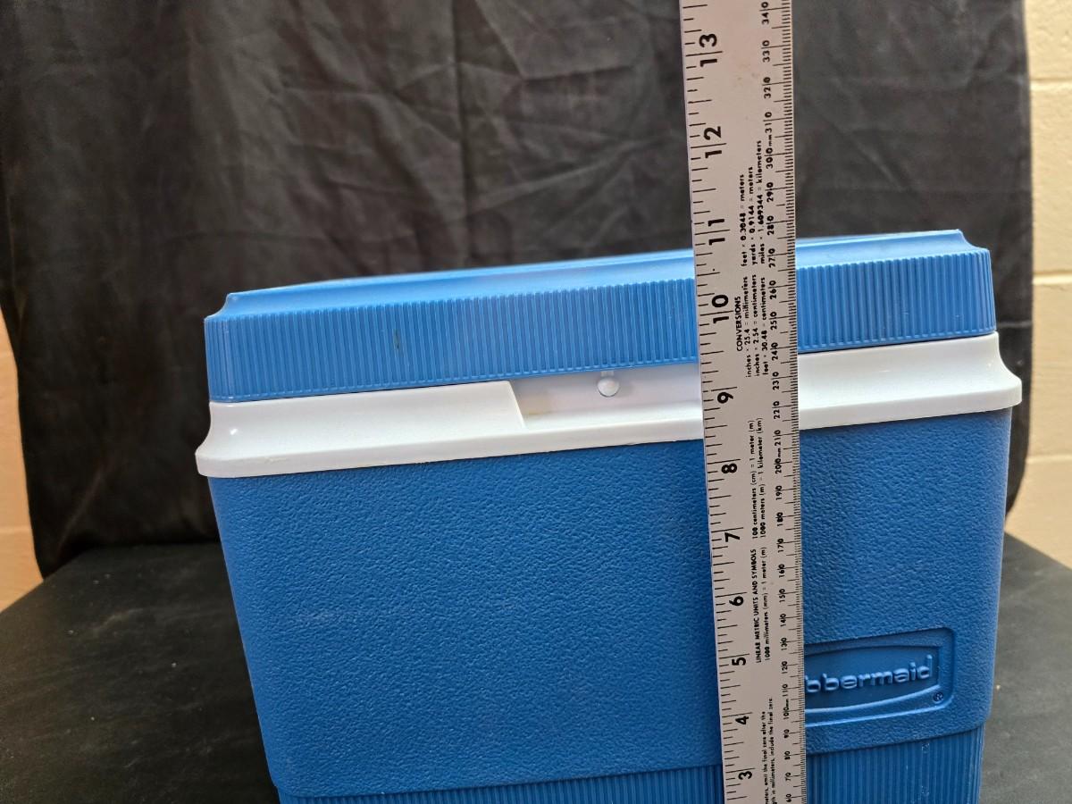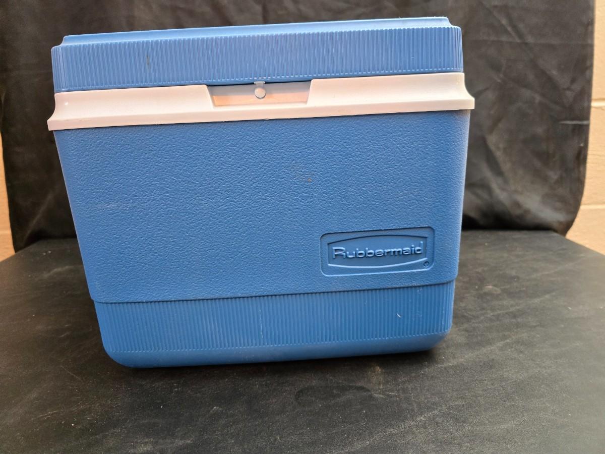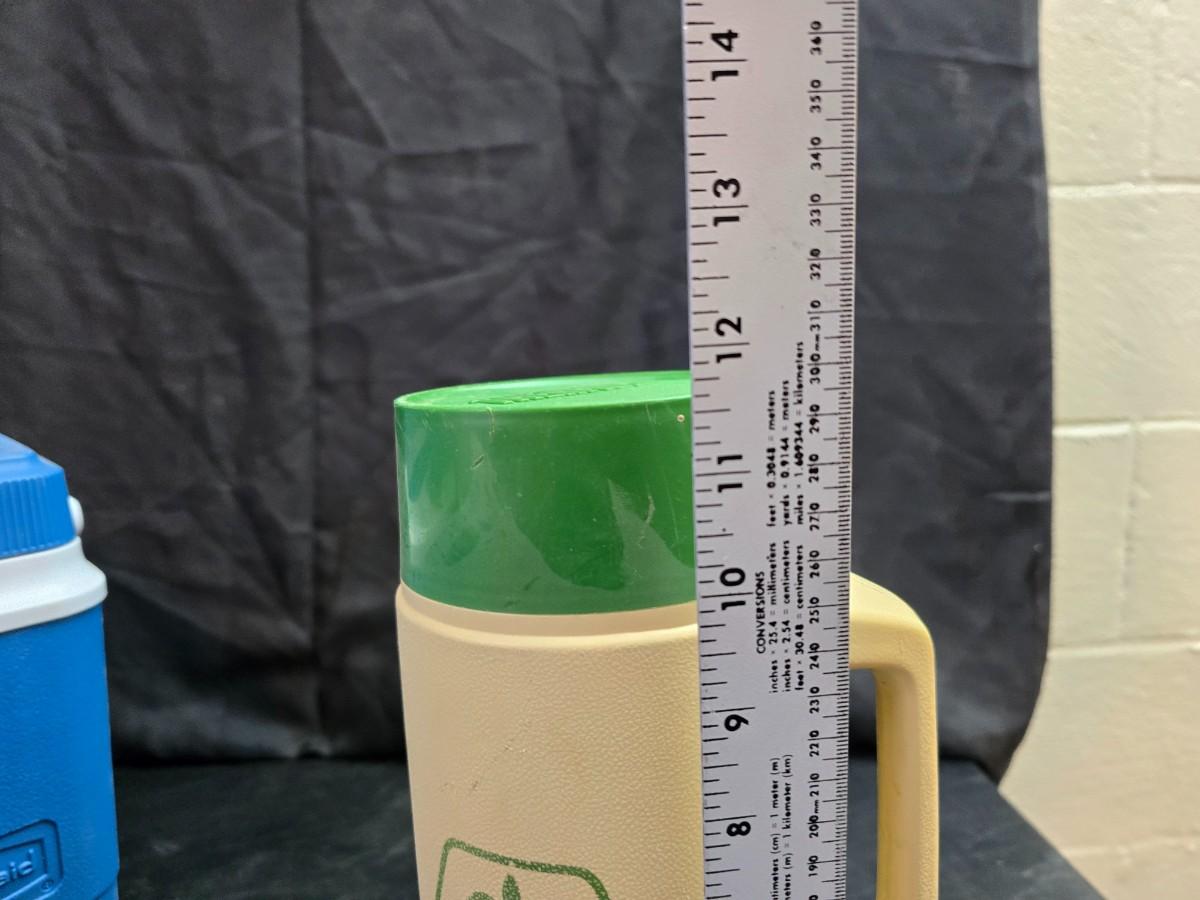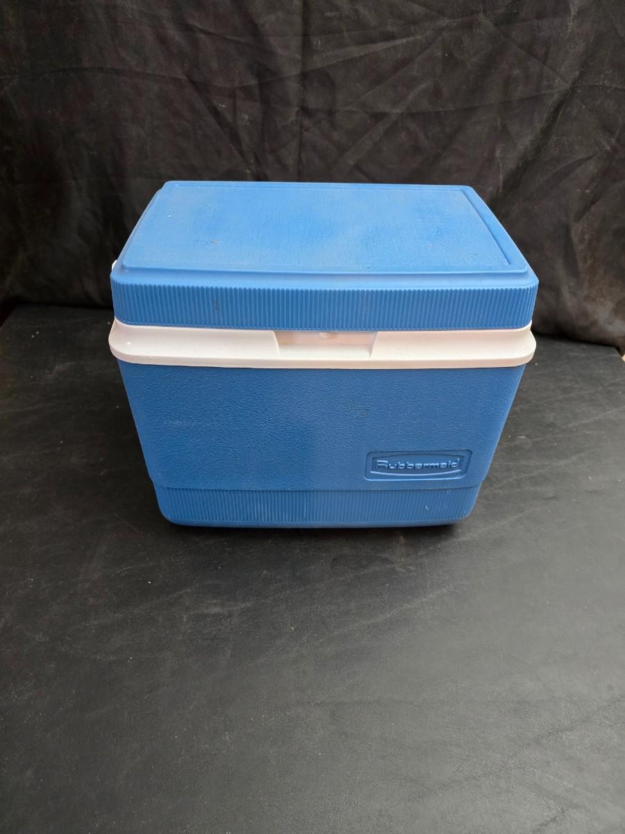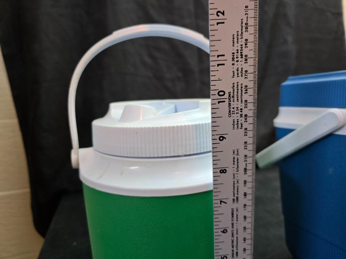 Small Rubbermaid cooler with a Gott water cooler and a thermos