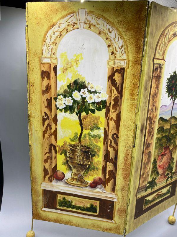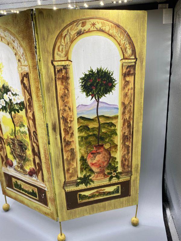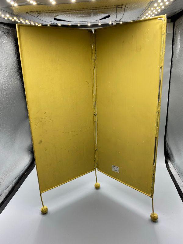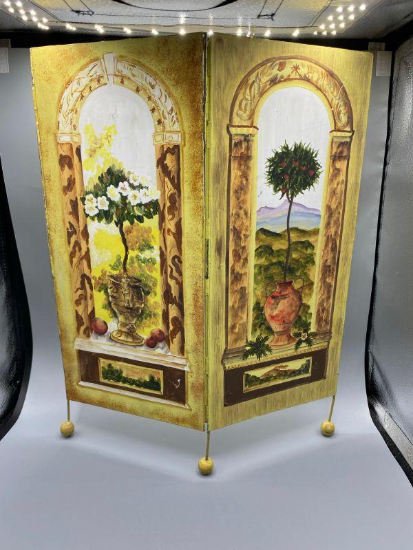 Painted metal decor piece. Folds in the center, think it may have had another piece to it at one time. Has a rustic vineyard charm to it. Great for background display. Stands over 15".