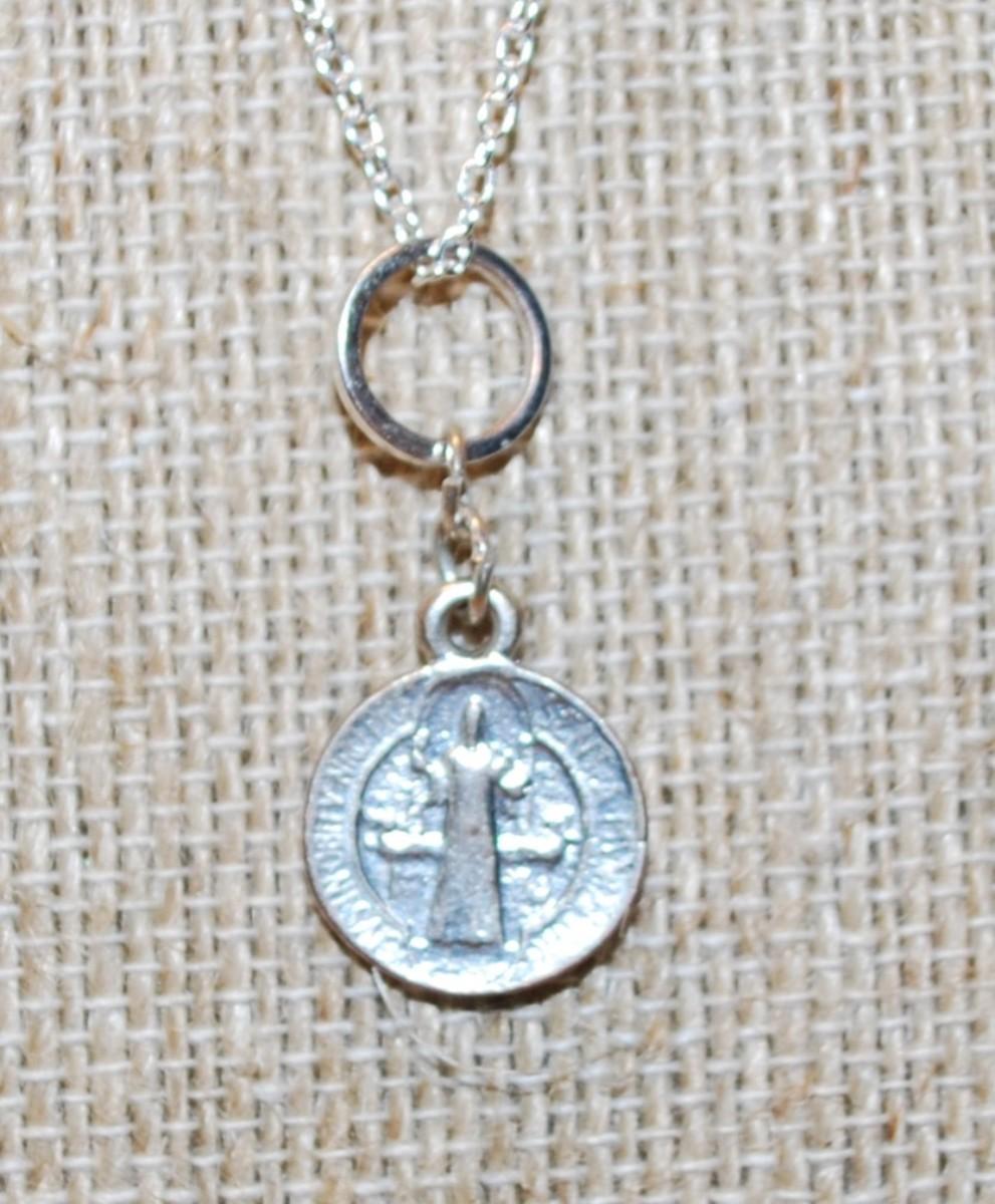 Small Saint's Medal Style PENDANT (¼" Diam.) on a Silver Tone Necklace Chain 18" L