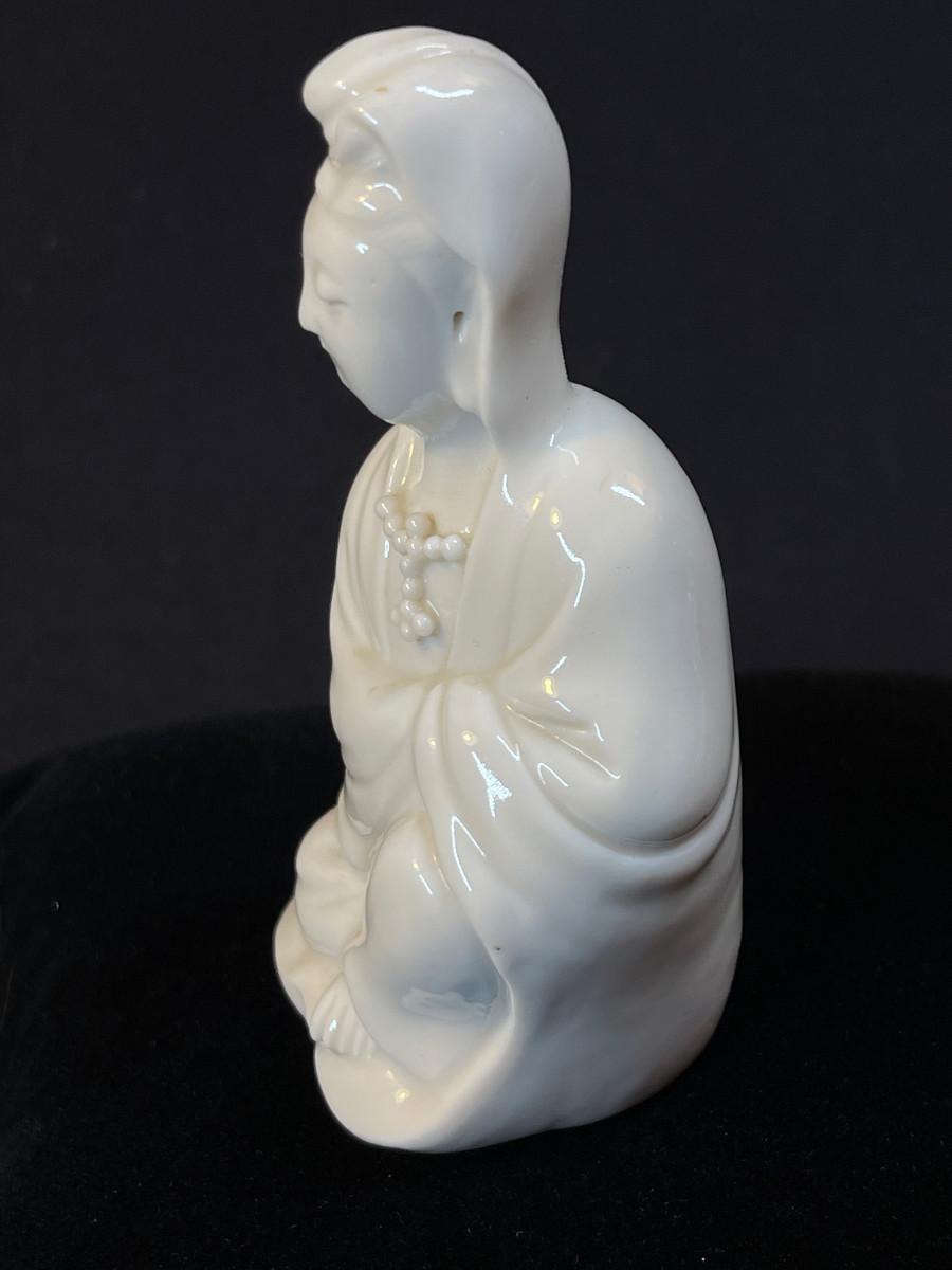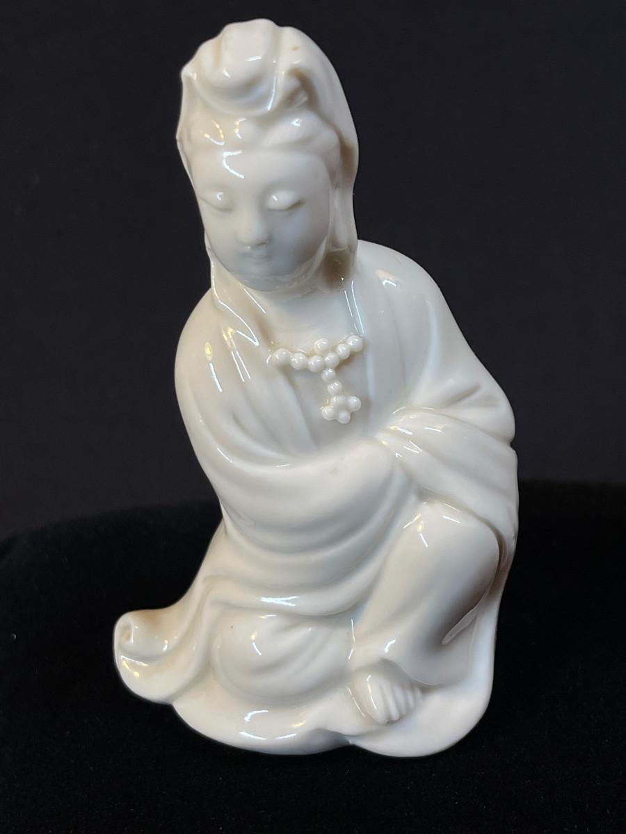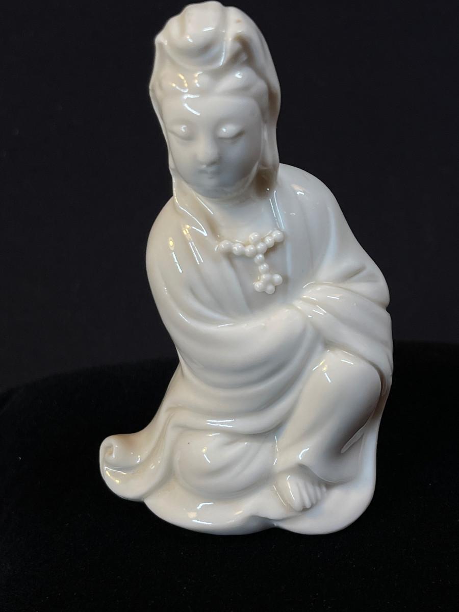 The subject item is a small seated Blanc de Chine Quan Yin figure posed seated with on knee tucked under her wrapped robe and wearing an elaborated necklace. Perfect condition.