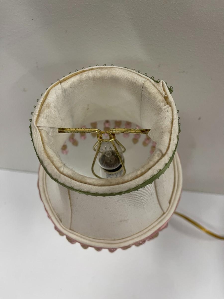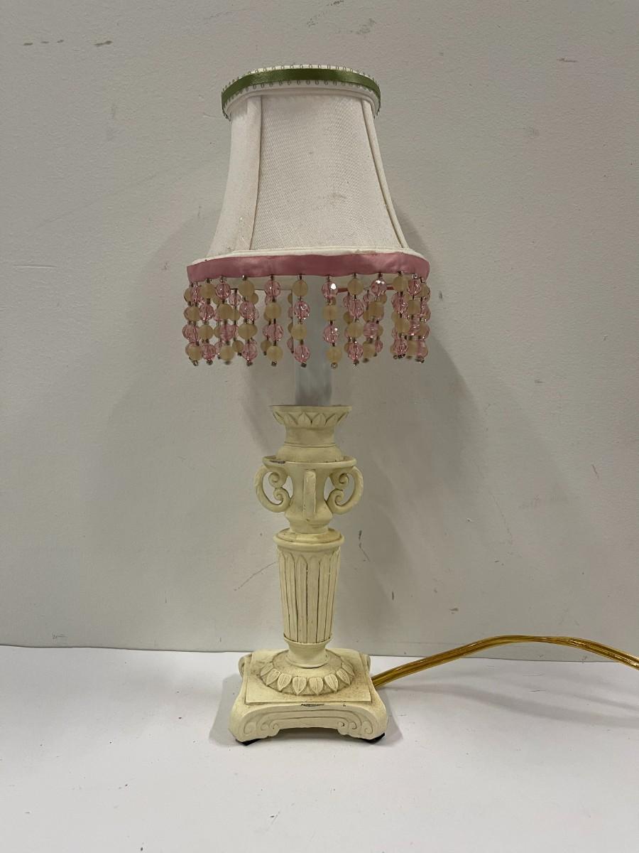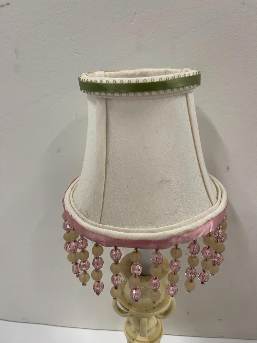Lamp is painted, antiqued white resin base with fabric shade with hanging beads. Smaller size. Good condition. 13 1/4" high.