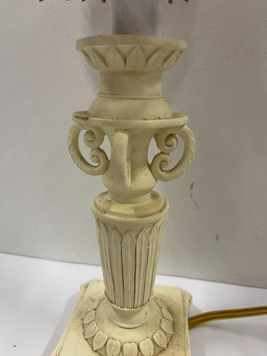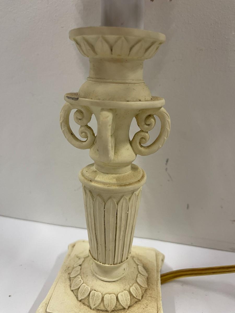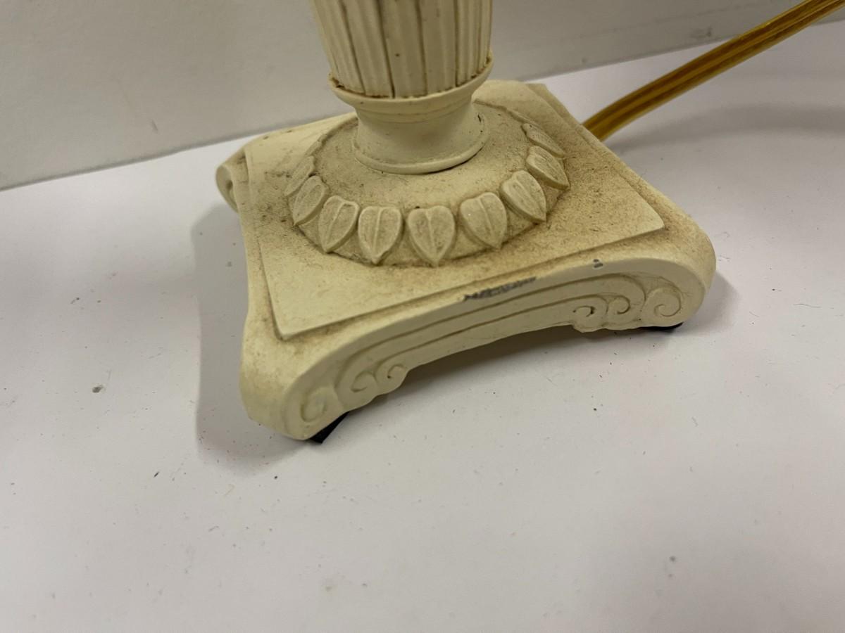 Lamp is painted, antiqued white resin base with fabric shade with hanging beads. Smaller size. Good condition. 13 1/4" high.