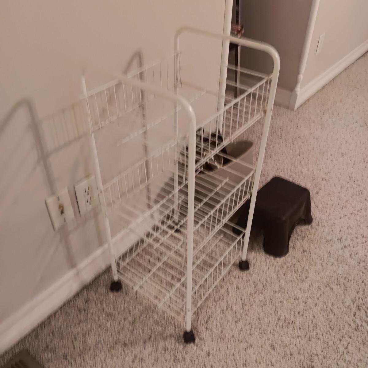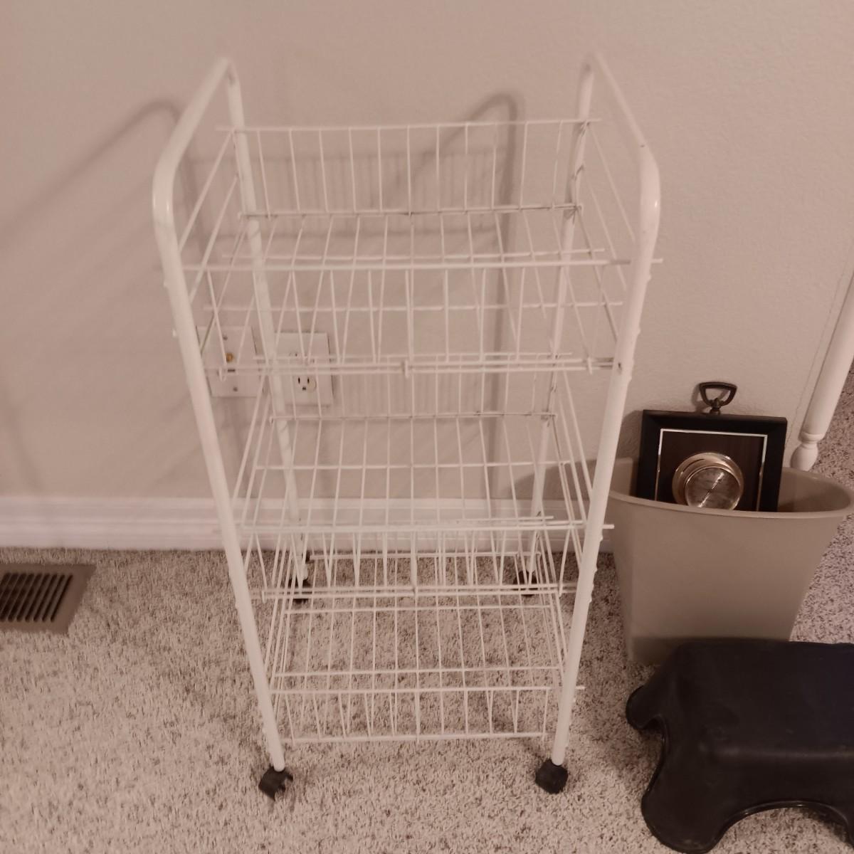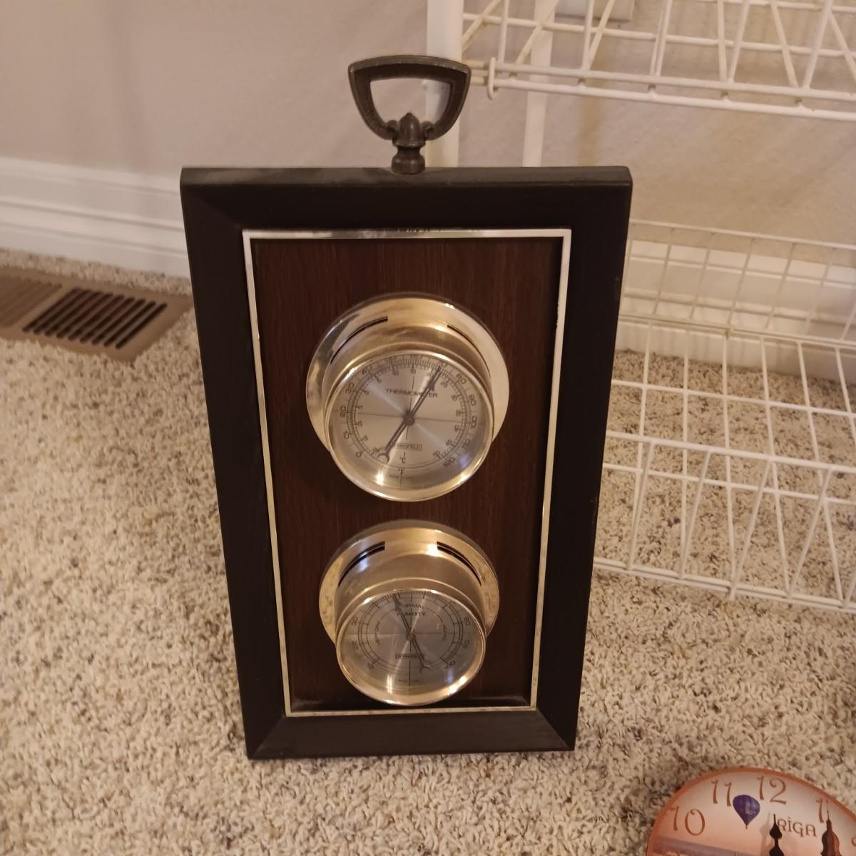 SMALL SHELF ON CASTERS, BAROMETER, CLOCK, TRASH CAN, STEP STOOL & SUNGLASSES