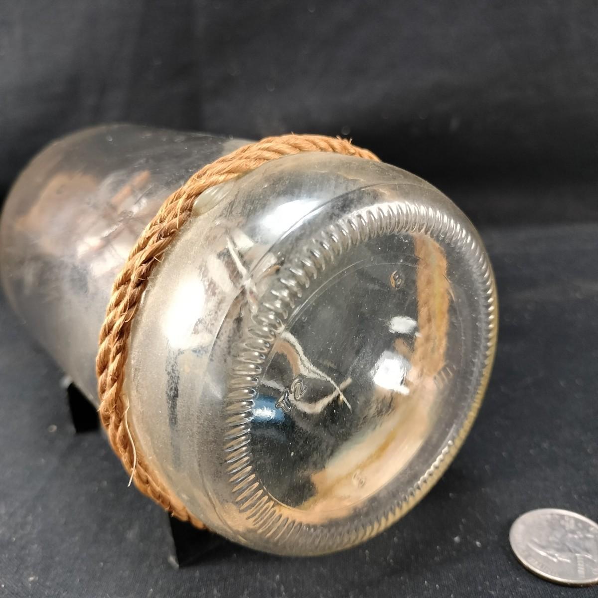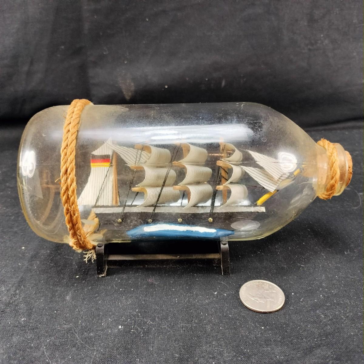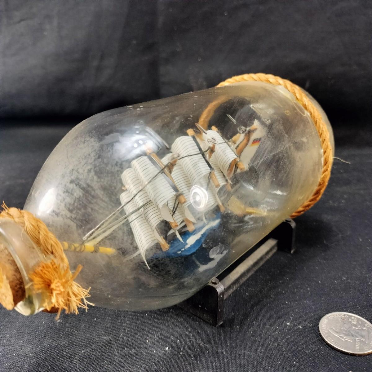 This auction lot is for a Small Ship in a Bottle. This is a interesting example of a small ship in a bottle. Ship unknown, this item appears to have been constructed by cutting the bottle and inserting a completed ship. It measures about 7.5-inches long X 4-inches tall with base.