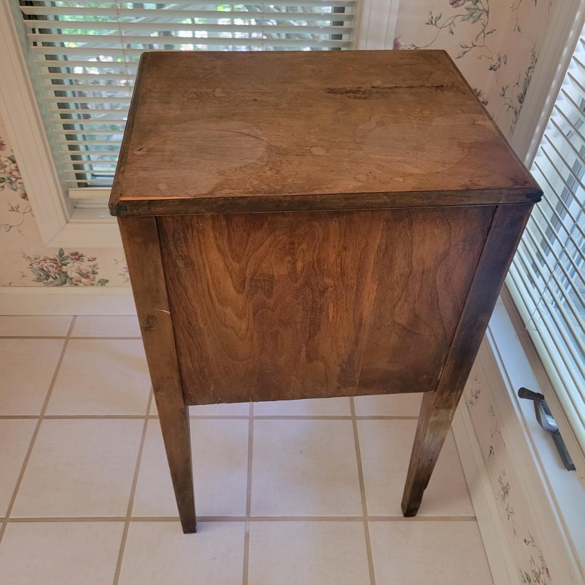 A small wood side table with an exterior veneer and a dark wood stain. It features one large cabinet with a brass opener and carver details. It measures approximately 17" x 14" x 28"H. There are some blemishes and one side is missing most of its veneer. Local pickup only