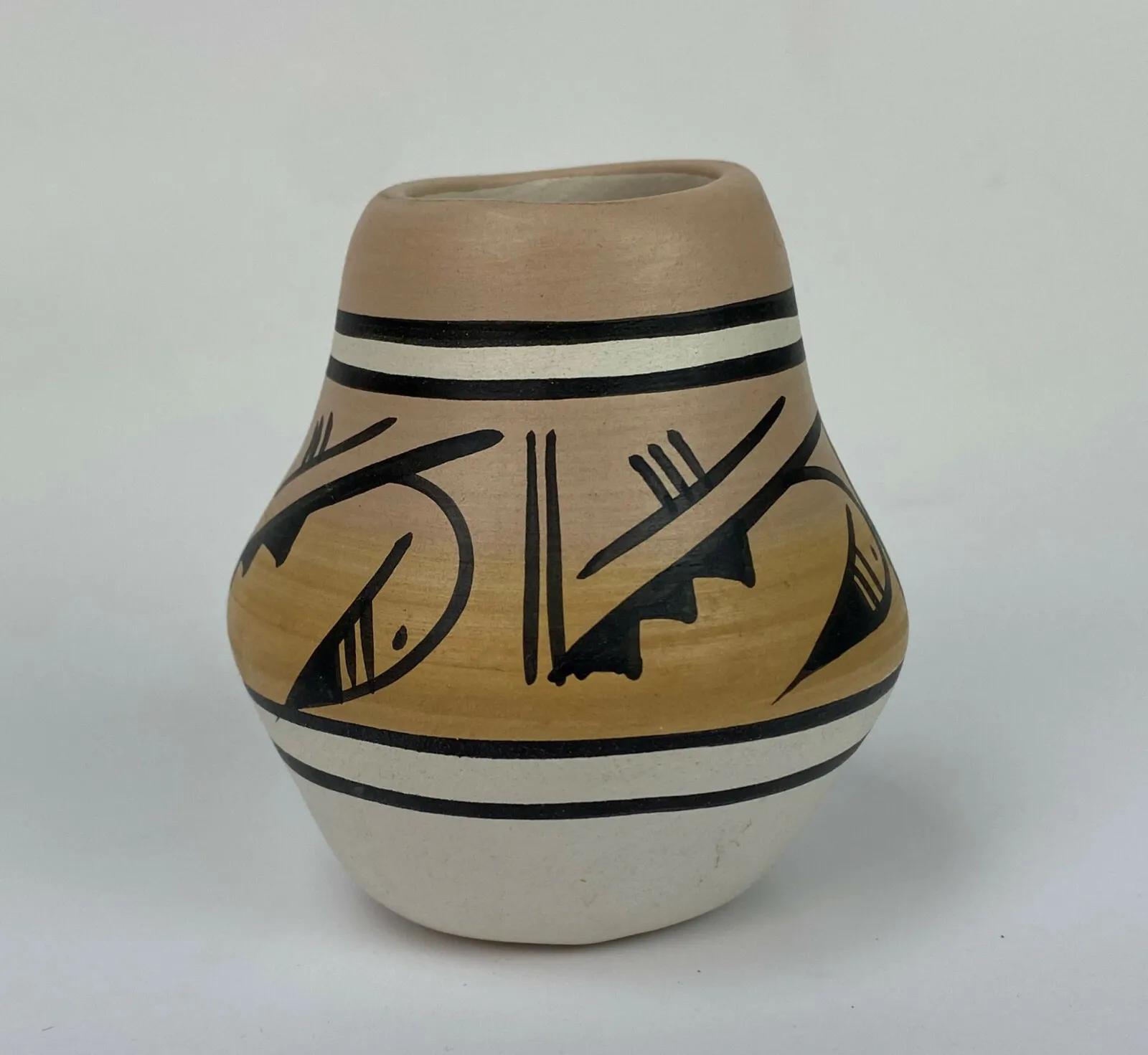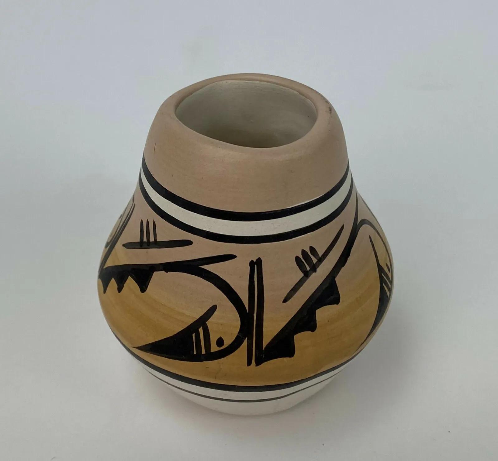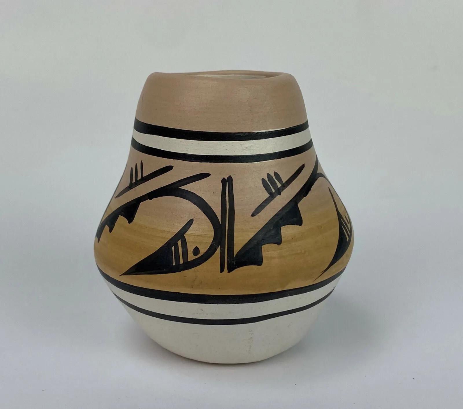 small, hand-thrown, hand-painted pot from a Navajo (Diné) artisan dated 1988...Signed R. BEGAY DINEH 88...Just 2 7/8" high by 2 5/8" wide...No chips or cracks...Excellent condition on this Southwestern pottery.