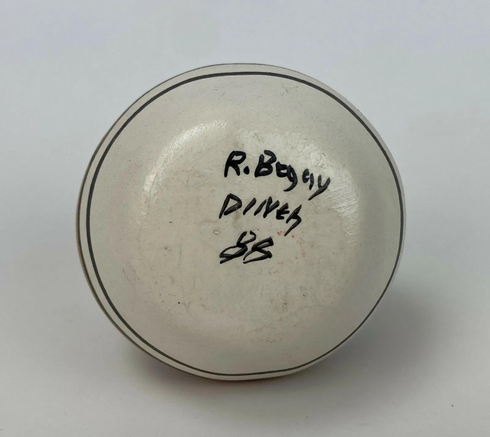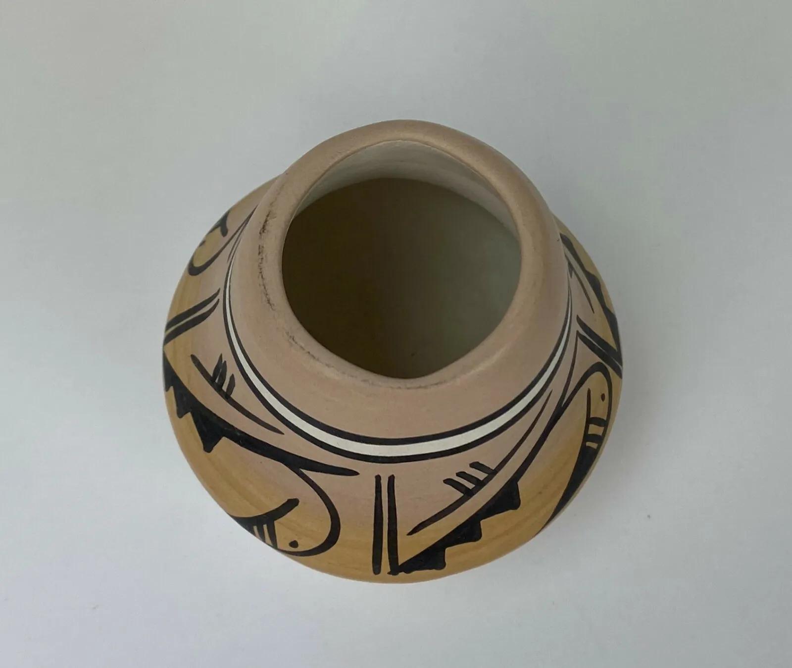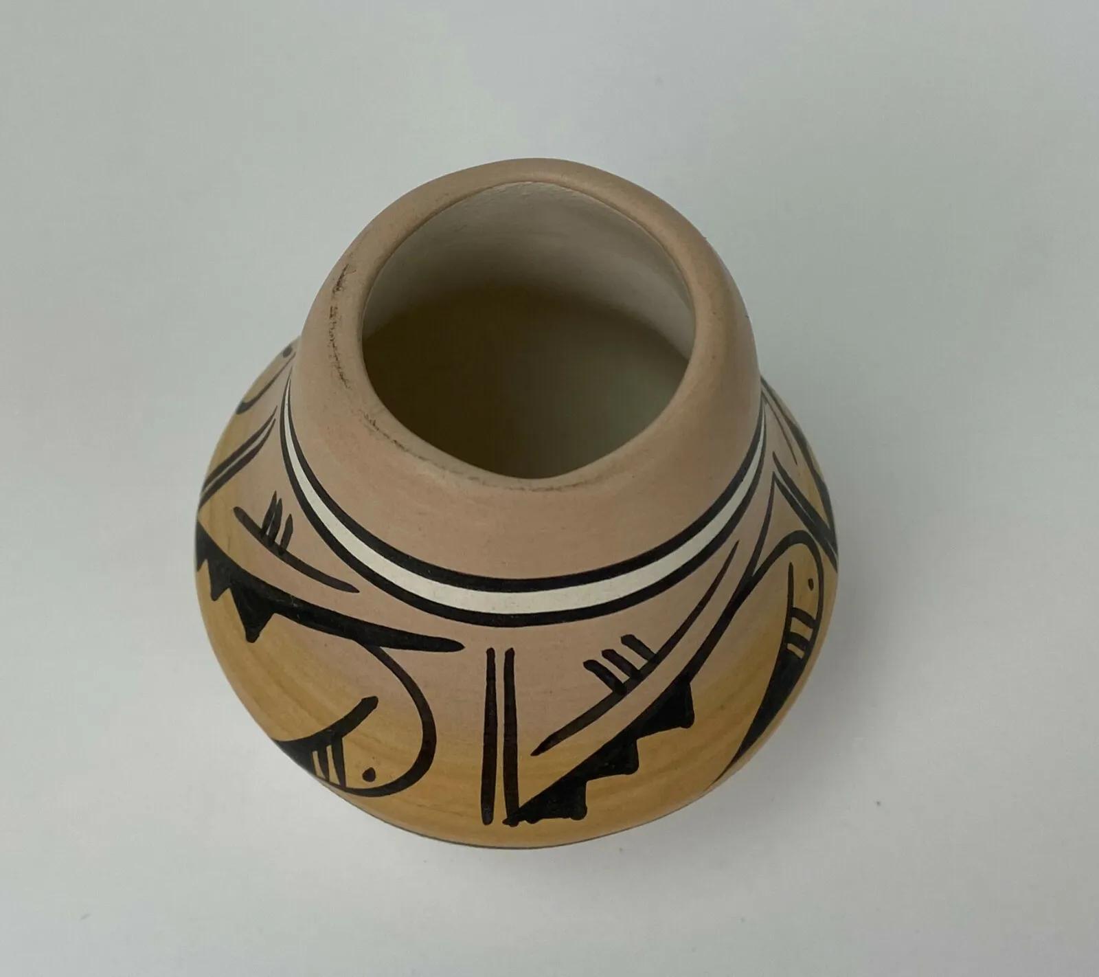 small, hand-thrown, hand-painted pot from a Navajo (Diné) artisan dated 1988...Signed R. BEGAY DINEH 88...Just 2 7/8" high by 2 5/8" wide...No chips or cracks...Excellent condition on this Southwestern pottery.