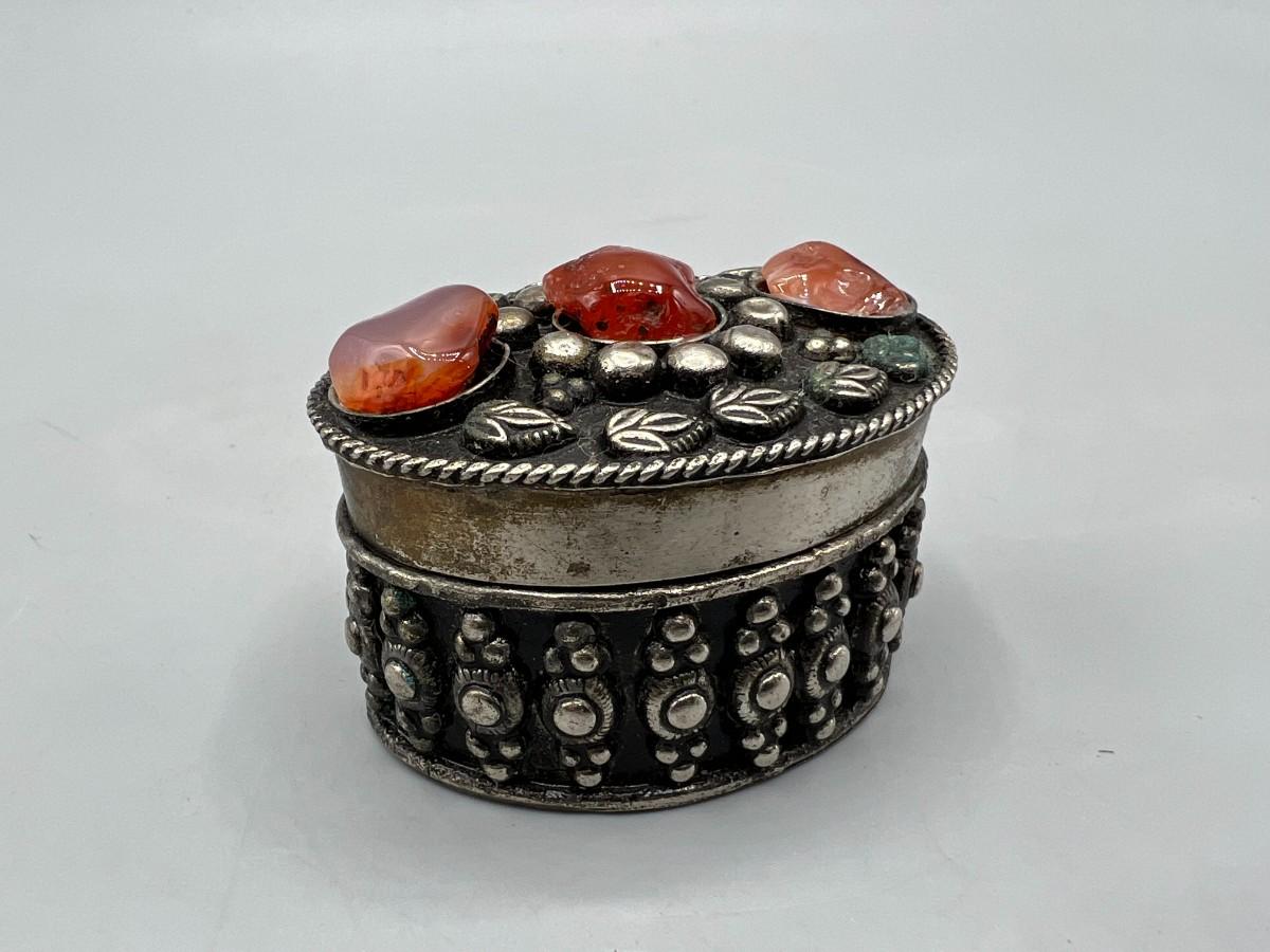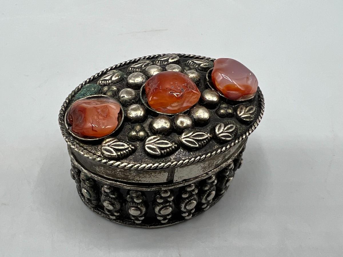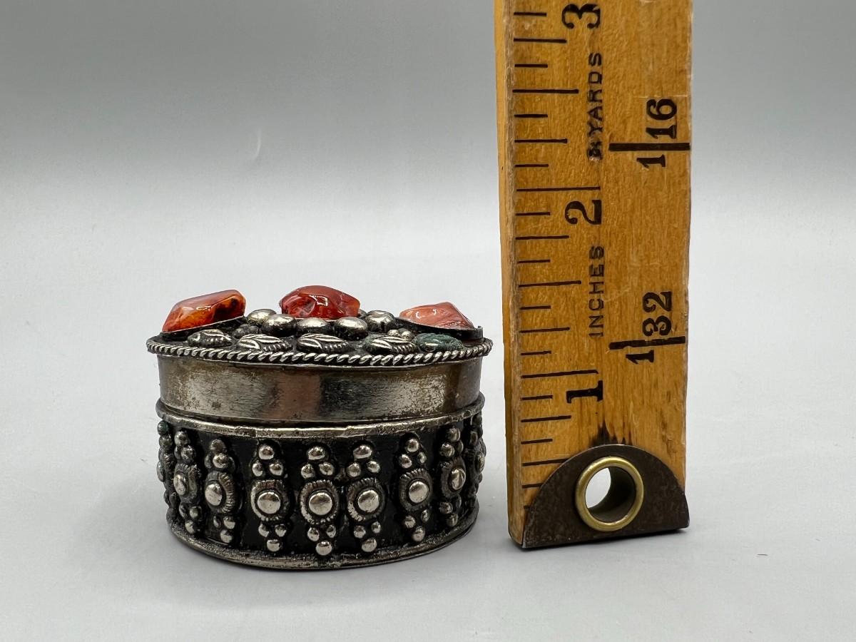 Small Silver Plate Lidded Trinket Box with Polished Agate Accents. Three polished red agate stones on top. Blue velvet lined. Under 2" size.
