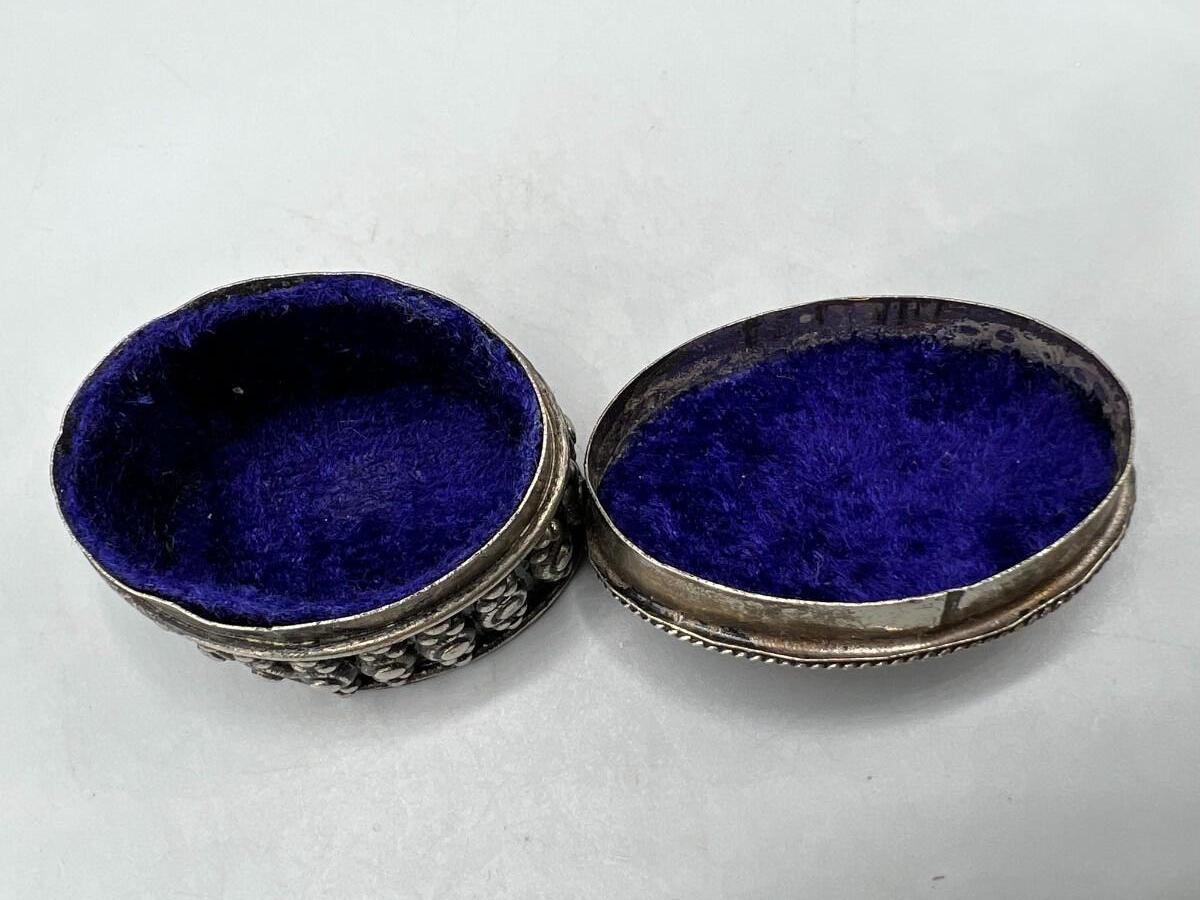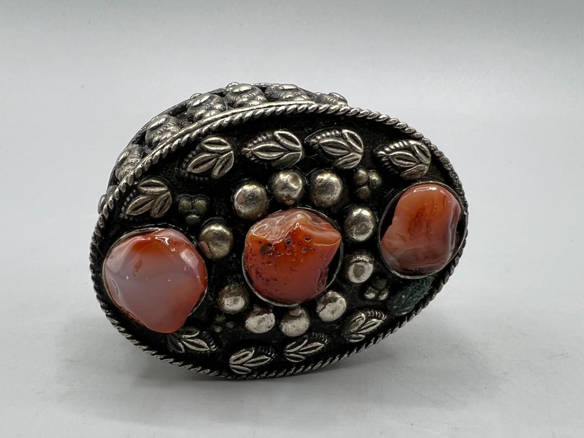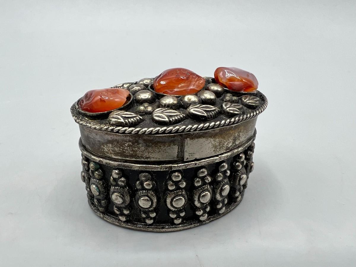 Small Silver Plate Lidded Trinket Box with Polished Agate Accents. Three polished red agate stones on top. Blue velvet lined. Under 2" size.