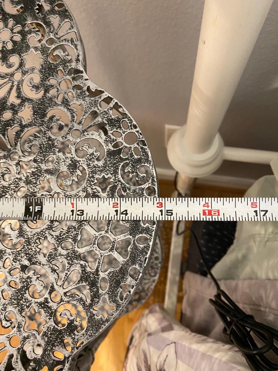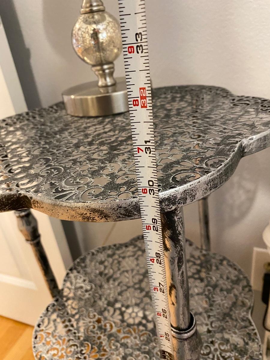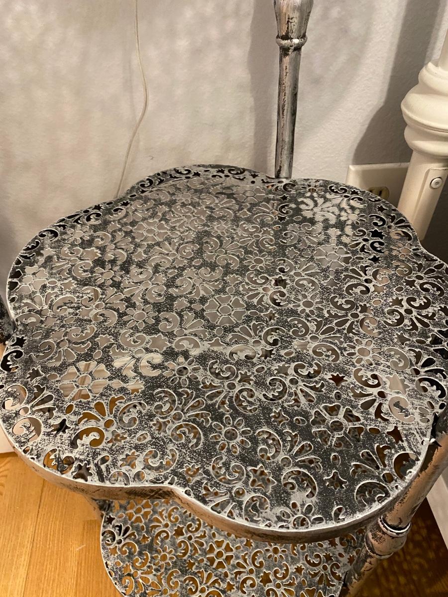 Small silver tone metal table. Tiered with 3 surfaces for displaying and setting items. Punched out pattern shelf in the shape of a flower. Stands almost 30" tall and is roughly 15" wide. In good condition.