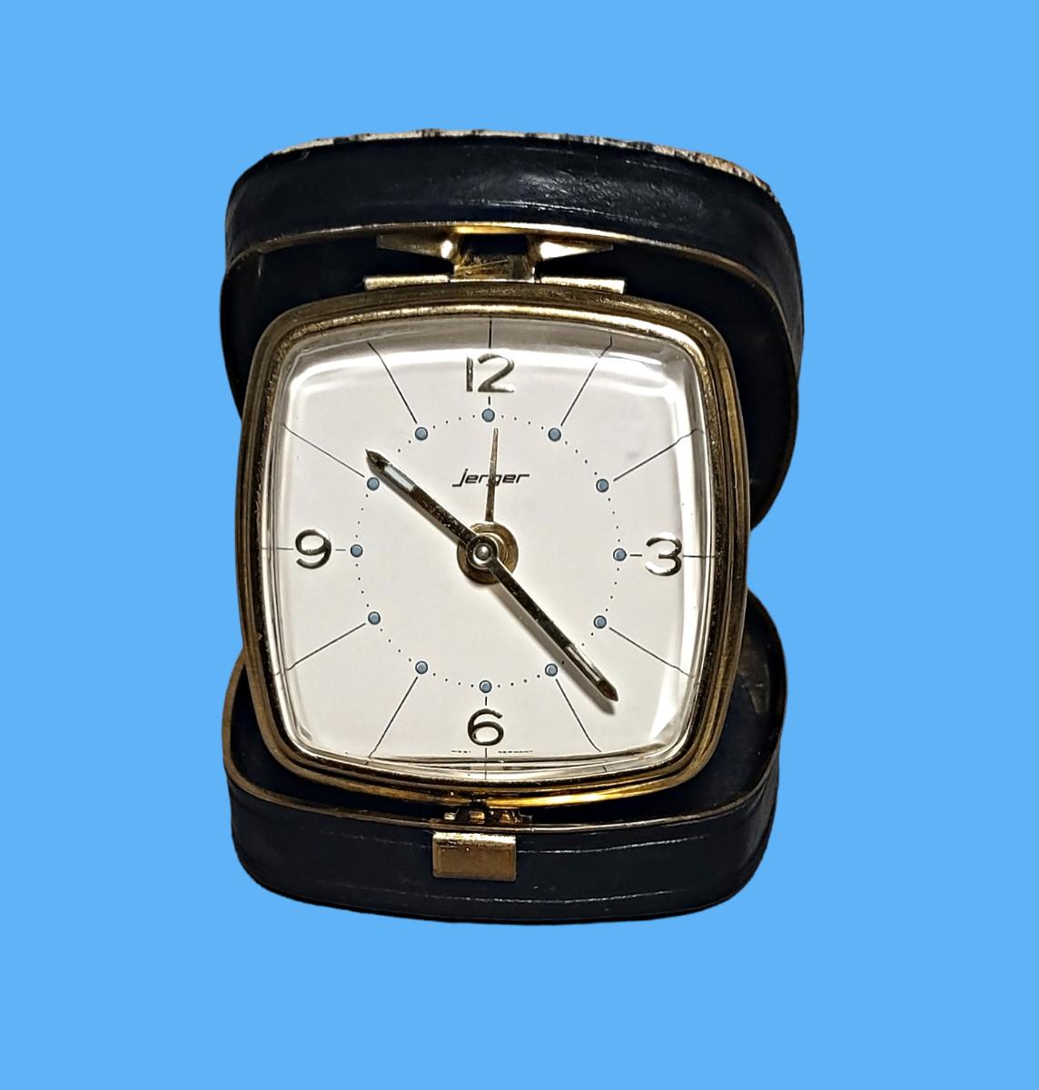2. Vintage Jerger Folding Travel Alarm Clock - 2 Jewels, Made in germany, (Some scuffs on bottom of case; please see photo)