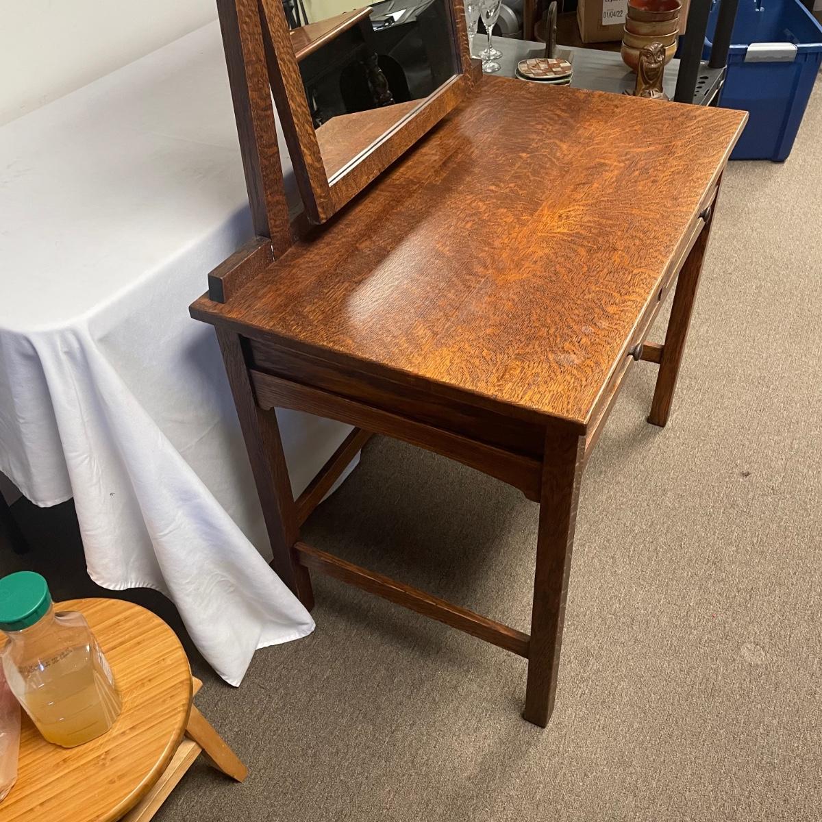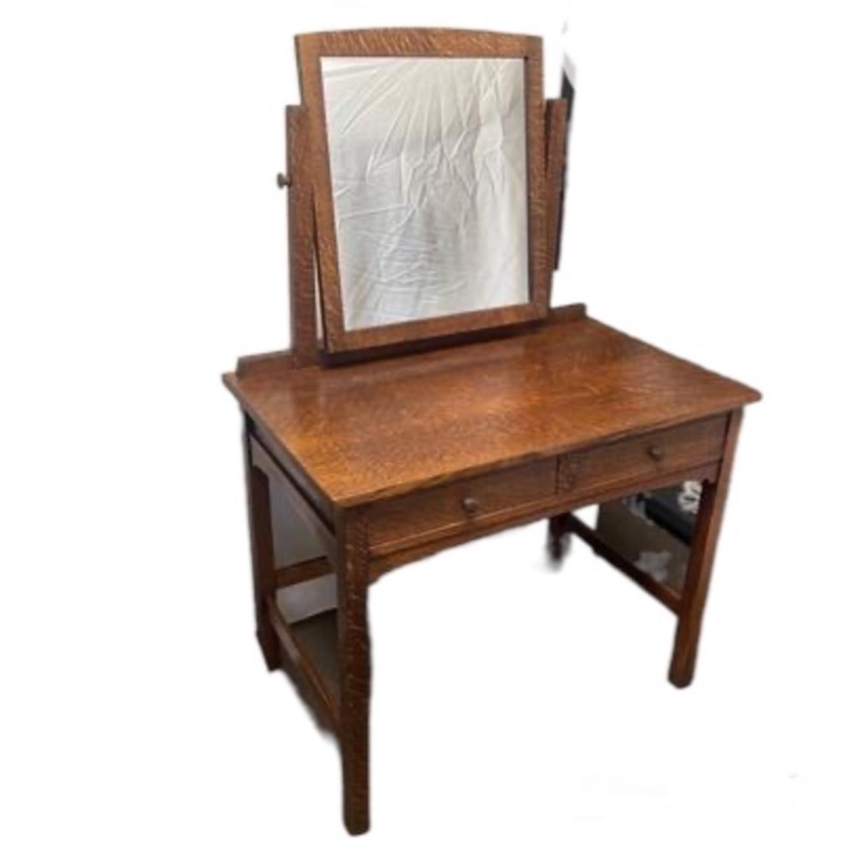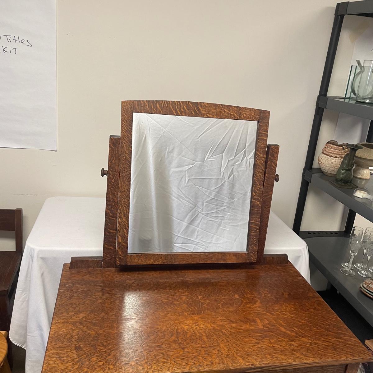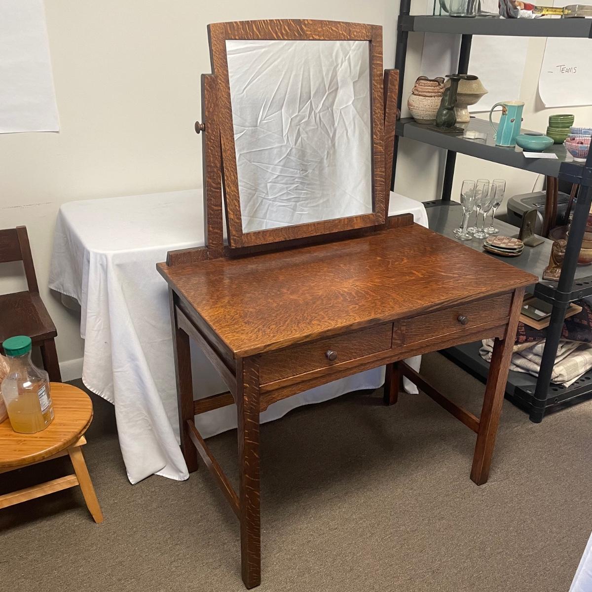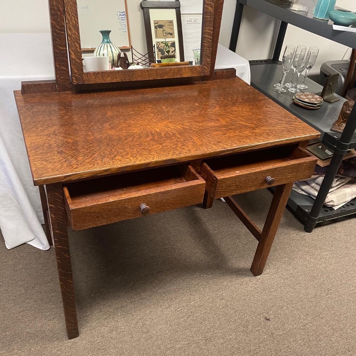This beautifully crafted wood vanity table has two dovetailed drawers and a mirror that is slotted onto the table with pegs. The family says it is made by the brothers of Stickley. Leopold and John J. Stickley. There are no manufacture marks found so we can not confirm. Piece is in excellent condition.