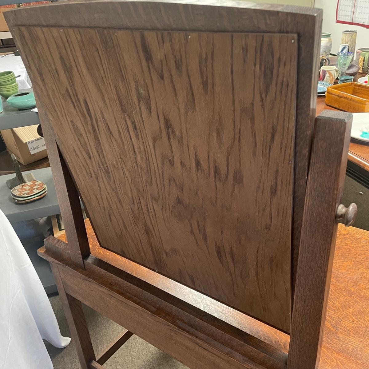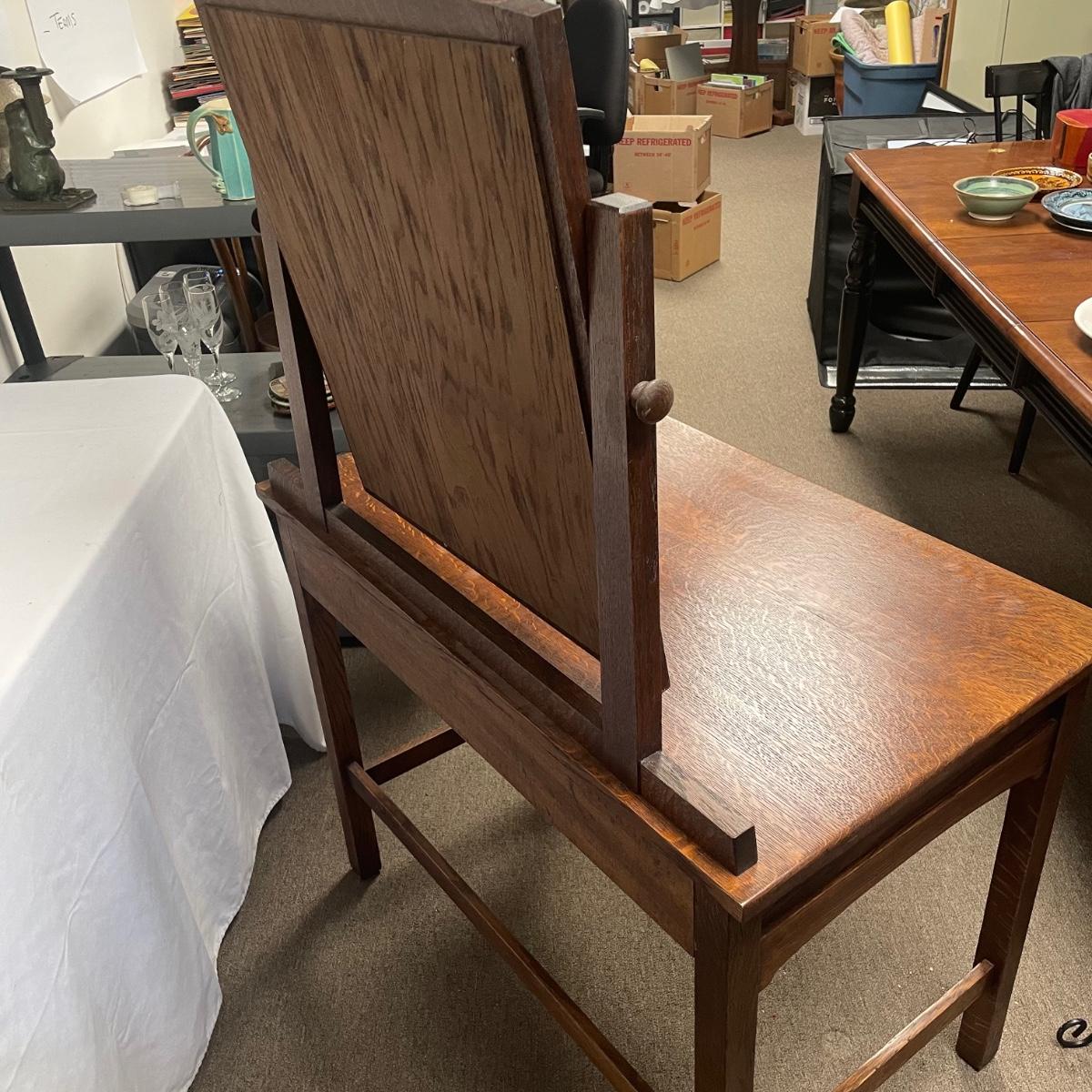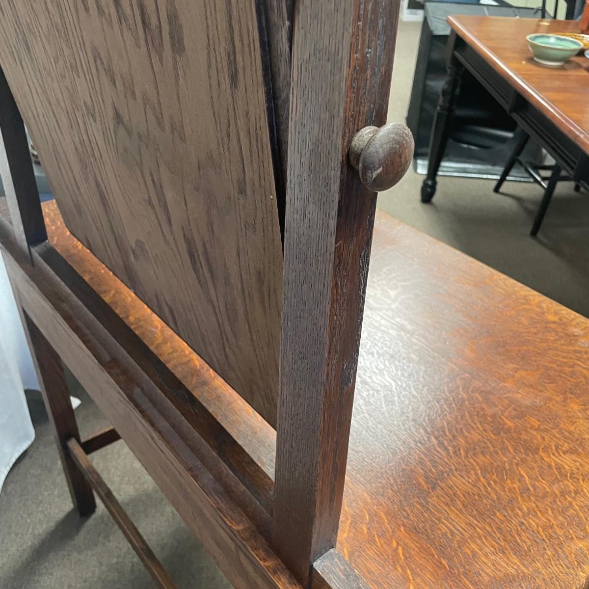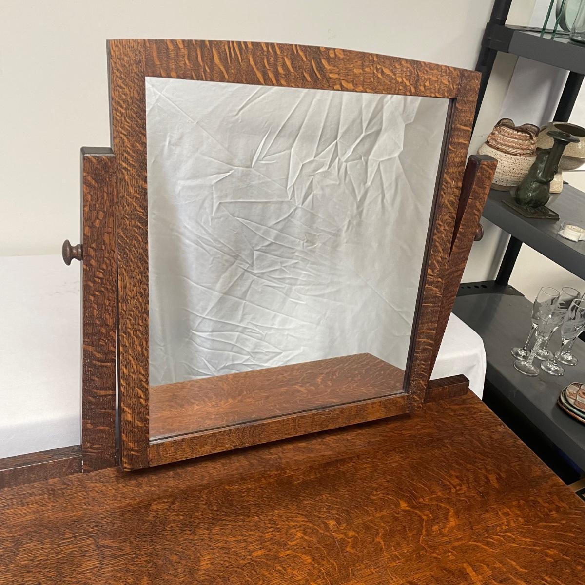 This beautifully crafted wood vanity table has two dovetailed drawers and a mirror that is slotted onto the table with pegs. The family says it is made by the brothers of Stickley. Leopold and John J. Stickley. There are no manufacture marks found so we can not confirm. Piece is in excellent condition.