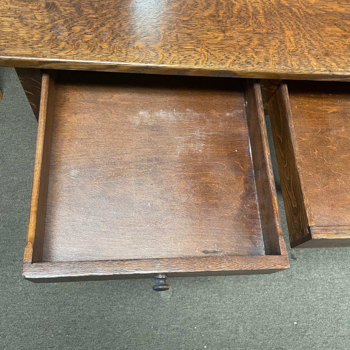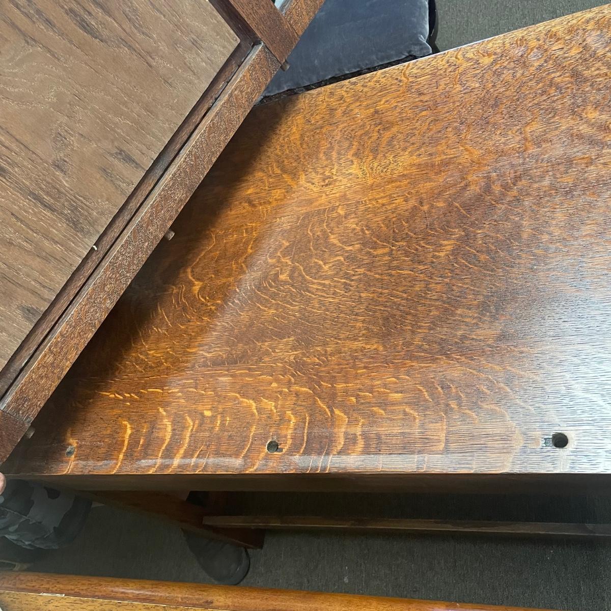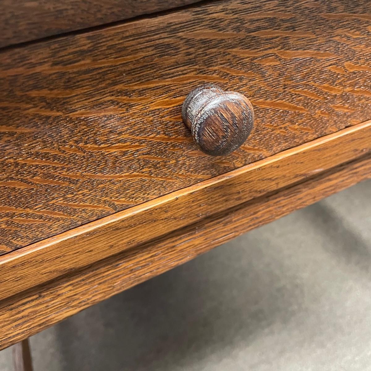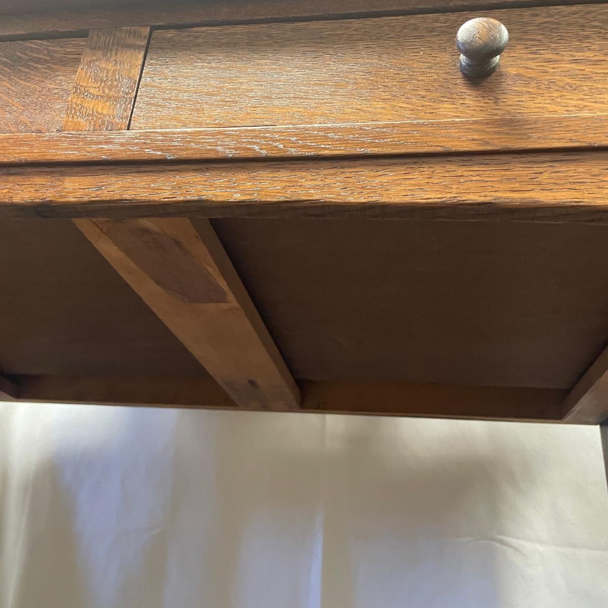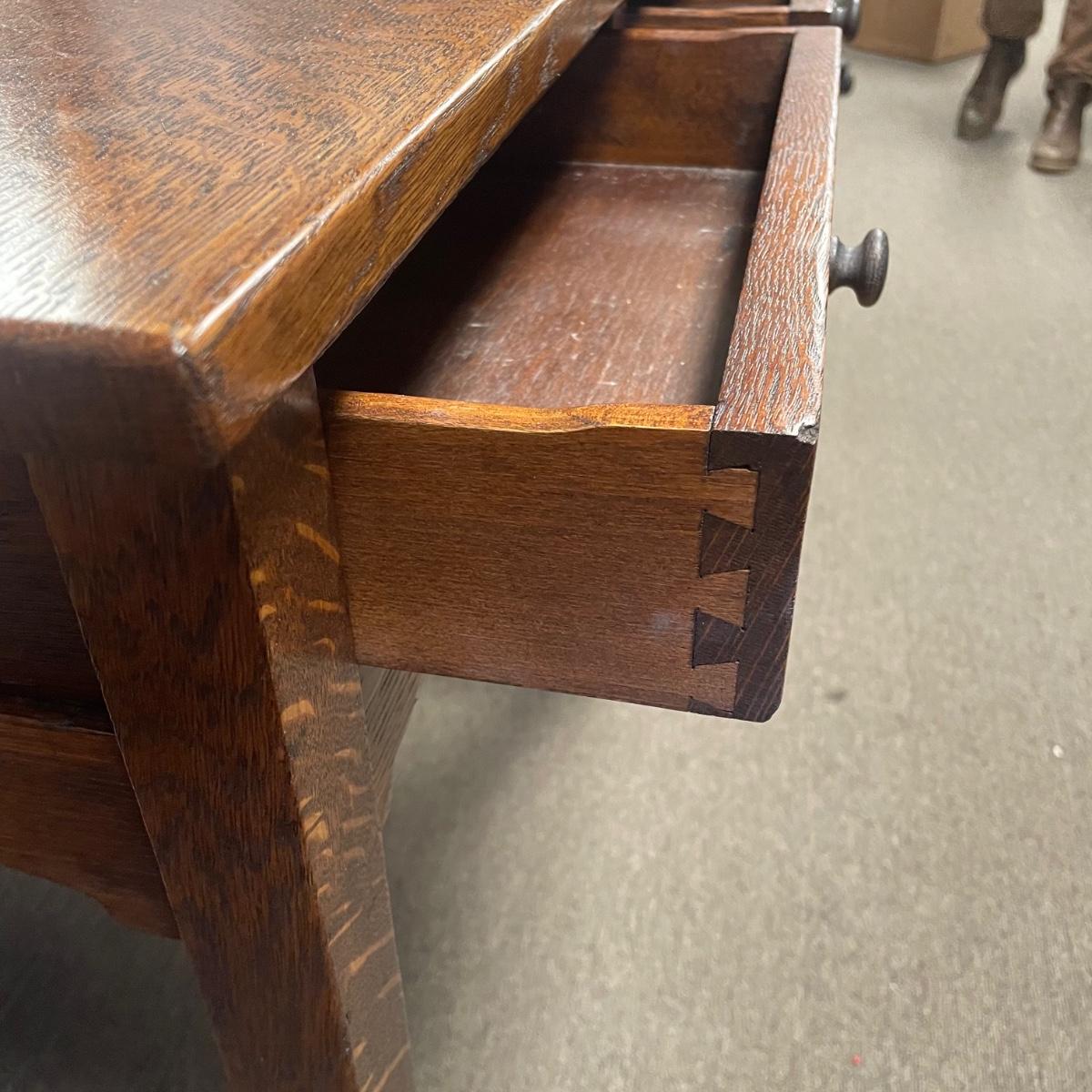 This beautifully crafted wood vanity table has two dovetailed drawers and a mirror that is slotted onto the table with pegs. The family says it is made by the brothers of Stickley. Leopold and John J. Stickley. There are no manufacture marks found so we can not confirm. Piece is in excellent condition.