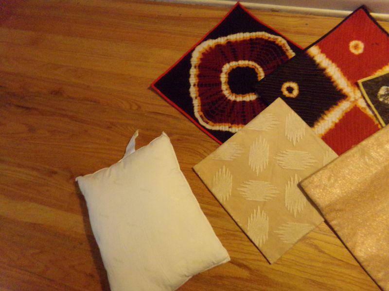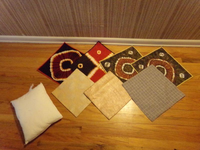 7 SMALL SQUARE THROW PILLOWCASES AND 1 PILLOW.